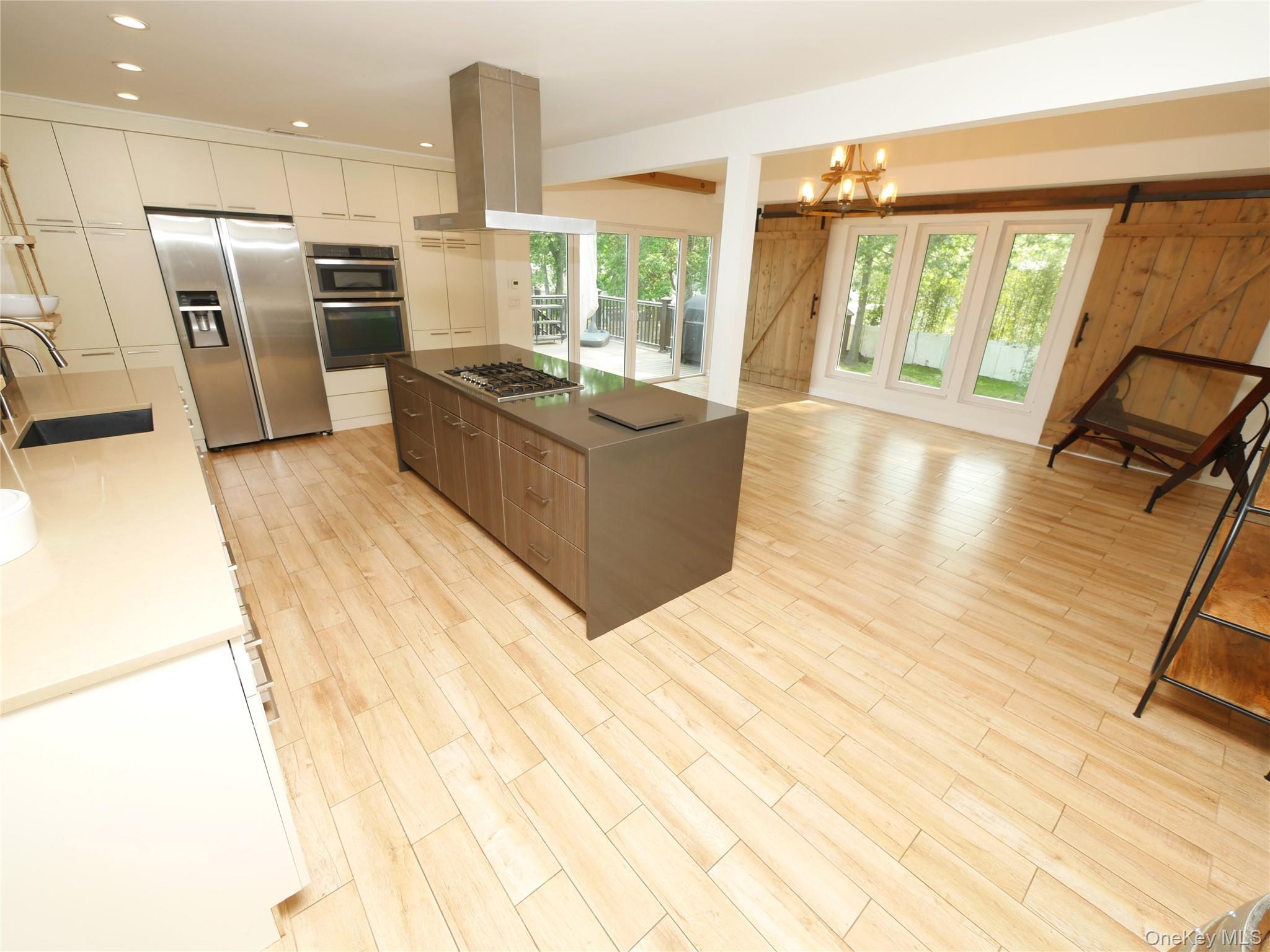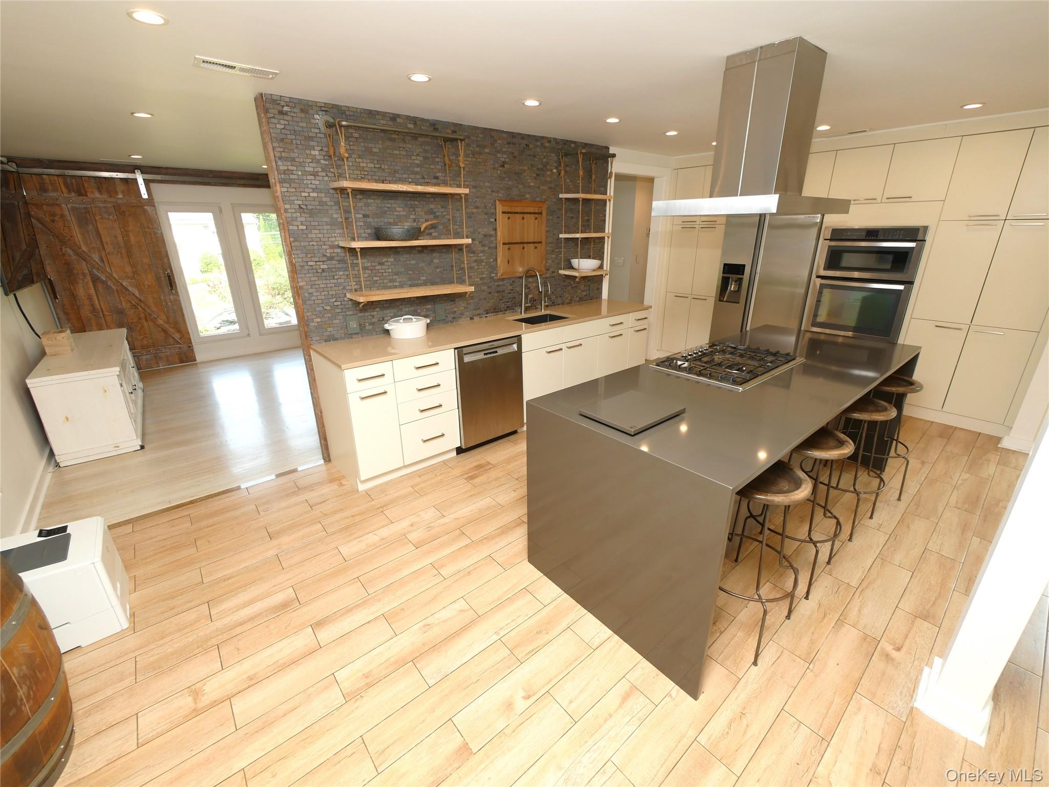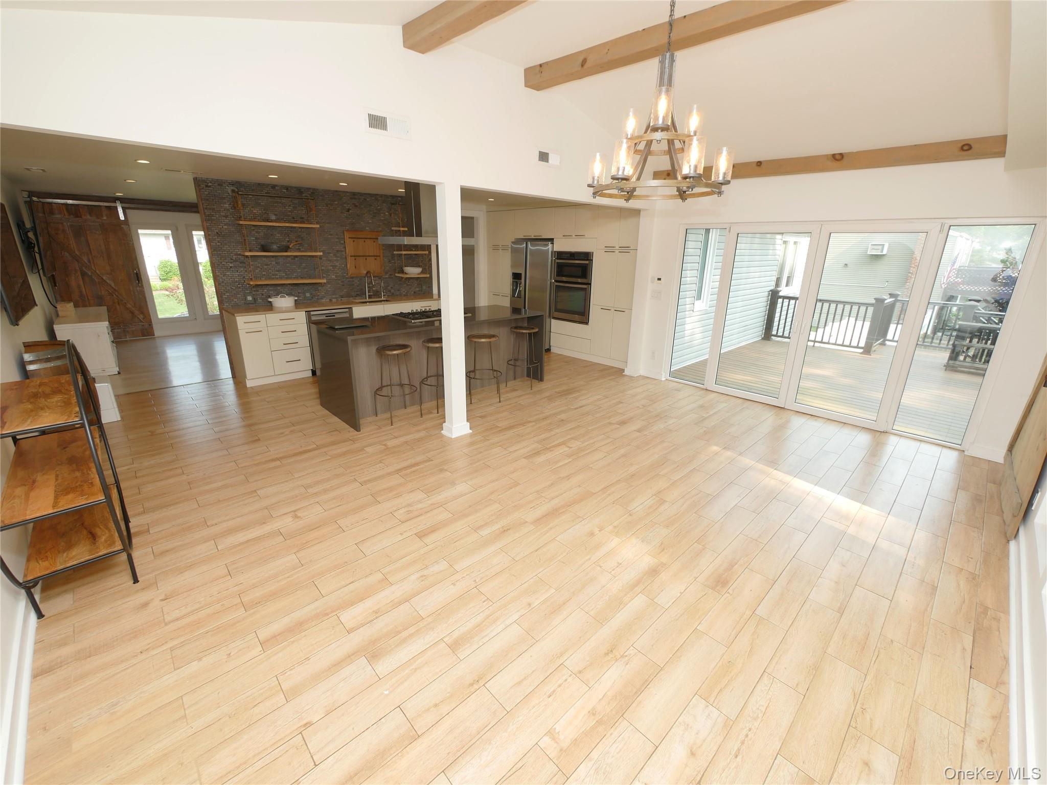 Welcome to this extraordinary Expanded Hi-Ranch, offering over 2, 700 square feet of thoughtfully designed living space. This home features 10 generously sized Rooms, offers 5 Bedrooms and 3 Full Bathrooms. The home's layout is ideal for multi-generational living or accommodating guests, with a design that maintains privacy and comfort. Whether you're seeking additional income potential with proper permits, or a private space for your loved ones, this setup caters to a variety of needs. At the heart of the home is the expanded Eat-in Kitchen, a true chef's and entertainer's dream. Soaring ceilings and oversized windows flood the kitchen space with natural light, highlighting the custom barn door and center island with additional seating. The Kitchen is adorned with gorgeous quartz countertops, abundant cabinetry, a gas cooktop, and sleek stainless-steel appliances, combining functionality with modern elegance. The ground level of this expansive home offers exceptional flexibility, featuring two distinct living areas designed to accommodate various lifestyle needs. On one side, discover a comfortable bedroom, a spacious Den, a fully equipped Summer Kitchen, and a Full Bathroom complete with a stackable washer and dryer, an independent exterior entrance ensures privacy. Continuing downstairs, you'll find a second laundry area and a versatile room that can serve as a 5th Bedroom, Media Room, or Home Office. This space boasts an oversized closet and an impressive Full Bathroom featuring a dual vanity and a luxurious walk-in shower adorned with cultured stone. Other features include gas heating with an updated Bosch heating system offering on demand hot water, Trane central air system, energy efficient solar panels (NOT LEASED), updated premium windows, 200 amp electric, recessed lighting, radiant heat in select rooms. Exterior features include an attached deck adjacent to the Kitchen with composite decking, sprinklers, a bluestone patio, firepit, shed, outdoor lighting, fully fenced yard. This home exudes timeless charm, seamlessly blending rustic farmhouse elements with contemporary finishes to create a warm and inviting atmosphere.