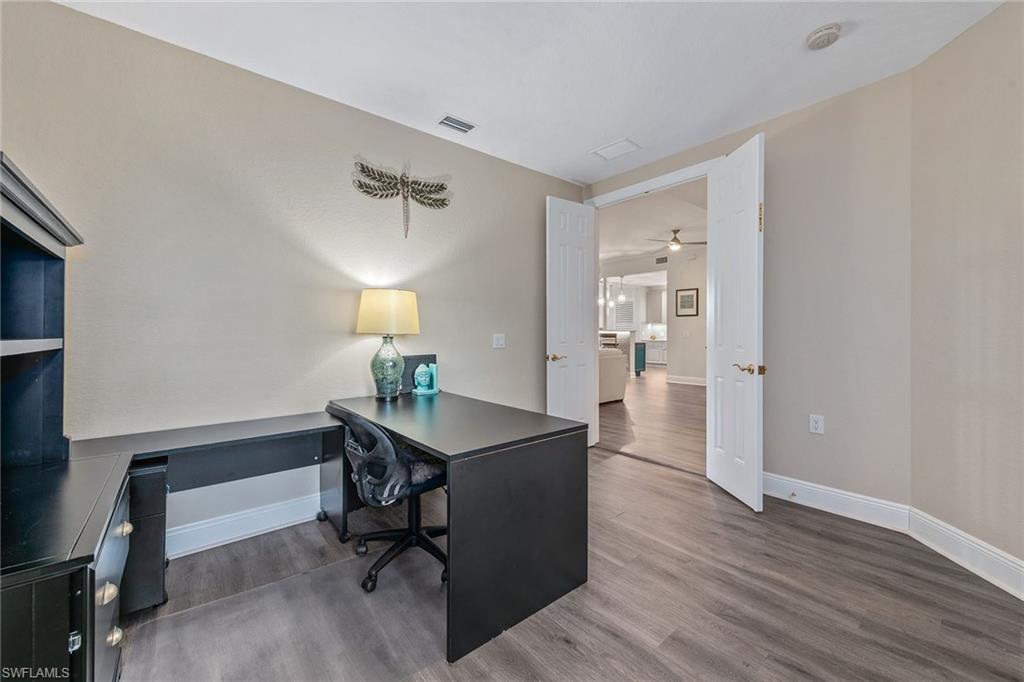 This beautifully furnished and exquisitely updated first-floor residence in desirable Cherry Oaks at sought-after Fiddler’s Creek offers a blend of comfort, style and southern exposure with tranquil golf course and water views from the screened lanai. The water feature sits directly in front of the condominium, creating a serene backdrop that enhances the home’s private and peaceful atmosphere. Designed for effortless luxury living, this spacious home features three bedrooms plus a den, two full baths and a two-car garage, providing functionality and elegance in every detail. Inside, the open-concept layout is highlighted by recessed lighting, crown molding, ceiling fans and plantation shutters throughout. The interior is finished with luxury vinyl plank flooring, while the screened lanai features durable porcelain tile. The open kitchen is a showpiece with light cabinetry, under-cabinet lighting, quartz countertops, a porcelain tile backsplash and upgraded Samsung stainless steel appliances with enhanced features, including a five-burner natural gas cooktop, a divided oven that allows two temperature zones, and a refrigerator with a convertible bottom freezer that can function as either a refrigerator or freezer. A breakfast bar and a pantry with custom wood shelving complete this beautifully designed culinary space. The adjacent living room, complete with a three-panel glass slider, opens directly to the lanai, offering seamless indoor-outdoor living and an inviting setting for relaxation and entertaining. The primary bedroom suite is a private retreat featuring dual closets with wood slatted shelving. The renovated ensuite bath offers dual porcelain vanities and a walk-in shower with cut pebble flooring and floor-to-ceiling tile walls. Two guest bedrooms each include well-appointed closets, while the updated guest bath impresses with an accent wall, quartz vanity, and walk-in shower with a glass enclosure and floor-to-ceiling tile walls. A separate laundry room with a full-size washer and dryer and a utility sink adds convenience. Additional highlights include storm shutters, a Rheem HVAC system and a Noritz tankless natural gas water heater. Residents of Fiddler’s Creek enjoy access to a spectacular 54, 000-square-foot clubhouse offering casual and fine dining, a resort-style multi-pool swimming complex with waterfalls, slides, and whirlpool, six Har-Tru lighted tennis courts, new pickleball courts, a bocce ball court, and a state-of-the-art fitness center with classes and trainers, along with full spa services. A vibrant year-round social calendar and 24-hour manned gate with roaming security patrol further enhance this resort-style community, providing an unparalleled lifestyle in the heart of Naples. Optional golf course memberships are available at the recently renovated, award-winning Arthur Hills golf course and the new golf clubhouse, with optional beach and marina memberships also offered.