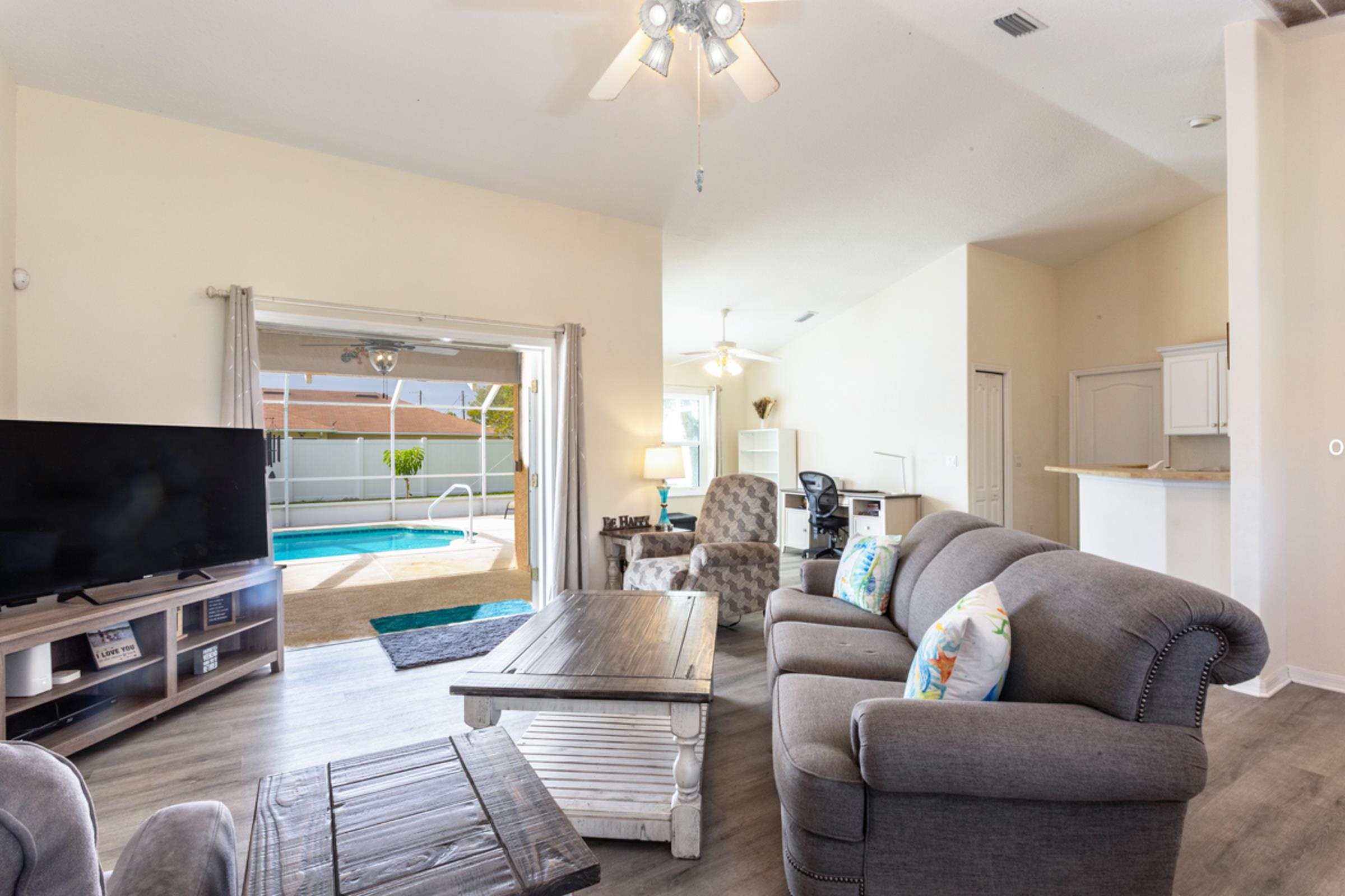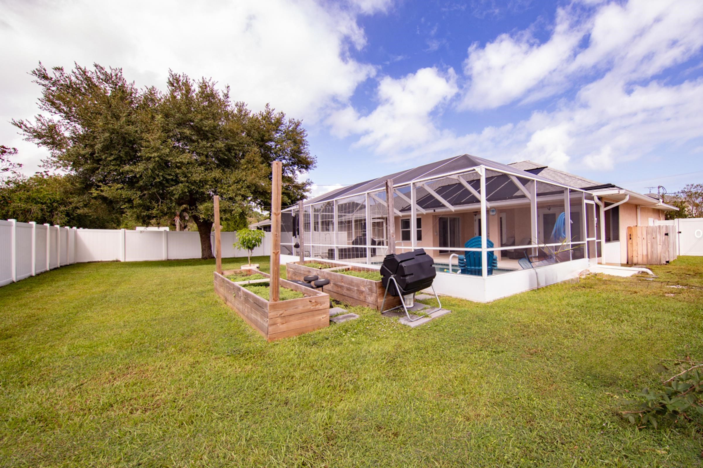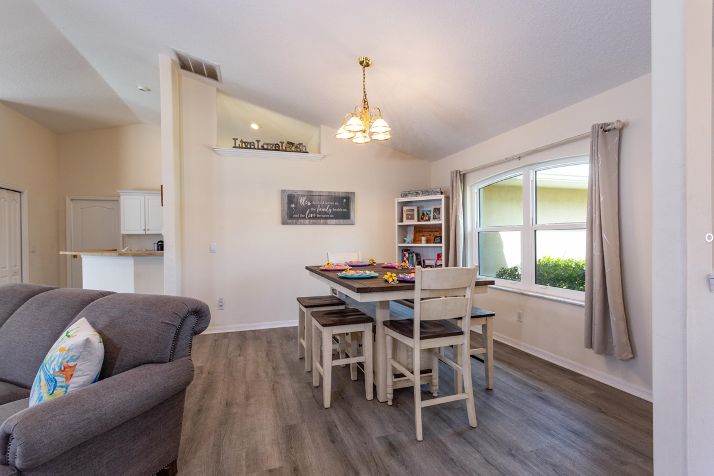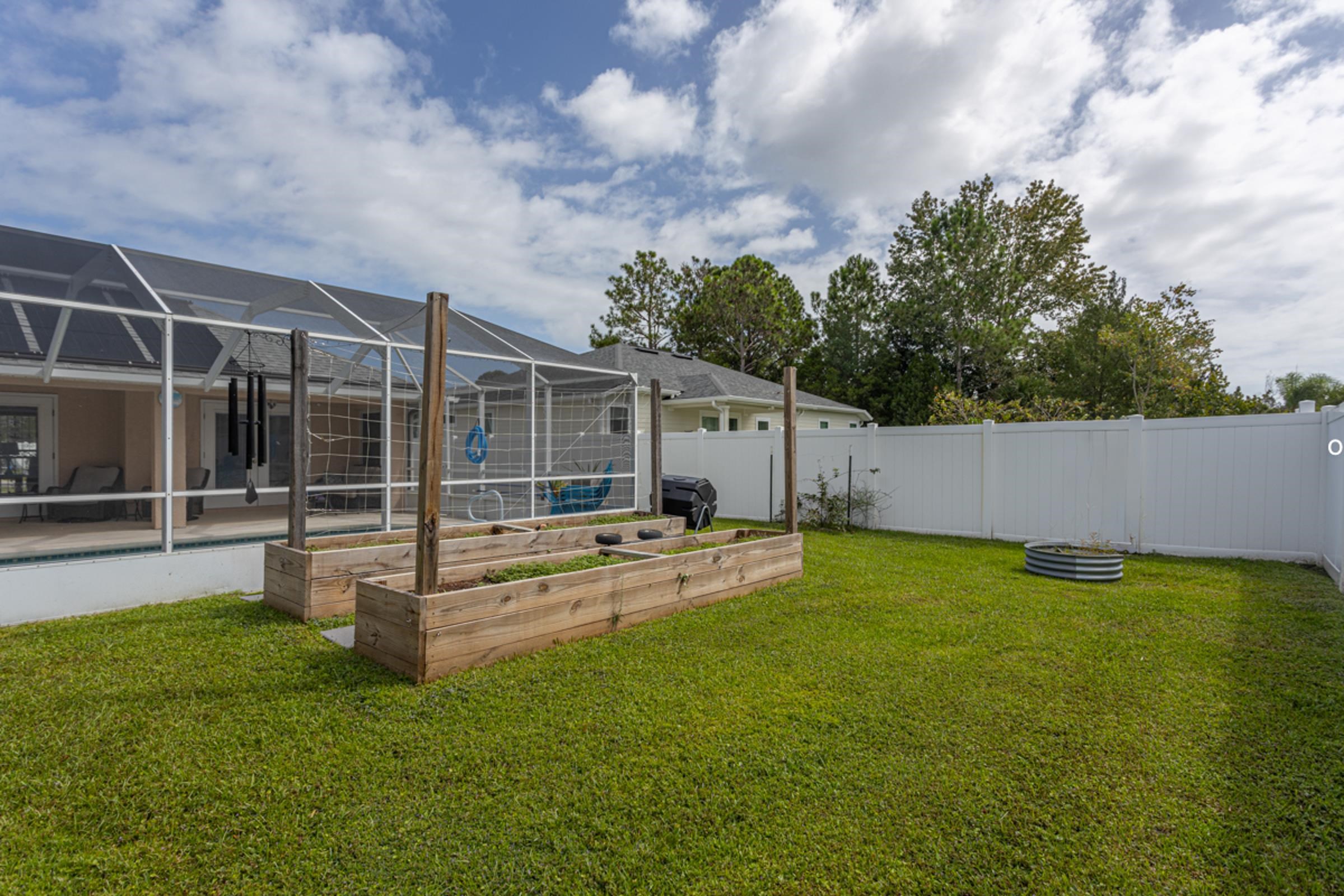 This special Indian Trails pool home is where your homeownership dreams come true! Ideally located at the very first exist south of St. Augustine from I-95, you’ll enjoy easy access to shopping, schools, and all the area has to offer. Step inside and you’ll find a thoughtful, clean and polished split floor plan with elegant details throughout. The spacious master suite features tray ceilings, crown molding, a luxurious garden bath, and blinds between the glass French doors that open directly to the pool. On the opposite side of the house, two guest bedrooms share a full bath, offering comfort and privacy for family or visitors. Enjoy seamless indoor-outdoor living with multiple access points to the fully screened pool and patio area, complete with a large deck and fully private, vinyl-fenced backyard. A perfectly sized oak tree adds just the right amount of shade, while two raised vegetable beds make it easy to garden at home. The living room features French doors, while the formal dining room (easily converted into a home office) also has direct pool access with its own set of sliding doors. The kitchen is well-appointed with crown molding, a breakfast bar, and a fully built-out pantry. Additional conveniences include 3 pocket doors to create flexible living spaces, indoor laundry with washer/dryer, and a 2-car garage with an upgraded door and utility sink. Updates: Roof (2022), Luxury Vinyl Plank Flooring throughout (2024), Low-Impact Windows (2023), Gutters (2022), Refrigerator & Disposal (2022), A/C (2017/2018). Pool: Solar panels (2023), new filter & chlorine dispenser (2023), inspection (2022), pump gate (2024) pool pump (2025), childproofing included. The pool is just the right size to manage without a service! Features in this house never end -- Smart camera front door entry, remote garage door control, garage door screen doors, new outdoor patio lighted fans, more! Move-in ready with comfort, privacy & the best Florida outdoor living offers!