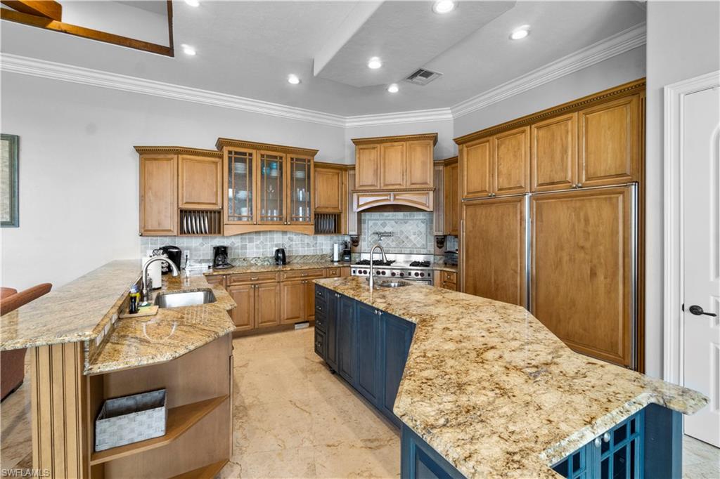 Designed with both style and comfort in mind, Casa Solara features over 5, 000 square feet of meticulously crafted living space. The great room opens directly to the bay, showcasing dramatic views and elegant coastal furnishings. A gourmet chef’s kitchen anchors the home with an oversized island, Wolf and Sub-Zero appliances, double ovens, a wine cellar, and every culinary amenity imaginable. The primary suite is a serene retreat—complete with a private lanai overlooking the bay, an ornate fireplace, dual walk-in closets, and a spa-style bathroom with a jetted soaking tub and double showers. Four additional guest suites, each with queen-sized beds, offer elevated views of the water and sunsets. An upstairs game room and family lounge invite relaxed evenings with billiards or cocktails overlooking the pool and bay.