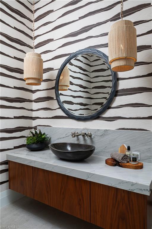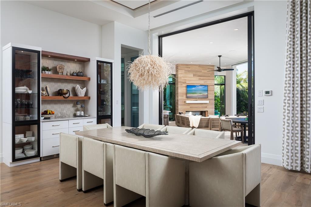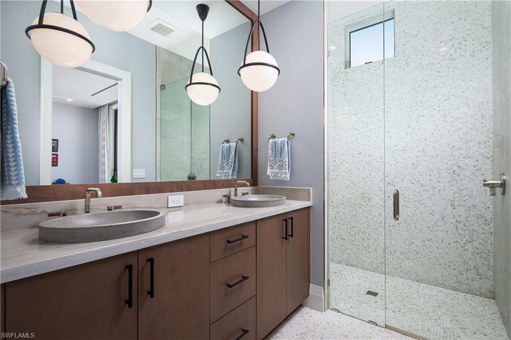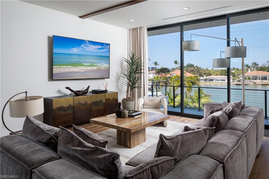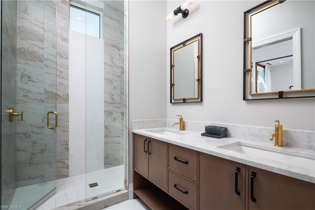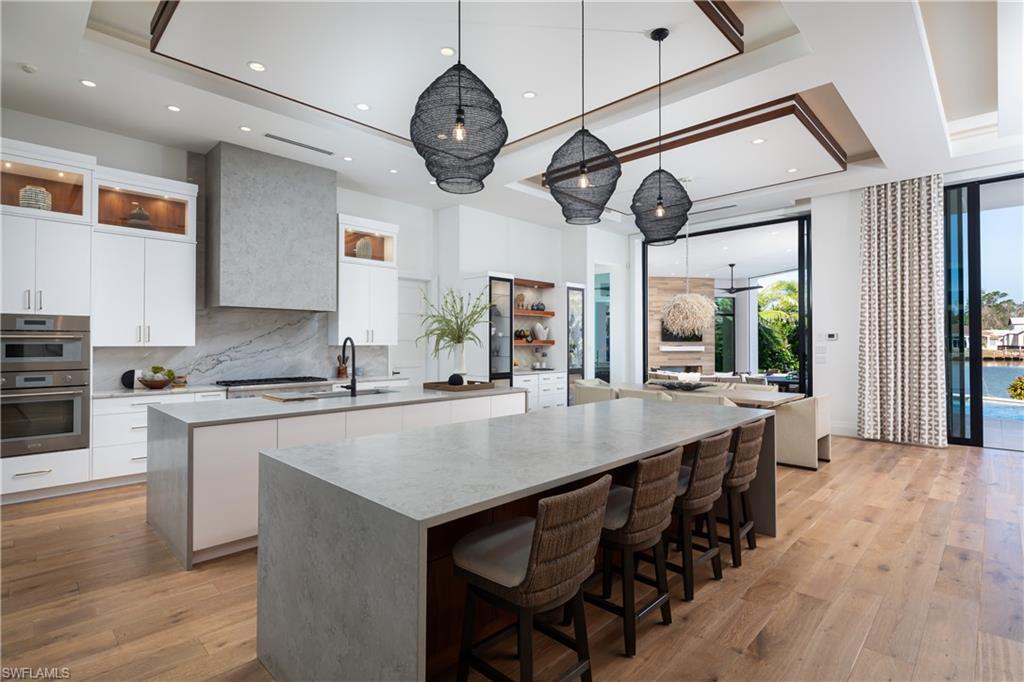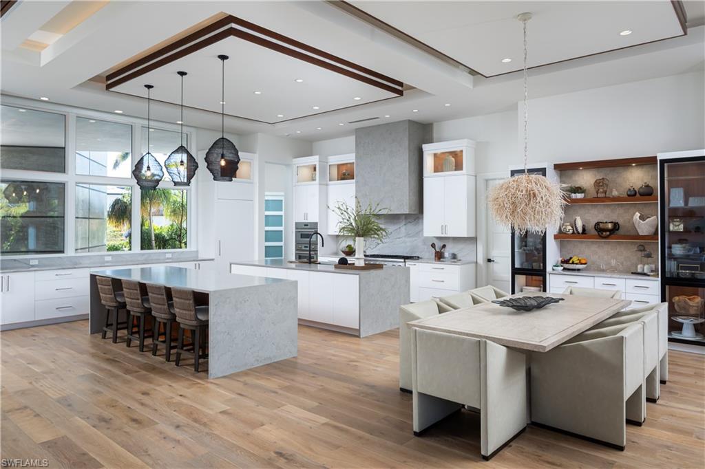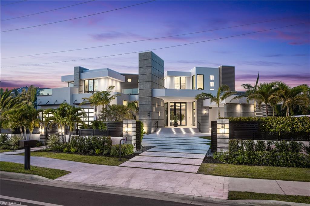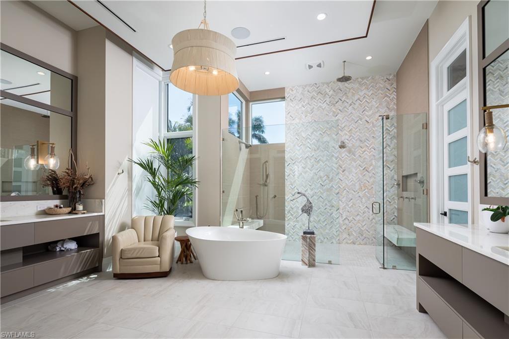 One-of-a-kind masterpiece built in December 2022 (nearly 2023) in the highly sought-after Moorings neighborhood of Naples with breathtaking bay views. Just a 10-minute walk (0. 4 miles) to the beach, this architectural marvel offers an unparalleled coastal living experience. As a Moorings resident, you are eligible for membership (at a very low cost) to the exclusive Moorings Beach Park for effortless beach access. This modern estate was custom-built by the award-winning Potter Homes & expertly designed by Adelyn Charles Interior. Designed for the utmost privacy & exclusivity featuring electric motorized entry gates, a solid fortress-like construction of all concrete block, hurricane impact windows/doors throughout & electric hurricane shutters. Every aspect of this property has been crafted with the finest materials & attention to detail, including stunning oak flooring, reverse tray ceilings with wood paneling/uplighting & soaring 14-ft ceilings. Part of the exclusive “Golden 50” in the Moorings, with direct, bridge-free access to the Gulf in just 5 minutes via Doctors Pass. For boating enthusiasts, the home is equipped with dual lifts—one featuring a 30 ft boat lift with a 16, 000 lb weight capacity, and the other for dual jet skis. The outdoor living space is a true paradise, with a luxurious pool and spa, fireplace, sun deck with built-in firepit, and a fully equipped summer kitchen perfect for al fresco dining. With 12 ft pocketing floor-to-ceiling sliders, the space effortlessly blends the interior and exterior for seamless waterfront living. Inside, this expansive estate offers 6, 900 sq ft under air with 6 bedrooms, 6 full bathrooms (all with dual vanities), 3 half baths, a separate guest house, 3 laundry rooms & a 3-car garage. The state-of-the-art kitchen is a chef’s dream, with custom white cabinetry, dual wood islands with waterfall concrete overlays, high-end Thermador appliances & a butler’s pantry. The main-level primary suite is a private retreat, complete with custom wood ceilings, a wet bar, massive walk-in closets, and a spa-like bathroom with dual vanities, dual water closets, a generous shower with multiple showerheads, dual benches & a separate soaking tub. Upstairs, a spacious living room area with a wet bar, island with bar seating & 3 bedrooms create the perfect space for relaxation, while a sundeck provides breathtaking water views. For ultimate guest privacy, the separate guest villa offers a bedroom, ensuite bathroom, laundry room, full kitchen & private sundeck—ideal for hosting guests. Another highlight of this home is the rooftop observation deck offering sweeping views of the Gulf & Bay—perfect for sunset vistas. Additional features include a private elevator, buried gas propane tank, electric screens, lush landscaping, a spacious front yard ideal for pets & more. An extraordinary sanctuary in one of Naples' most coveted communities, The Moorings, this residence is truly a showcase of visionary design.