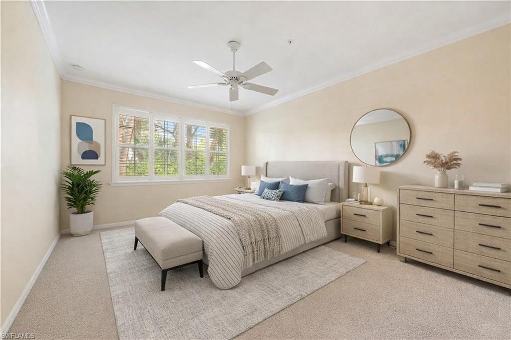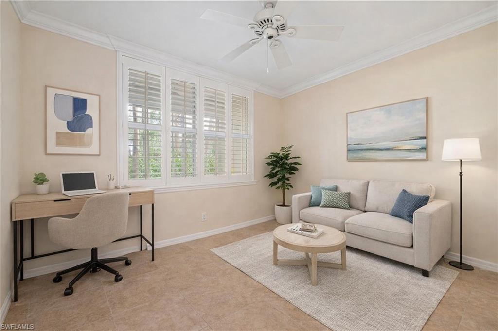 Custom PLANTATION SHUTTERS, crown molding, and tile flooring throughout the main areas bring both elegance and durability.