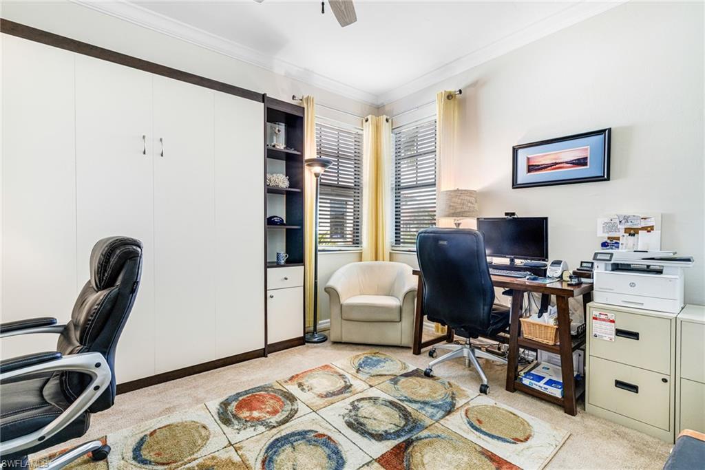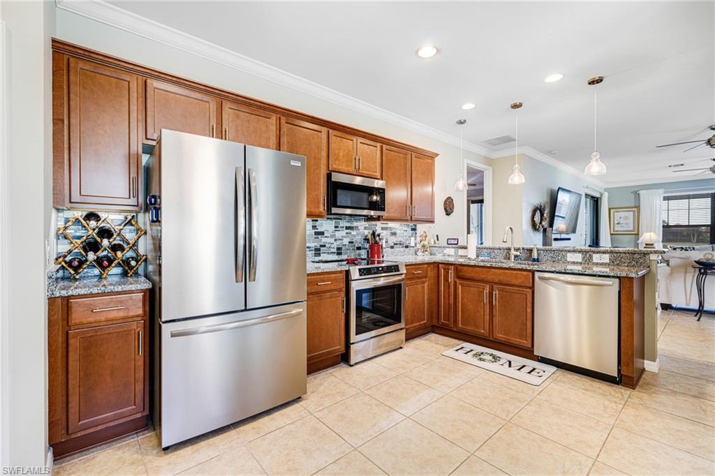 Welcome to your dream home at 1511 Oceania Drive South in Artesia. The gated community offers resort style living, with low HOA fees, including lawn maintenance, cable and internet/Wi-Fi, and NO CDD! This stunning, WCI built, meticulously maintained 2-bedroom plus a den, 2-bath villa offers the perfect blend of luxury, comfort and convenience that includes the highly sought after extended living room and a large extra depth 2-car garage. Step inside and be captivated by the open-concept layout, featuring ceramic tile flooring complemented by the freshly painted Sherwin Williams "Coastal Cool" color palette. Enjoy the tranquil West-facing spectacular sunset lake view from the spacious over 500 s/f lanai added in 2023, featuring a picture window cage and upgraded 20/20 no-see-um screens. The lanai features a jacuzzi hot tub, ceiling fan, Clear Choice electric roll down impact screen offering peace of mind during any season and cable TV, water and electric outlets. The home is protected by premium “hurricane-impact” rated windows and double sliders using tempered, high efficiency, laminated insulated low-e glass. The impact front entry door, with glass insert and hide away phantom screen door, welcomes you and your guests to your dream home. Once inside you will find many recently completed high-end upgrades, including ceramic tile, wide crown moldings throughout, stainless appliances, granite counter-tops, custom glass tile back splash, under cabinet lighting, impact windows and sliding doors, and a monitored security system. The den features glass French doors and easily converts to a 3rd bedroom to accommodate extra guests with an included Murphy bed. The laundry area has a newer washer and dryer, including a convenient countertop with a stainless sink, tile backsplash and an abundance of storage cabinetry. Additional highlights include LED landscape lighting, new irrigation equipment with extra zones, an HVAC Carrier heat-pump system, including an Ultra-violet air purification system that ensures modern comfort, Moen and Kohler fixtures and a built-in TAEXX pest control system. The private primary suite includes double sliding impact doors leading out to the covered lanai, an en-suite bathroom with double sink vanity, Corian countertop, euro glass shower enclosure, discreet water closet, and an expansive walk-in closet. Artesia amenities include a clubhouse with a resort-style pool, pickleball and bocce courts, fitness center, library, theater, 2 dog parks and more—all just minutes from the restaurants and nightlife of 5th Avenue downtown Naples, Marco Island and the pristine Gulf beaches. This is a MUST SEE - Schedule your private showing today!