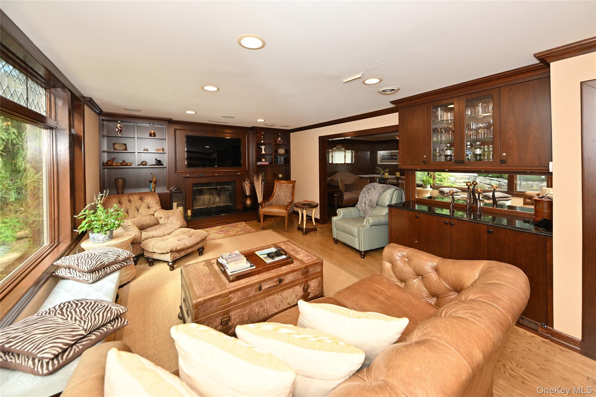 Welcome to this Stunning Colonial, blending luxury and exceptional amenities with natural beauty. Set on over an acre of lush, mature landscaping, this property is designed for both relaxation and entertaining. At its heart, a magnificent pool with built-in spa and waterfall feature is surrounded by an expansive Tennessee paver deck. The outdoor kitchen—complete with grill, sink, and refrigerator—matches the stonework of the pool area for a seamless look. A pool house cabana with two changing areas and a full bath enhances convenience, while an oversized stucco-finished storage shed offers additional space. The grounds are fully enclosed with aluminum fencing, highlighted by evening accent lighting, and complemented by a soothing waterfall. A fully paved circular driveway with ample parking leads to the home’s double-door entry. Inside, you’re welcomed by an inviting foyer. The elegant dining room features wood flooring and wainscoting, while the expansive living room showcases custom Manhattan cabinetry and hardwood floors. The family room, with its stunning oversized leaded-glass window overlooking the beautiful yard, includes custom built-ins, surround sound, and a wood-burning fireplace. The adjoining kitchen offers gas range with grill, granite counter, with opening to family room plus sliding doors to the patio. Not to be missed is the great room, an ideal space for family gatherings with its cathedral ceiling, two skylights, and recessed lighting. Upstairs, the spacious primary suite includes a full bath and walk-in closet. Three additional bedrooms, full bath and a sunlit landing with skylight complete the level. The fully finished lower level provides a versatile living area with seated built-ins, a large laundry room, plenty of storage, a large bonus room, with adjacent wet bar plus a travertine-tiled full bath not to be missed! With over 4, 000 sq ft of finished living space, including the lower level, this home is as functional as it is beautiful. A true retreat inside and out—this property must be seen!