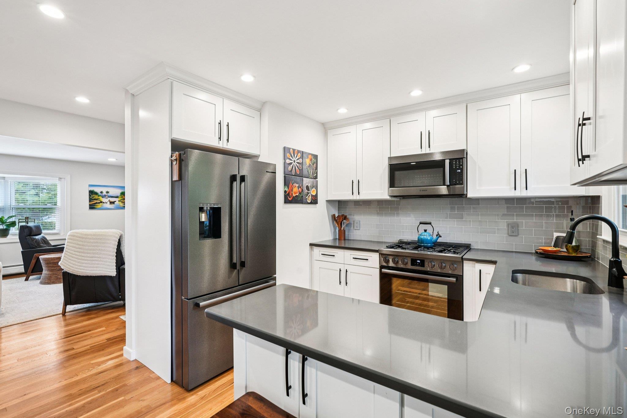 Beautifully renovated 1-Bedroom/1-bath in Bon Aire Move right into this first-floor unit featuring an updated kitchen with black stainless-steel appliances, quartz countertops, white soft-close cabinetry, and recessed lighting. A bright dining area opens to a new Trex deck with private views. The spacious living and dining rooms offer new hardwood floors, and the large bedroom includes double closets with built-in organizers. The renovated bath features a quartz-topped vanity and modern finishes. Additional features include new windows, updated balcony framing, basement storage, and on-site laundry. Heat, water, and gas are included. Bon Aire offers a pool, tennis, bocce, basketball, and playgrounds, all close to shopping, dining, schools, and transportation—just 45 minutes to Manhattan.