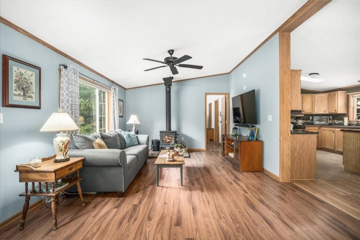 Discover comfort, privacy, and peaceful country living near Lake Winnipesaukee at Eagle's Rest, a sought-after 55+ community. This well-maintained 3-bedroom, 2-bath home offers single-level living with thoughtful details throughout. The zero-step entry ramp provides easy access year-round - no snow shoveling required! Inside, enjoy an open-concept layout with wood laminate flooring, a spacious kitchen with an eat-in area, and a separate dining room that can also serve as a den or study. The cozy living room features a wood-burning stove, offering warmth and peace of mind during winter storms. The primary suite includes a walk-in closet, double vanity, new shower, and soaking tub, while two additional bedrooms, a full main bath, and a laundry room are privately situated at the opposite end of the home. Relax on the freshly painted back deck overlooking the wooded yard, often visited by local wildlife. Additional storage includes two backyard sheds and a detached 22' garage large enough for a pickup with room to spare. Eagle's Rest is a beautiful community that spans 47 acres, and the fees include snow removal, water, sewer, and trash service. Conveniently located near town amenities and just minutes from Lake Winnipesaukee, this home offers easy living and the benefit of Alton's low taxes!