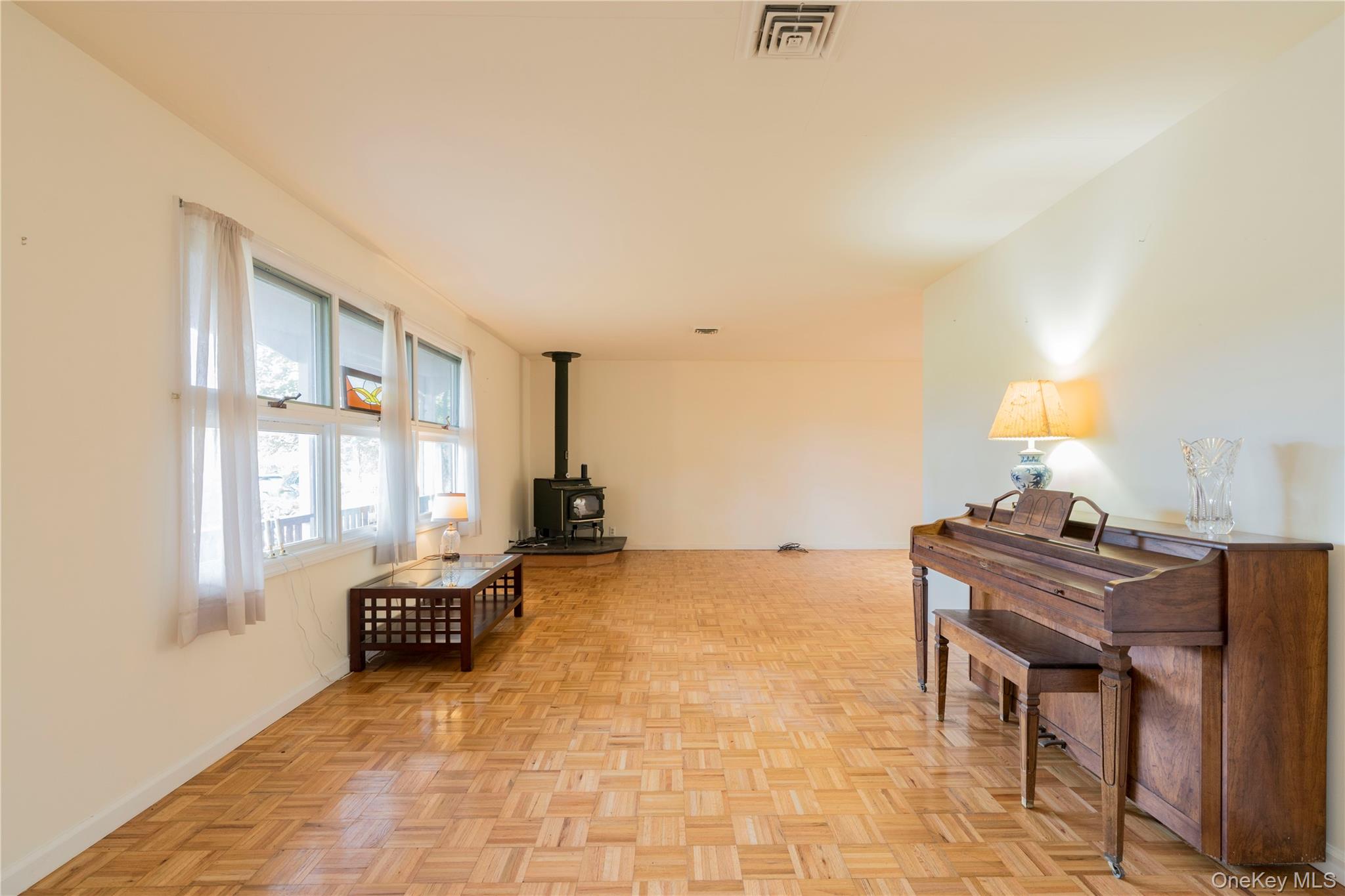 This Rhinebeck Mid-Century modern ranch home is sited on 1. 37 acres only minutes from Rhinebeck village and the Rhinecliff train station. Located on Scenic Hudson River Historic River Road and directly across from the 750 acre Creed Ankony farm’s bucolic fields. A well maintained country home with many recent updates such as the roof, furnace, garage doors, back deck, generator hook up etc. . . This 2246 square foot home features a large living room that is open to the dining room, a renovated eat-in kitchen with a fireplace, a sunny library/office room, a spacious auxiliary room, a large sun room with vaulted ceiling & 3 sky lights and glass doors that lead to a 540 foot back deck and a separate laundry room. There are 2 bedrooms and 2. 5 bathrooms with a primary bedroom suite with a primary bathroom and 2 closets, plus a 2nd bedrooms with a full bathroom. There is a large two car attached garage and a small barn with electric and a wood stove for storage or a workshop. Ideally located close to the village, hospital, library, train, Bard college and the Kingston/Rhinecliff bridge. This is a perfect weekend retreat or full-time home. Please see virtual 3D floor plan of the home and property.