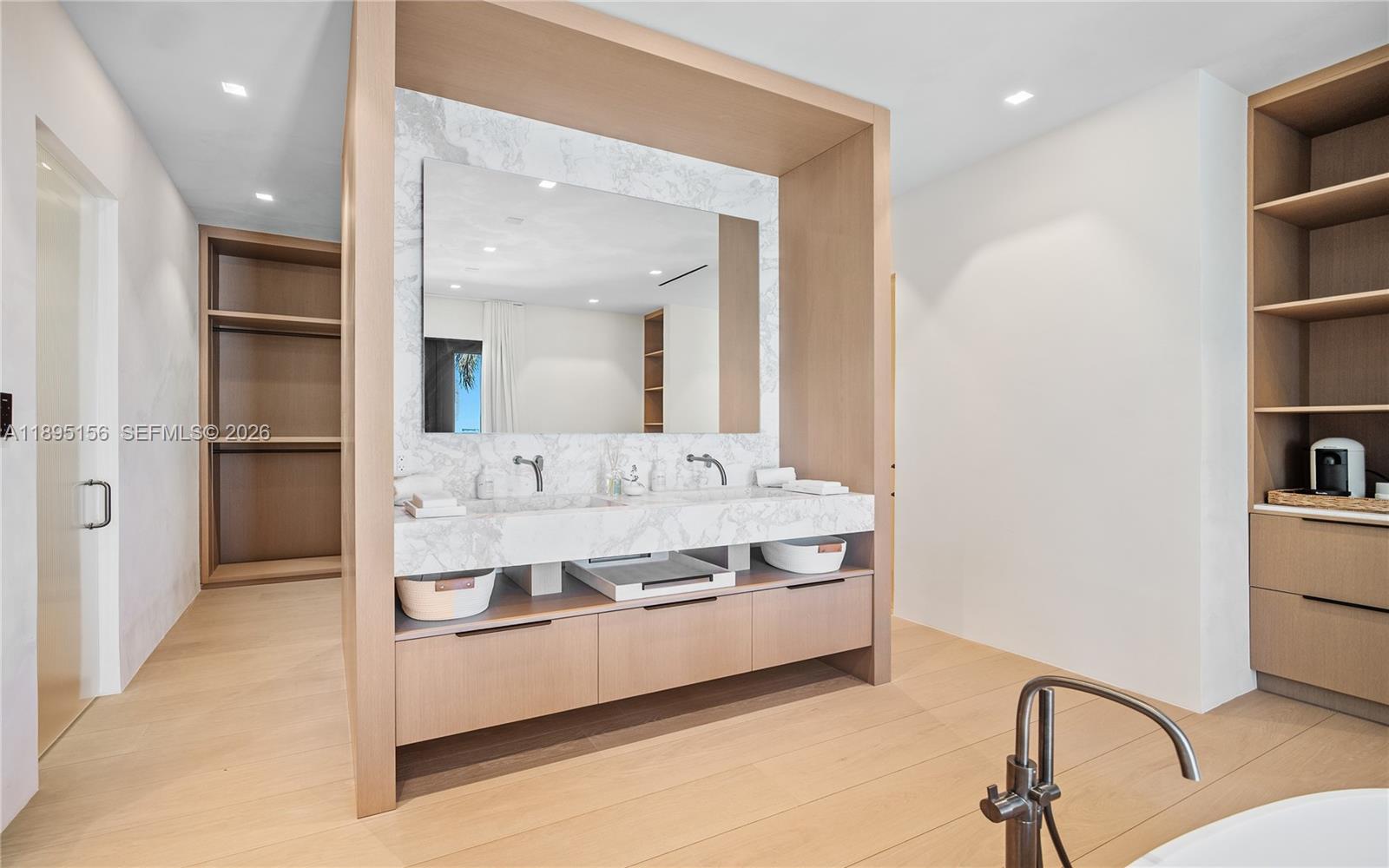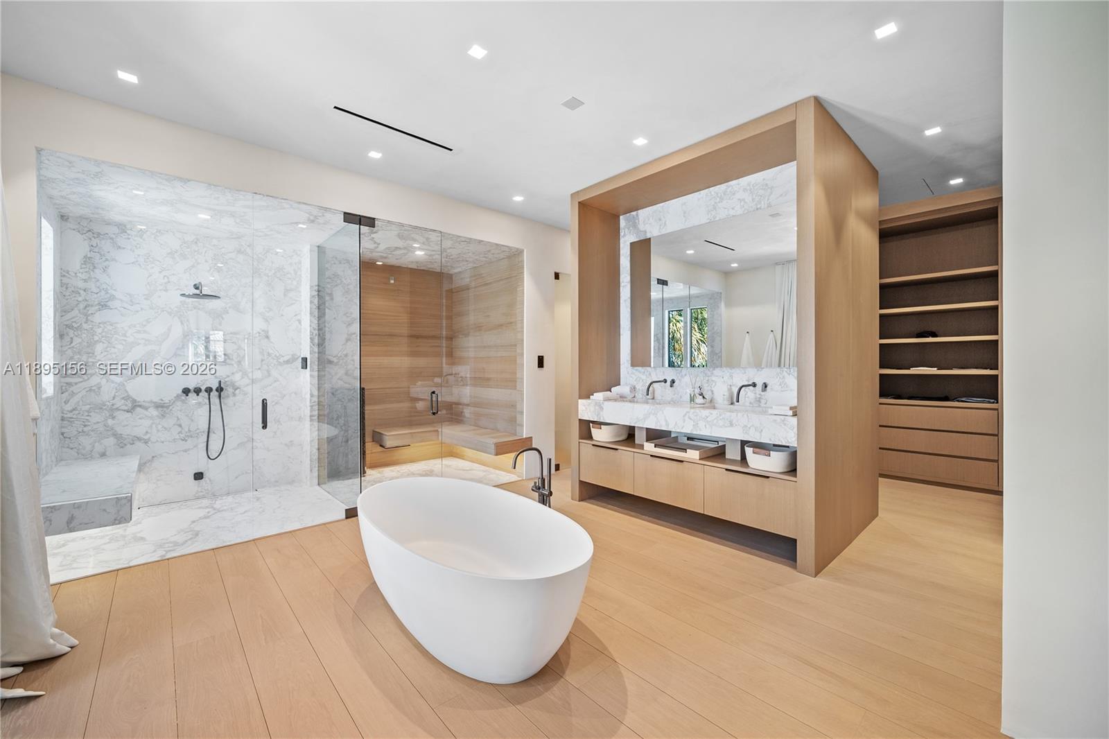 Timeless Architecture Reimagined with Modern Elegance on Iconic N Bay Rd. Developed by Menin Homes & architecture by Zeb Jarosz, this waterfront estate showcases wide open bay & skyline views. Main house offers 4BD/4. 5BA while a detached guest residence includes 3BD/3BA with garage. 12’ ceilings, Marmorino plaster walls & wood flooring throughout frames light-filled interiors anchored by a bamboo-flamed travertine fireplace. Bespoke ITALKRAFT kitchen with Sub-Zero & Wolf appliances complements marble-accented baths & custom millwork. Primary suite boasts a steam room, sauna, his & her toilets & terrace with a cold plunge. Enjoy a new pool, jacuzzi, Cocoon shower & custom BBQ. Fully automated Control4 smart home w/ generator, Apparatus lighting & ATRA furnishings complete this masterpiece.