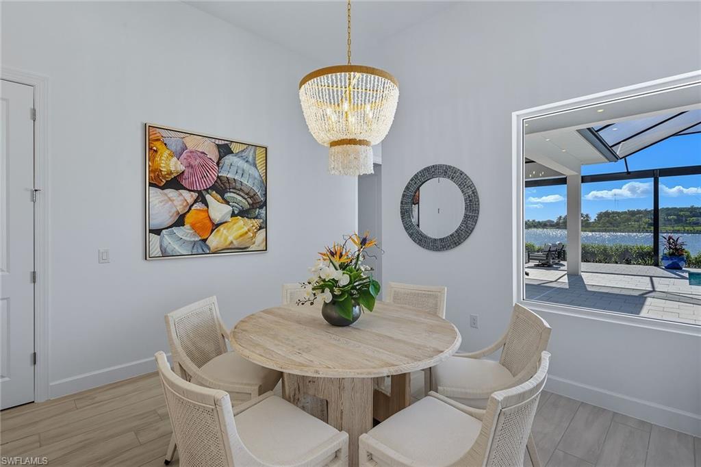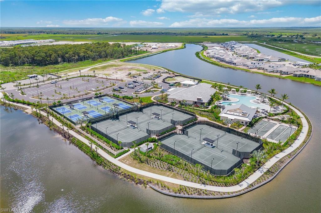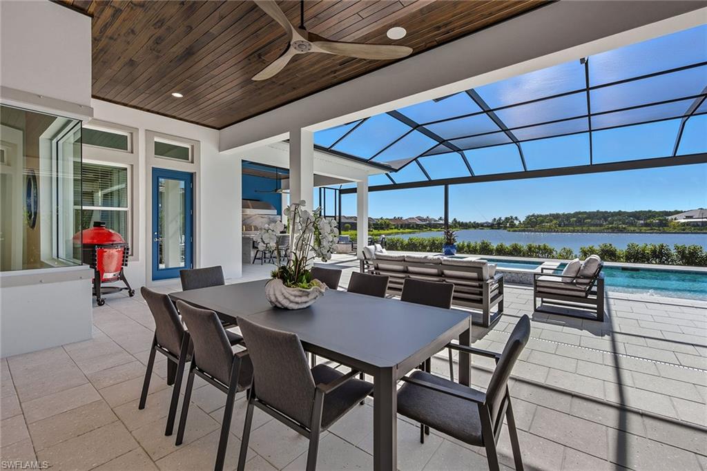 Experience modern luxury and breathtaking wide-water vistas from this magnificent newly built and fully furnished two-story residence in the popular gated community of Esplanade by the Islands. Completed in 2024, this better-than-new masterpiece was designed to capture unobstructed lake views from nearly every room-offering a serene and elegant backdrop for everyday living. Exquisite craftsmanship is evident throughout, with extensive millwork, refined finishes, and upgraded landscaping and lighting that elevate its exceptional curb appeal. Featuring four bedrooms plus a den, four full and two half baths, and a three-car garage, this residence seamlessly combines sophistication, comfort and functionality. Go through impressive impact-rated double doors into an open-concept living space highlighted by tray ceilings, designer chandeliers, transom windows and recessed lighting. The great room showcases a shiplap accent wall, built-in fireplace, and expansive glass sliders that open to the lanai for effortless indoor-outdoor living. The gourmet kitchen is a chef’s dream, complete with white shaker cabinetry, in- and under-cabinet lighting, quartz counters, white subway tile backsplash, dual beverage refrigerators and GE Café stainless appliances, including a natural gas cooktop. A large island with pendant lighting and an adjacent dining area create an inviting space for gatherings. The den, accented with French doors and a shiplap feature wall, offers a private workspace or cozy retreat. The primary suite is a peaceful sanctuary with panoramic pool and lake views, lanai access, dual walk-in closets and a spa-inspired bath featuring a soaking tub, dual quartz vanities and a frameless glass shower. Two main-level guest suites each offer walk-in closets and beautifully appointed en-suite baths, one with pool access. Upstairs, a spacious loft serves as an additional living and entertainment area, complete with a sleek wet bar featuring quartz counters, GE stainless appliances (mini refrigerator, dishwasher, microwave and sink), and an adjacent powder bath. A private guest bedroom with en-suite bath completes this level, providing a comfortable retreat with stunning lake views. The outdoor living area is an entertainer’s dream. Enjoy a panoramic screen enclosure, paver-tiled lanai, and a covered seating area with tongue-and-groove ceiling, recessed lighting, and a full outdoor kitchen complete with quartz counters and backsplash, grill, double-drawer refrigerator and island seating. Additional highlights include a wide brick-paver driveway, impact-resistant doors and windows, a tankless natural gas water heater, three Lennox air handlers, and a climate-controlled three-car garage with epoxy flooring, natural light and an air-conditioning mini split. Residents enjoy resort-style amenities, including a pool and spa, fitness center, pickleball and tennis courts, salon and spa services, and poolside dining at The Bahama Bar, with Culinary Center coming soon.