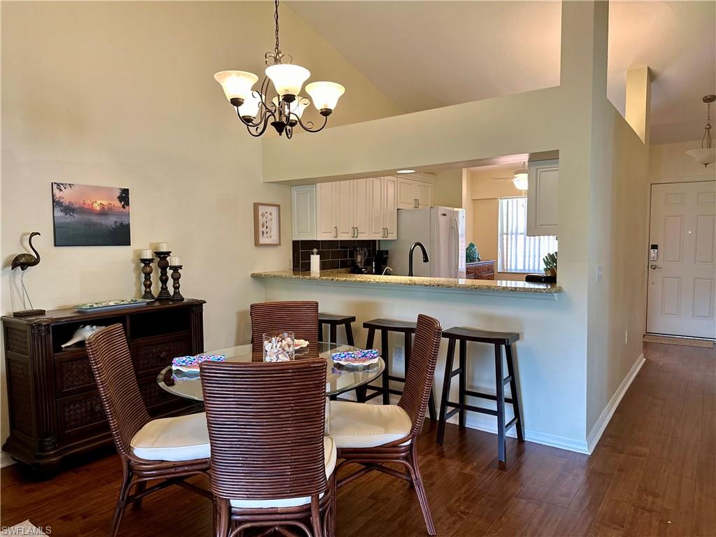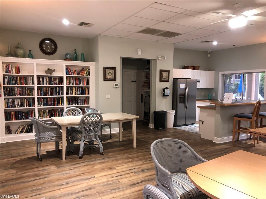 AVAILABLE SEASON 2027! This second floor end unit condo overlooks a peaceful lake where nature abounds. Enjoy your morning coffee on a private screened lanai and watch fish jump, turtles surface, ibis and heron hunt for fish, and osprey soar above. This bright end unit has soaring vaulted ceilings, beautiful hardwood floors, and freshly painted bedrooms. Featuring 2 bedrooms, a den with futon and desk, 2 fully updated bathrooms, updated kitchen with reverse osmosis water filter, and in-unit laundry, this unit comes turnkey furnished and well stocked for your enjoyment. Also available for your convenience is a one-car detached garage. Located just a few miles from downtown Naples, the Pier, and the beautiful white sand beaches of Naples where you can see dolphins and manatees and beachcomb for beautiful shells and sand dollars. Sherwood Village offers great amenities that include two swimming pools, a fitness room, two tennis courts, four pickle ball courts, horseshoes, a clubhouse with library nook, walking paths and an active social community. Book this wonderful property and enjoy the relaxed Florida lifestyle! 2026 seasonal rates $3500/month.
