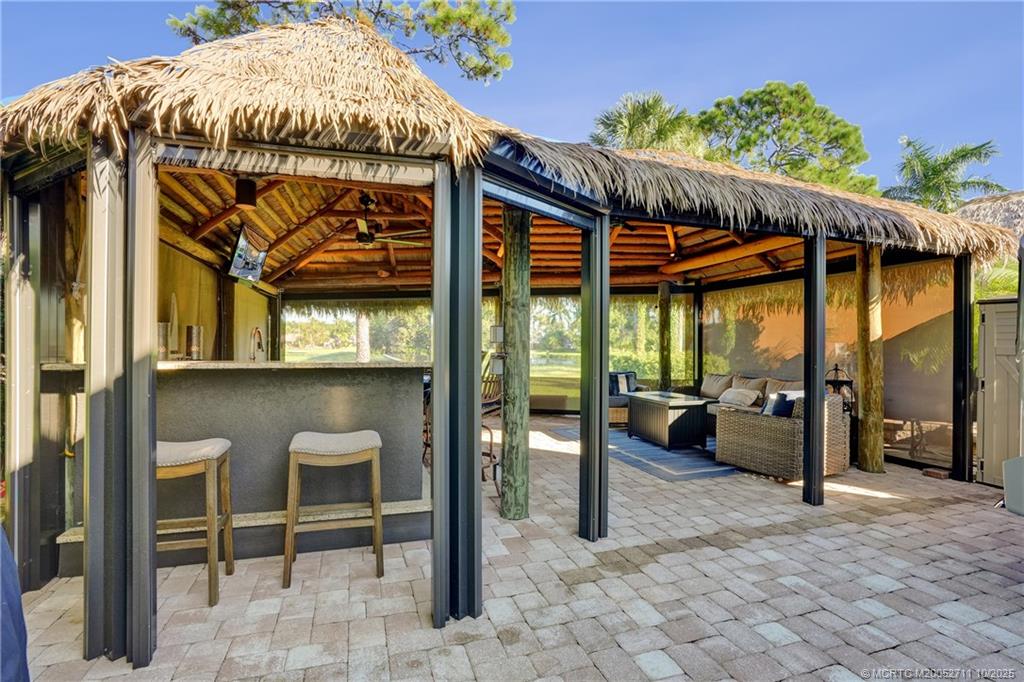 Turnkey RV L?t w?th Premium ?ik? and L?ke Views! Enjoy r?s?rt-style living on this fully equipped, move-in-ready lot with stunning lake and golf course views. The expanded tiki, reimagined in 2023, features a durable synthetic roof, dual Big Ass Fans for year-round comfort, and power roller shades for effortless relaxation. Concrete pavers, landscape lighting, and lush, low-maintenance landscaping create a serene, inviting outdoor space. The bar and kitchen area is ideal for entertaining, complete with cooktop, two refrigerators, sink with water heater, and granite countertops. Dedicated dining and lounge areas with premium Fifth Shore furnishings (included) make this the ultimate outdoor oasis. Simply park your coach, settle in, and enjoy the beauty and comfort of this exceptional property!