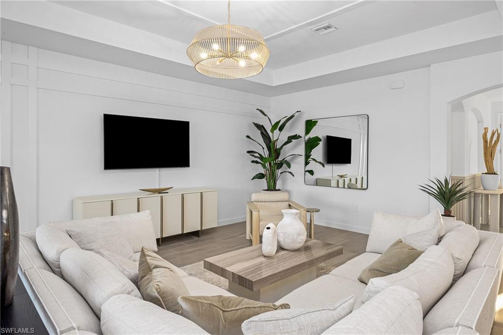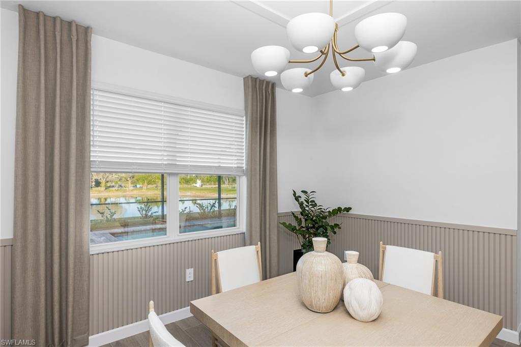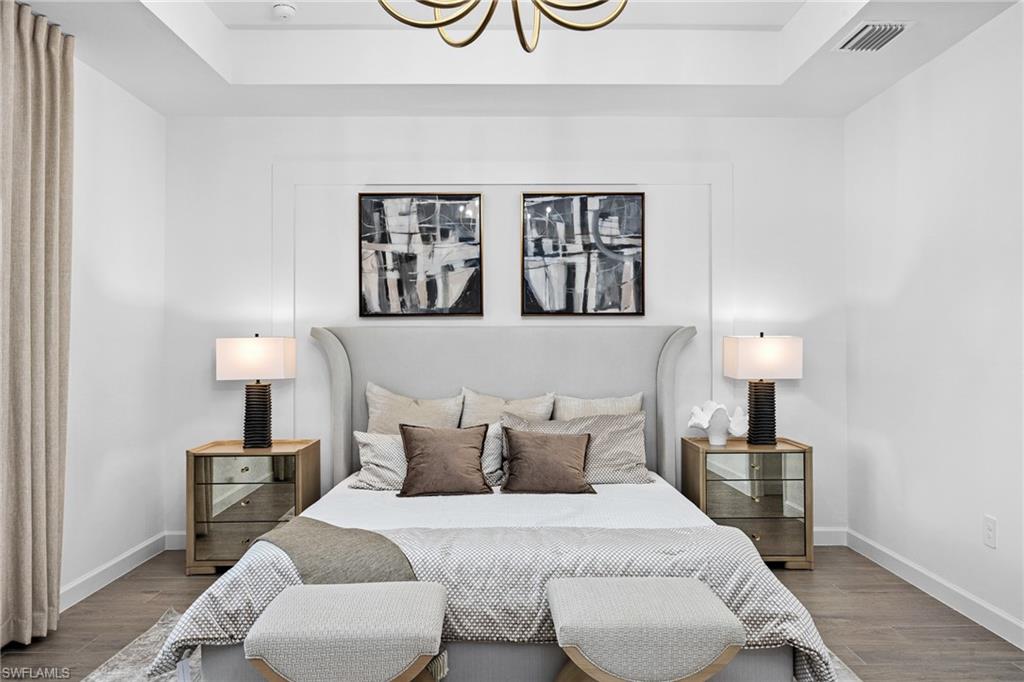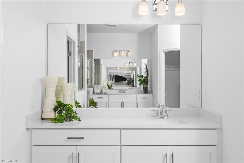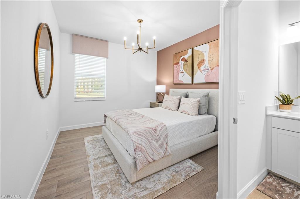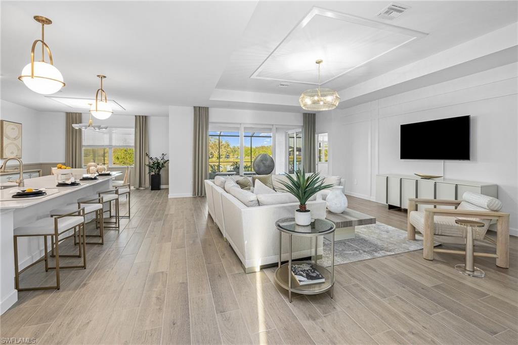The open-concept layout includes a chef’s kitchen with white quartz countertops, stainless steel appliances, an oversized island, and seamless flow into the great room and out to the covered lanai—perfect for entertaining. Step outside to your private outdoor oasis featuring a custom pool and spa, paver pool deck, and beautiful lake views.