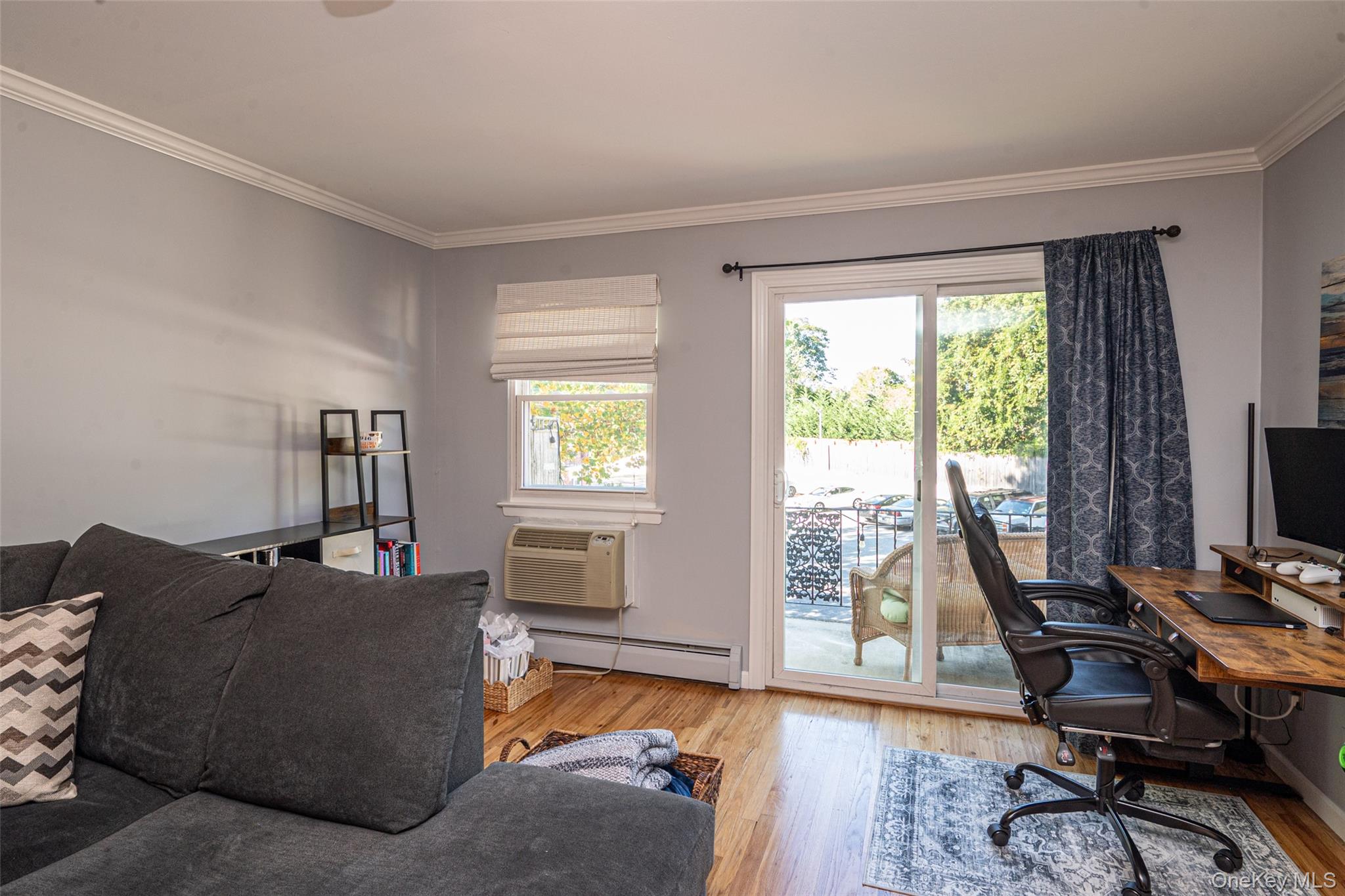 Welcome home to this beautifully maintained and move-in ready 1 Bedroom Deluxe Co-op in the highly desirable Birchwood on the Green community of Oakdale. This spacious second-floor unit offers approximately 950 sq. ft. of bright, open-concept living with timeless hardwood floors and elegant crown molding throughout. Step into a sun-filled living and dining area designed for both relaxation and entertaining. Sliding glass doors lead to your private balcony—perfect for morning coffee or evening unwinding. The kitchen features warm wood cabinetry, granite countertops, and a full suite of appliances, creating the perfect blend of charm and functionality. The updated bath showcases a stylish vanity and tile surround, while the serene primary bedroom offers double mirrored closets and generous space. Enjoy the ease of on-site laundry, extra storage, and beautifully landscaped grounds just steps from your door. The monthly maintenance of $859 includes heat, gas, water, exterior maintenance, grounds care, snow removal, and taxes—providing both comfort and convenience in one package. Located minutes from the Oakdale LIRR station, beaches, parks, shopping, restaurants, and major highways, this pet-friendly community (1 dog up to 30 lbs or 2 indoor cats) offers a relaxed lifestyle with easy access to everything Long Island has to offer. Purchase is subject to co-op board approval, requiring a minimum 10% down payment and a 700+ credit score. $600 application fee & $150 credit check fee to Kaled Management Corp. There is a one time $50 pet fee & $10/month after. One dog up to 30 lbs. , or 2 indoor cats.