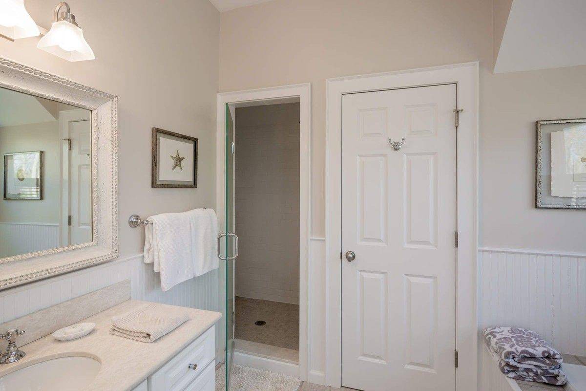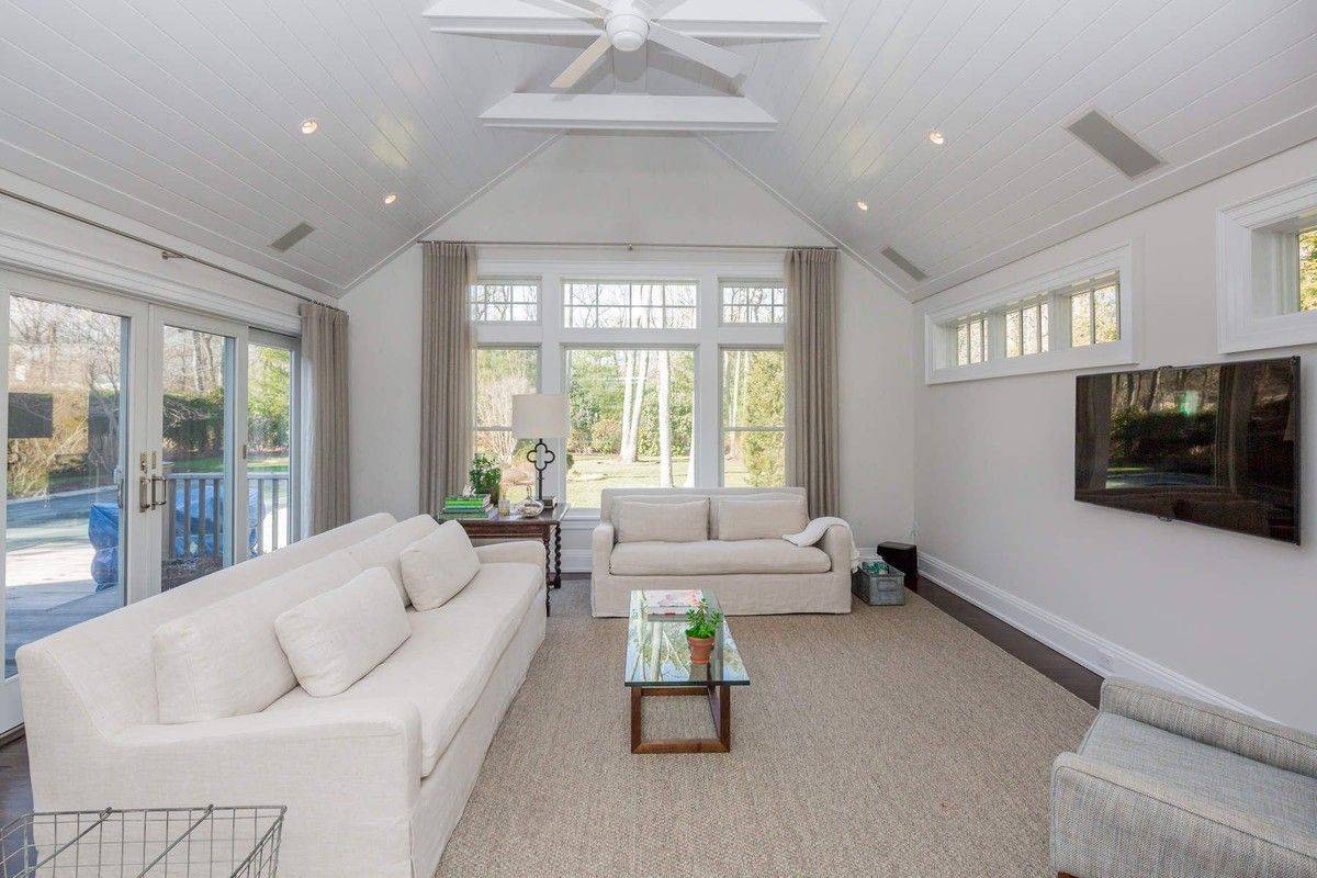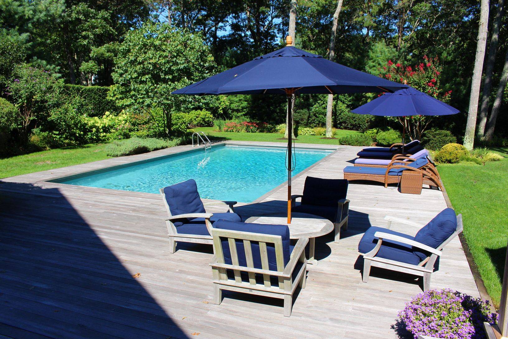 Rental Registration #: 18-281 Cedar shake shingled two story post modern is delightfully furnished in "country chic". Newly renovated interior, this comfortable and stylish home is designed for easy living and comfort. Open living room with fireplace to dining area, up-graded kitchen with stainless steel appliances, and a first floor master bedroom suite. There is also a den to curl up and read a book. The second floor offers three ensuite master bedrooms with newly renovated bathrooms. Central air conditioning and first floor laundry room. Attached one car garage. The backyard offers an oasis for relaxation with new mahogany decking and a heated 20 x 40 pool (childproof fencing available) surrounded by a lush lawn, stunning foliage in bloom, and lavishly landscaped with specimen trees for complete privacy. New mahogany deck furnishings too! Not far from the Jitney, restaurants, shops, and ocean beaches. .