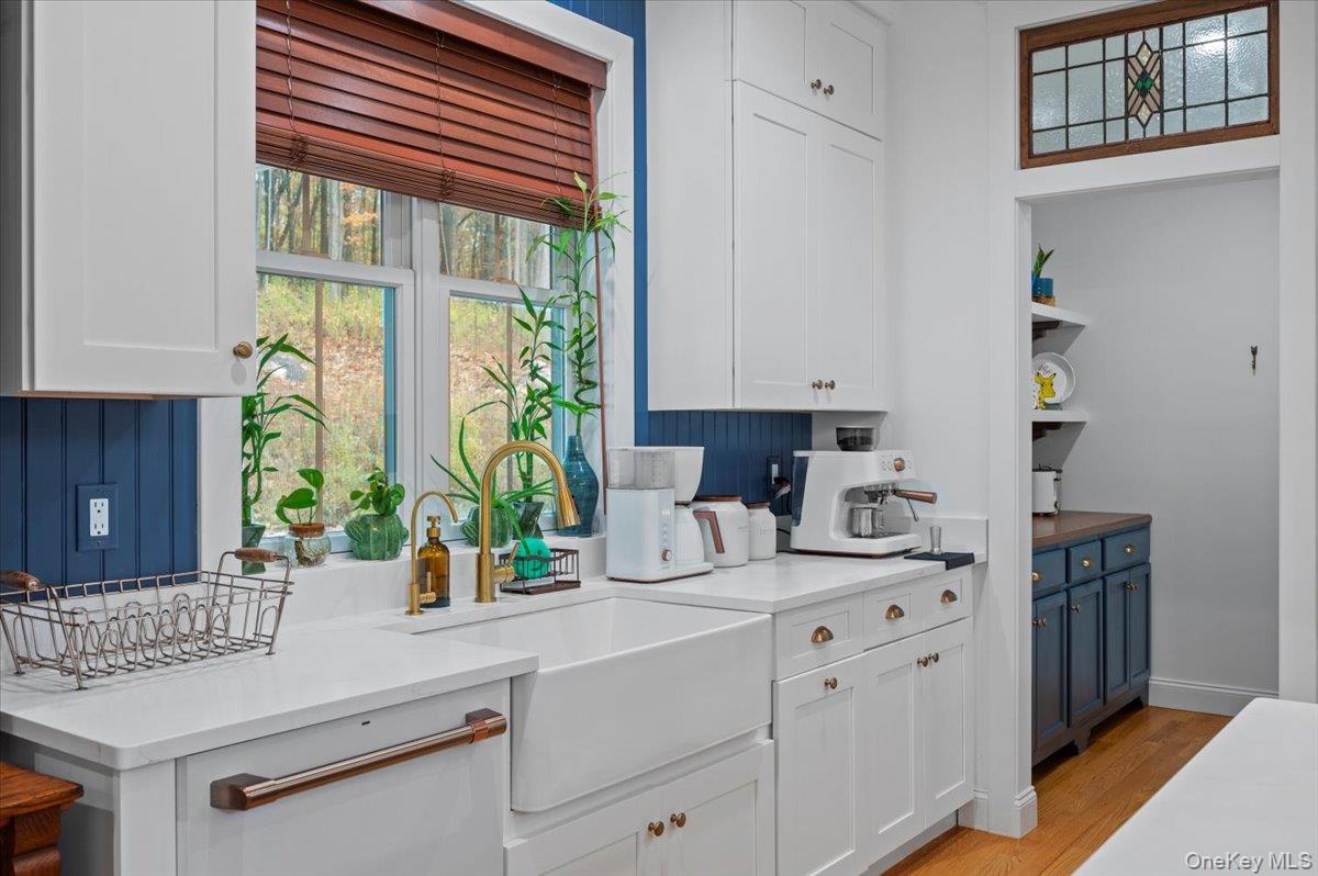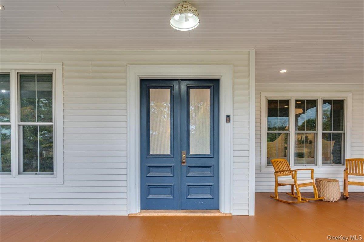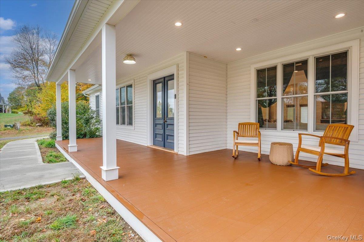 A Timeless Farmhouse Retreat with Modern Elegance. Step into refined country living with this brand-new, bespoke farmhouse ranch, where Old World charm meets contemporary craftsmanship. Chic and gracefully set on over five private, serene acres, this four-bedroom, three-and-a-half-bath home invites you to savor a lifestyle of quiet sophistication and natural beauty. A dramatic 20-foot entryway ceiling welcomes you with an antique stained-glass window, setting the tone for a home where curated history and modern comfort intertwine. Wide-plank hardwood floors, soaring 9-foot ceilings, and sun-drenched Anderson windows carry you through a light-filled open floor plan, designed for effortless entertaining and everyday elegance. The heart of the home is a chef’s kitchen, beautifully appointed with quartz countertops, Cafe series appliances, a farmhouse sink, and a custom range hood. An antique hutch and a walk-in pantry with custom cabinetry offer both charm and function, while French doors in the dining area leads to a covered patio—ideal for al fresco gatherings. The living room is anchored by a gas fireplace with a hand-hewn antique wood mantel and exposed beam, creating a warm, inviting ambiance. A refined powder room, mudroom with garage access, and an oversized laundry suite with built-in storage elevate everyday living. The primary suite is a true sanctuary, featuring a vaulted ceiling, private access to the patio, a custom walk-in closet, and a luxurious spa bath with a freestanding soaking tub, walk-in shower, water closet, and heated floors. Two additional bedrooms and a full bath complete the main level. Upstairs, a spacious media room leads to a fourth bedroom with a walk-in closet and a private en-suite bath—ideal for guests or an au pair suite. Thoughtful details abound: Therma-Tru doors, foam insulation, on-demand hot water, and antique accents throughout. The home also features a three-car attached garage and a wide front porch with Douglas Fir decking, perfect for morning coffee or evening sunsets. Ideally located with convenient access to I-84, Taconic State Parkway, and the Metro-North train, this exceptional residence offers country living with seamless connectivity. Brand new Tesla electric car charger installed. Many home essentials are still covered under the new-build warranty.