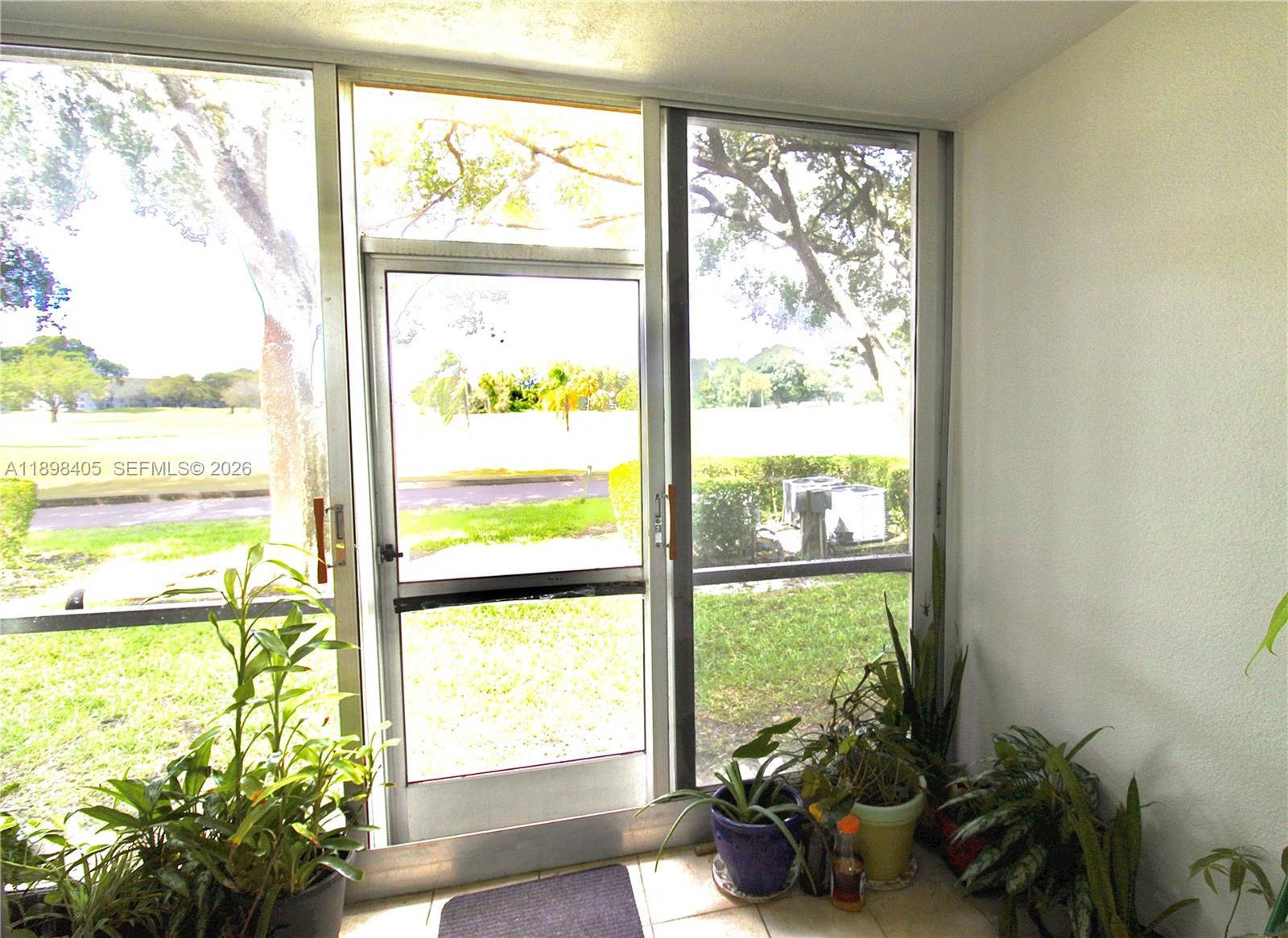 UPDATED, Just bring your clothes! This beautifully refreshed first-floor home has no popcorn ceilings & the convenience of assigned parking just steps from your front door—truly one of Century Village’s most desirable locations. Step into a bright white kitchen featuring newer appliances and quartz countertops. Enjoy the ease of having your own washer and dryer, plus a tankless water heater. The glass-enclosed terrace offers peaceful golf and water views, perfect for unwinding any time of day. Both the primary and second bedrooms include walk-in closets, and the primary bath features an updated shower and a double-sink vanity.