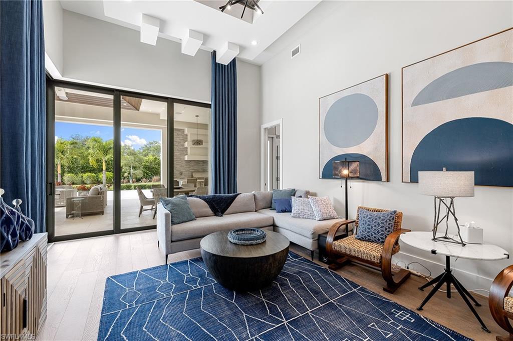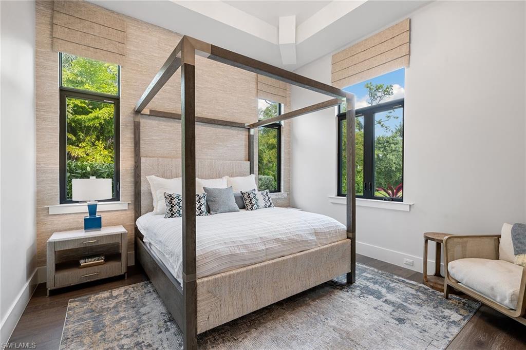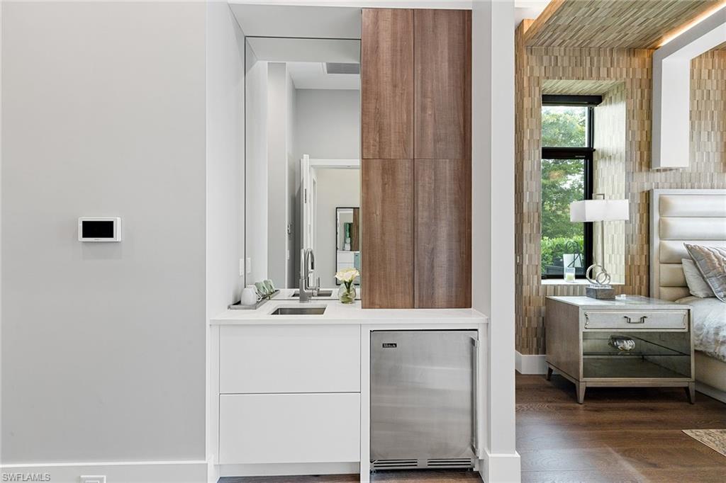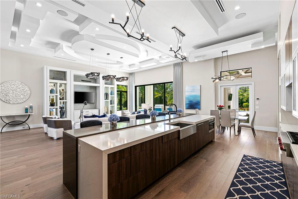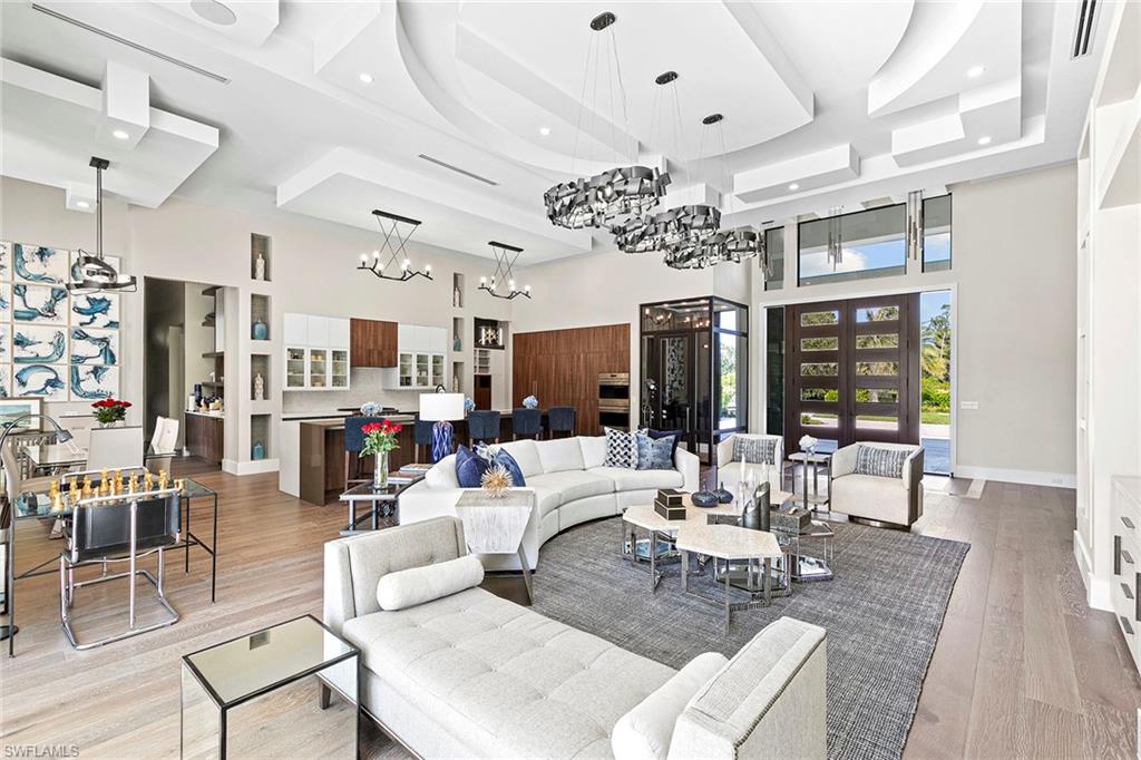 This beautiful contemporary, open-concept home was built in 2021 and sits on a quiet street in Pine Ridge Estate on 1. 19 acres. The Stock Custom, single-story home, is just under 5, 000 square feet and features four bedrooms with en suites plus a bonus room and study, as well as a chef’s kitchen, butler’s pantry and an enclosed glass wine room. The expansive outdoor area faces southwest and is ideal for entertaining with additional summer kitchen and bar, and multiple lounge areas that overlook the pool and spa. The residence is complete with a double two-car garage and is conveniently just a short distance to Waterside Shops, Mercato and white-sand beaches.