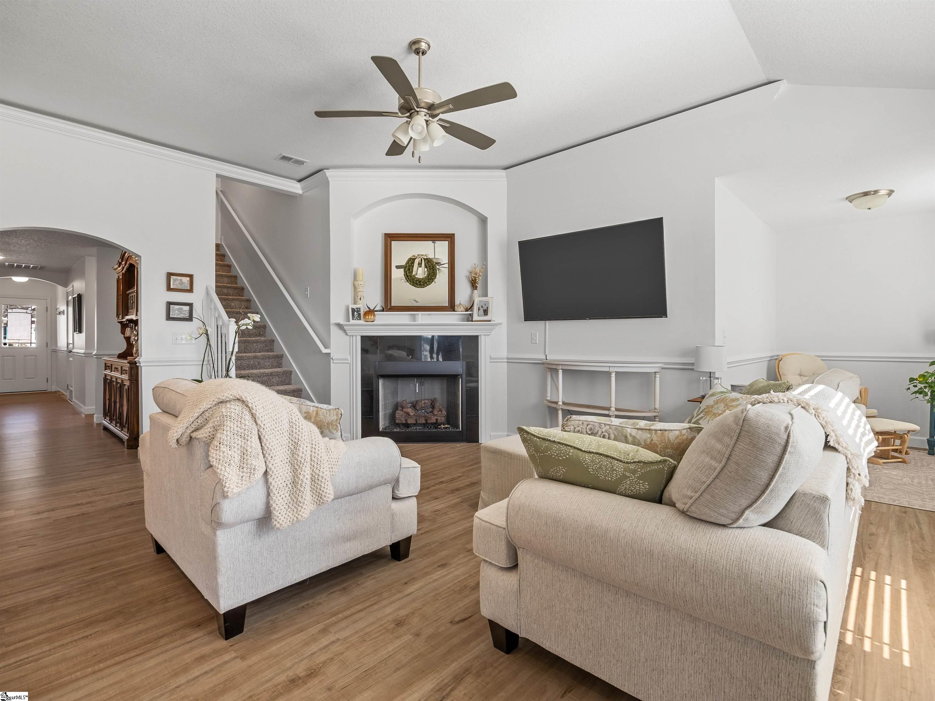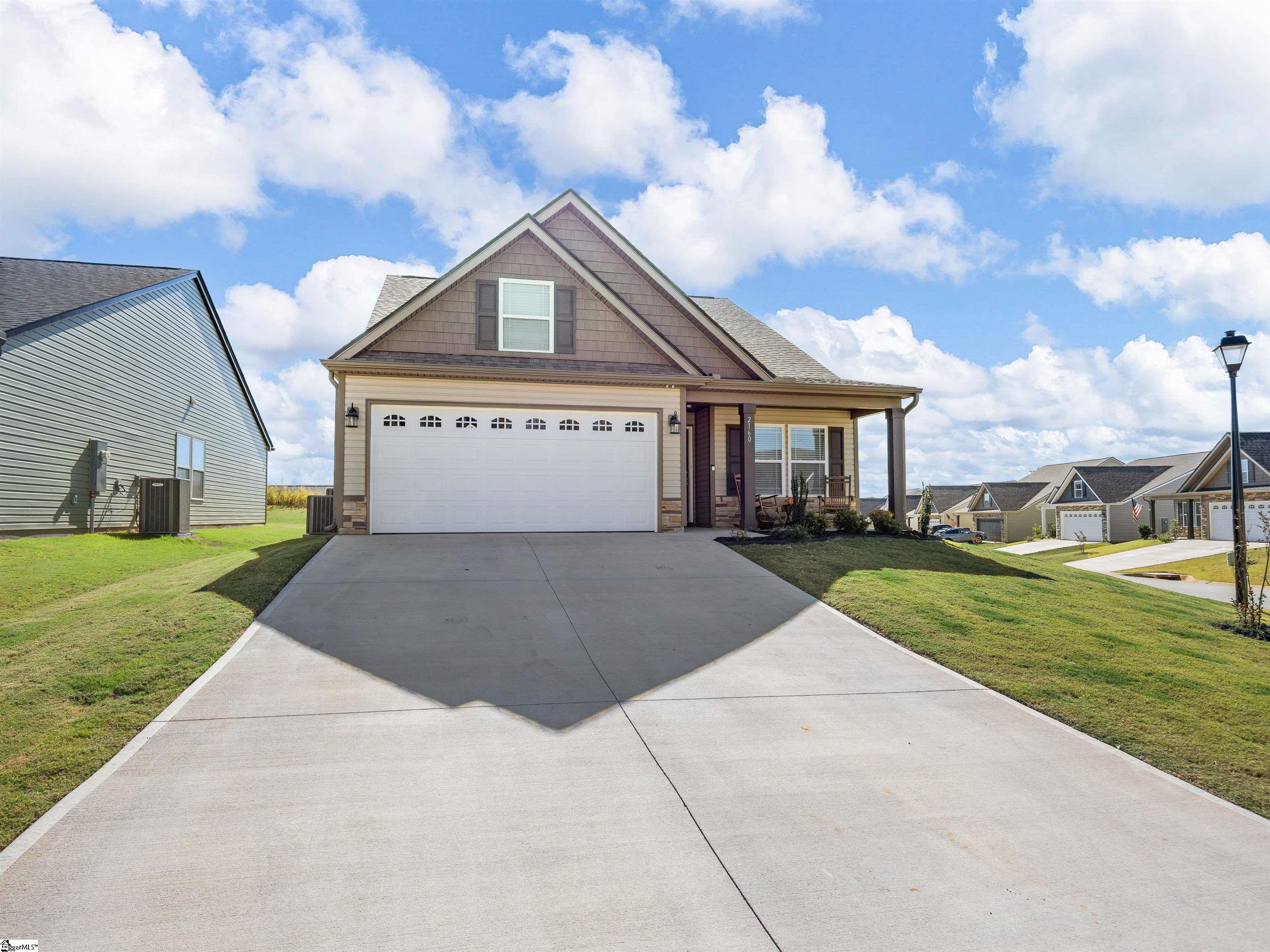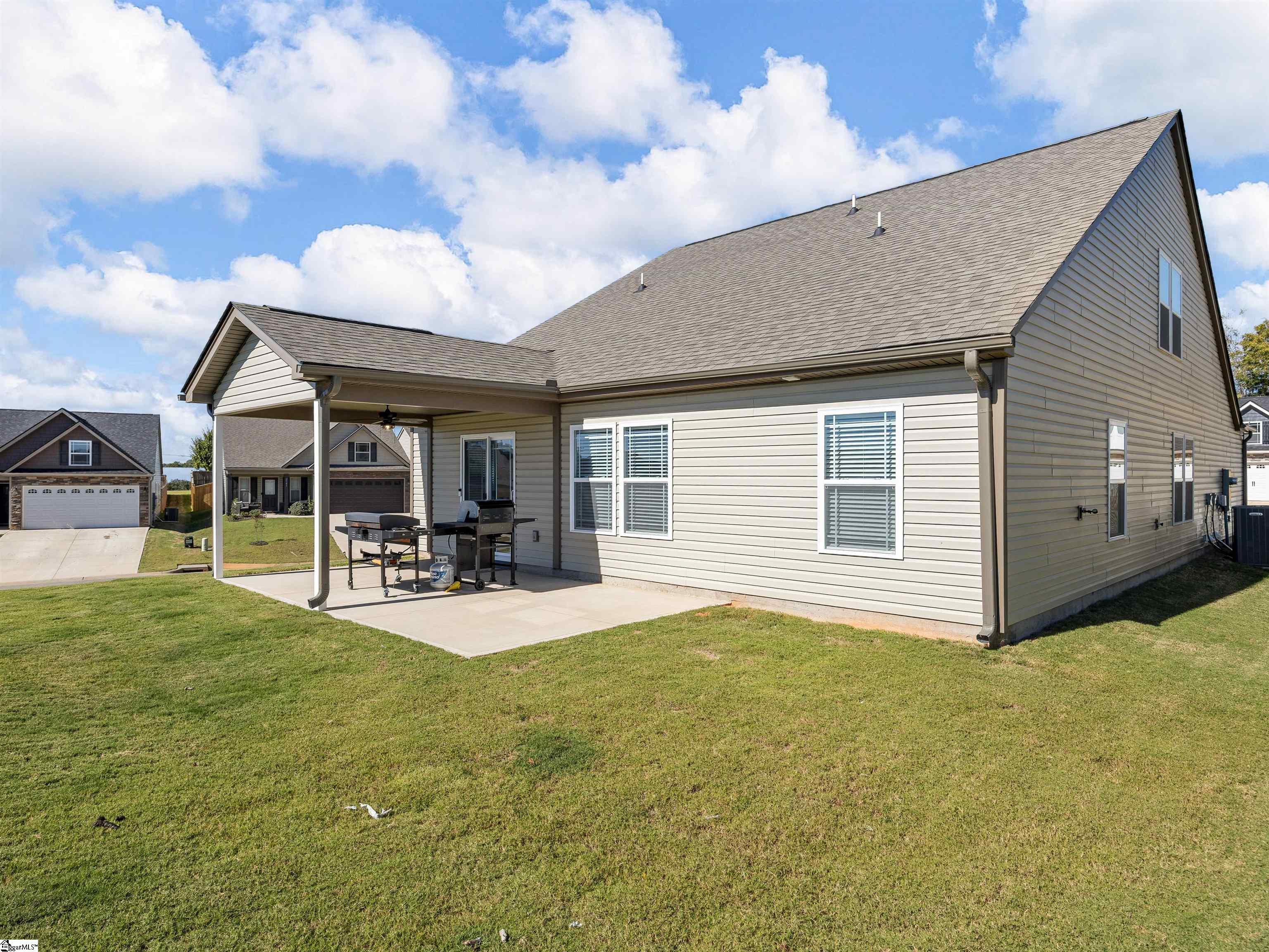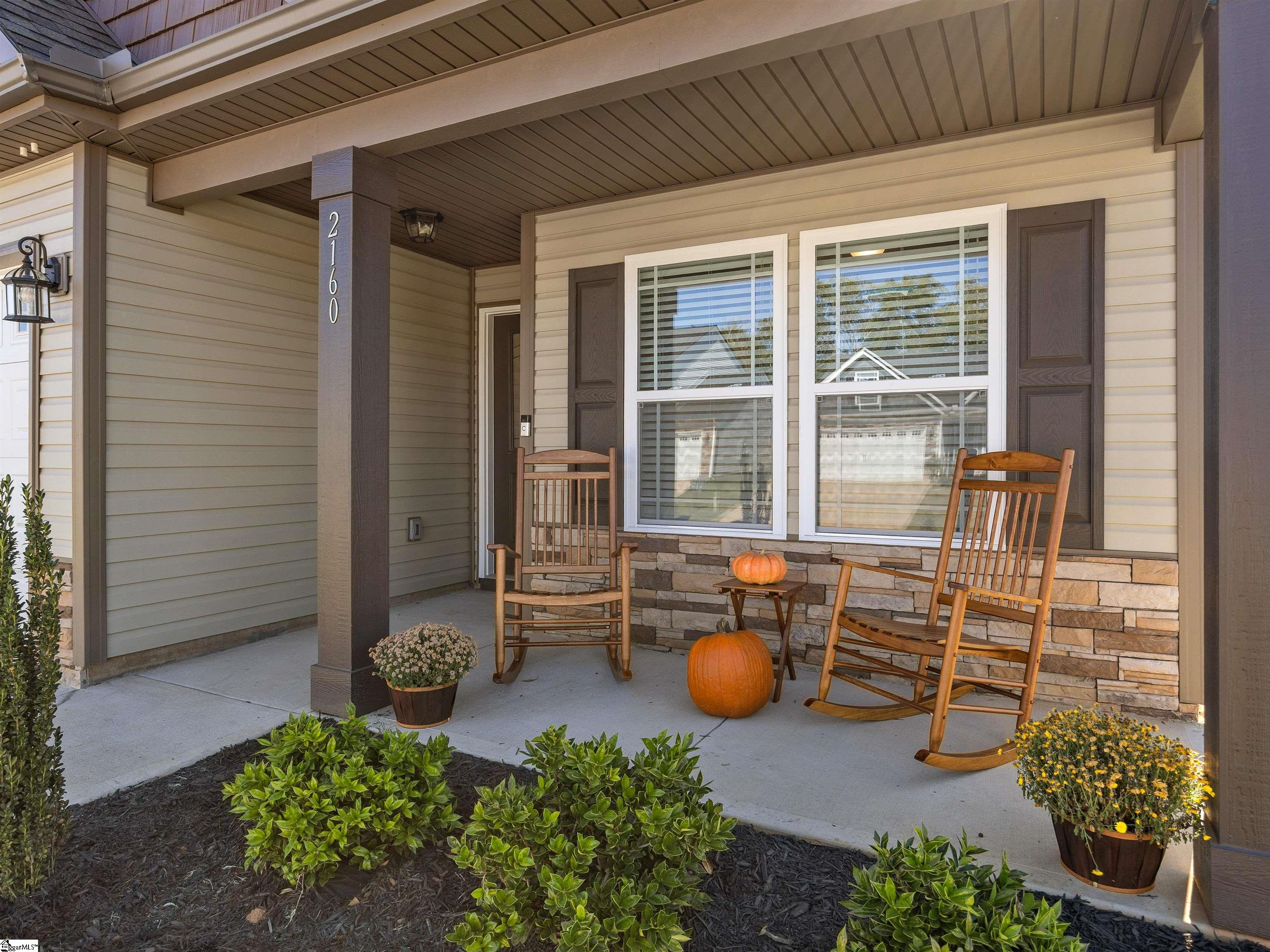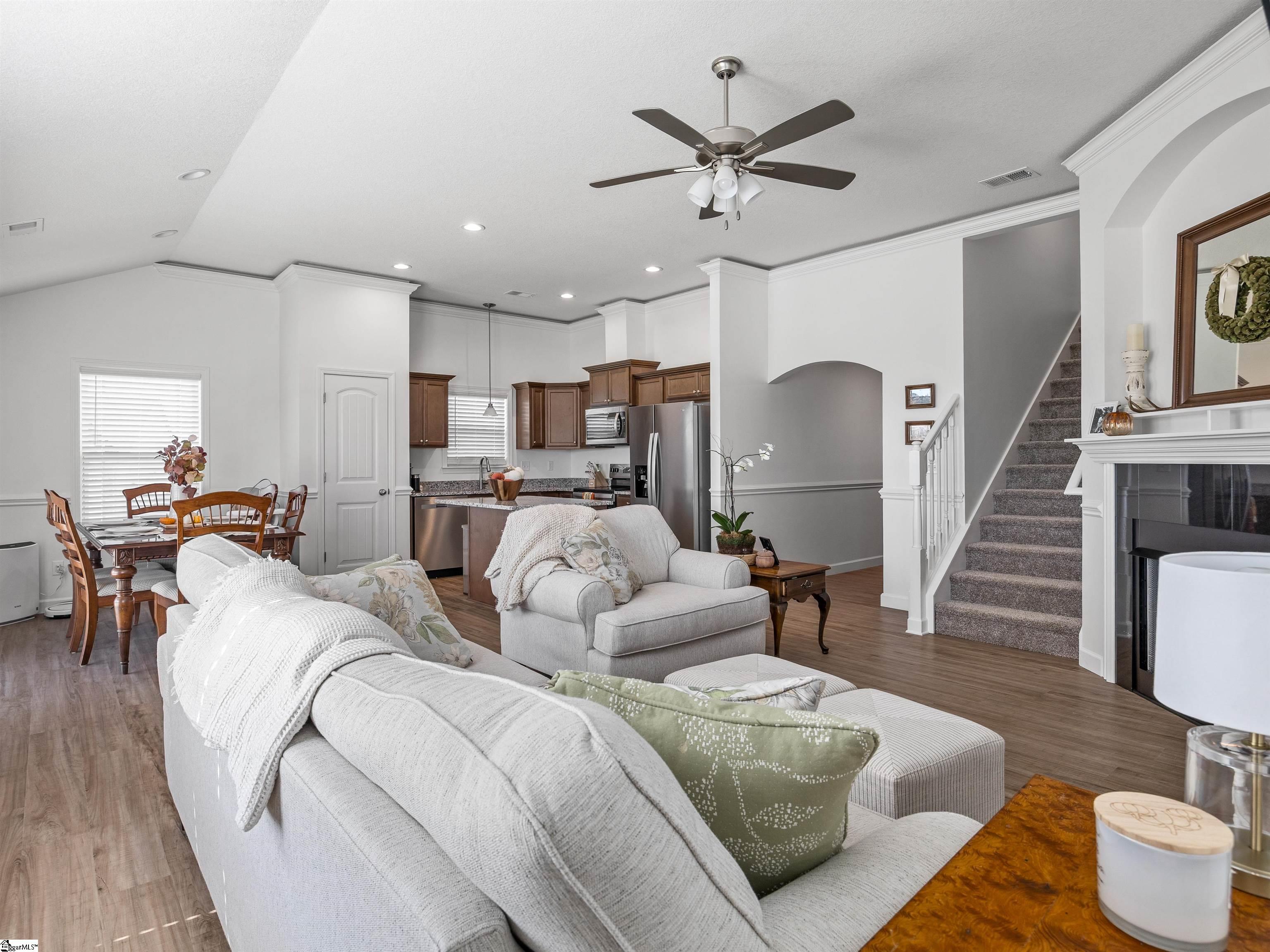 This home is the Bishop plan plus, meaning 3 bedrooms and 2 full baths down and 1 bedroom and 1 full bath up as well as a flex room up. On the main level in addition to the great room is a 9x6 area for office work or smaller sitting area. The floor plan is open with a gas log fireplace perfectly situated in the great room. Off of the dining area is a covered patio as well as an 12x10 uncovered patio. The solid surface counter tops and counter space are part of a well designed kitchen area that overlooks the great room. The location is very convenient to most of your everyday needs. Set up a viewing today.