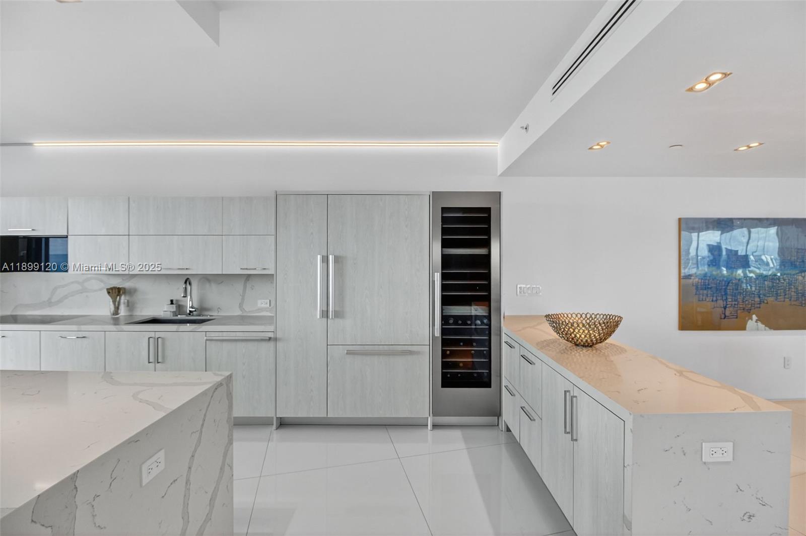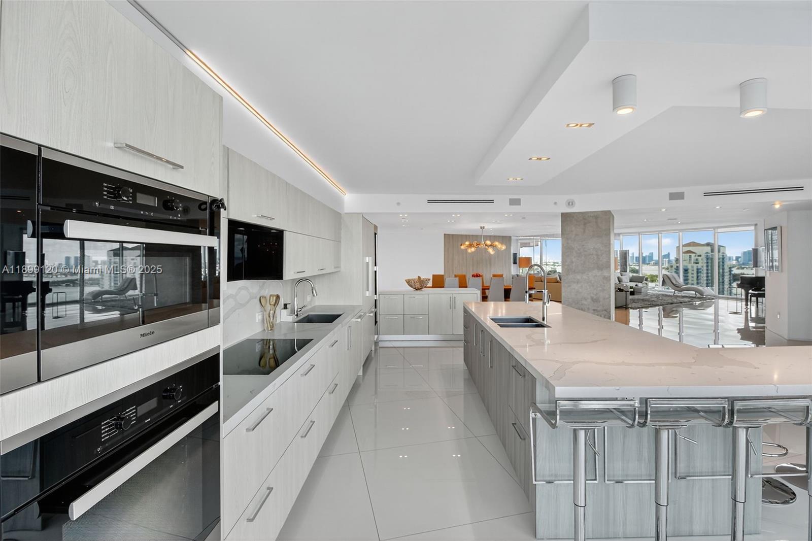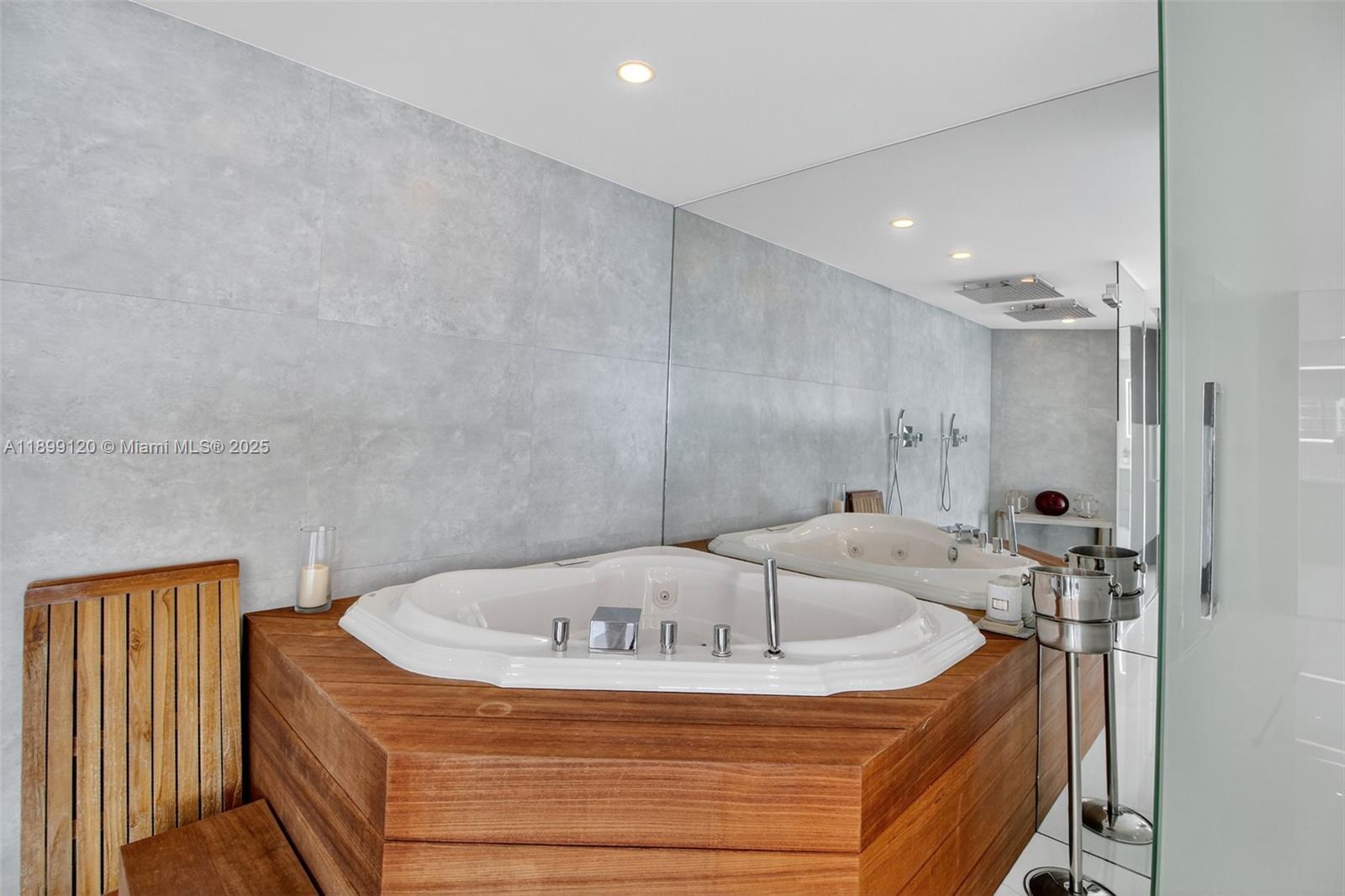 One of a kind, a dream home in the sky! 2-floor residence, boasting 5, 450 SqFt to easily accommodate any special event or entertaining occasion. Mega sized flow-through living room and open kitchen with a bridge encased in glass leading to an 800+ SqFt panoramic Great Room. Endless direct views of the Atlantic Ocean, Biscayne Bay, Miami Skyline, and South Beach both day and night with incredible sunrises and sunsets. The lower floor of this townhouse offers all 3 bedrooms, providing excellent privacy and separation of space. The master bedroom overlooking the ocean offers his and hers bathrooms and closets, spa-like bathroom including a double rain shower and separate large jacuzzi tub with an ocean view.