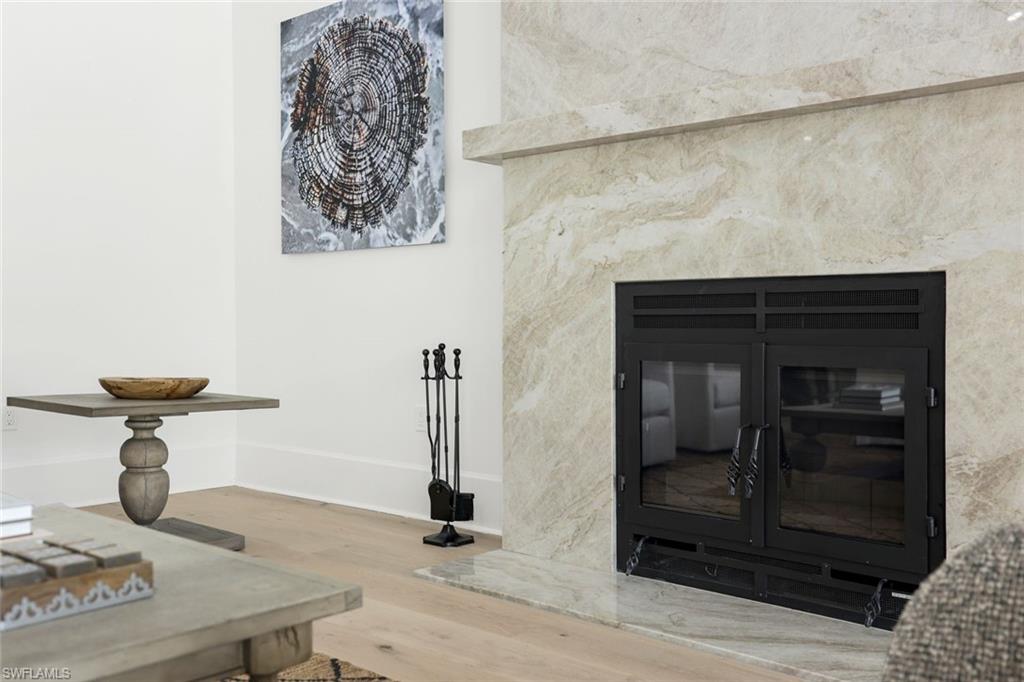 outdone, the adjacent living area stands tall with a beautiful fireplace elegantly faced in