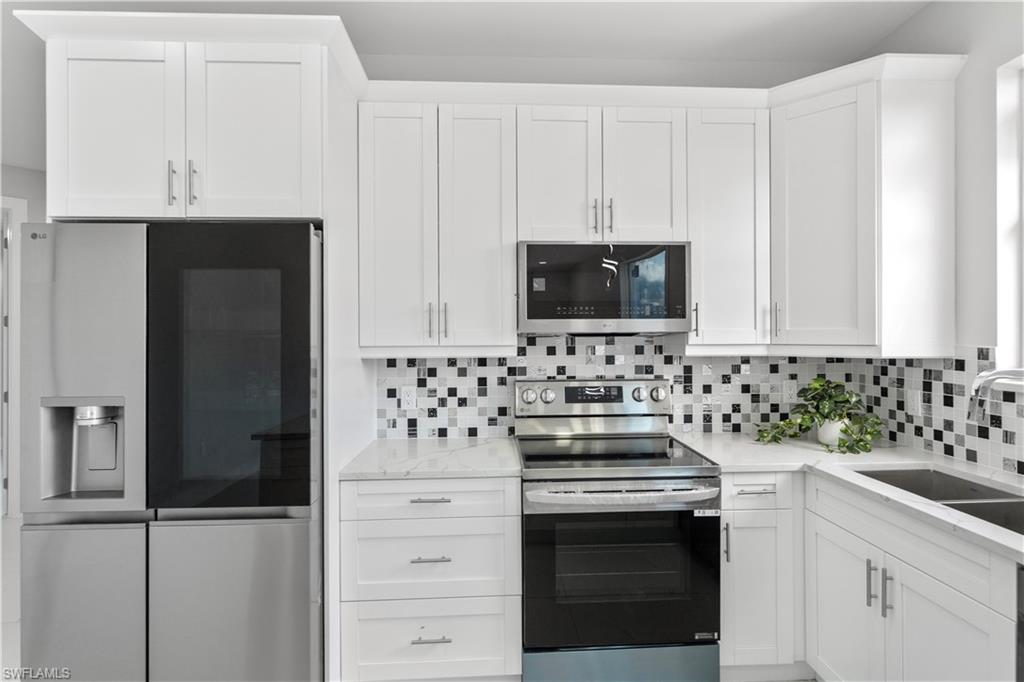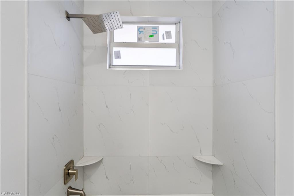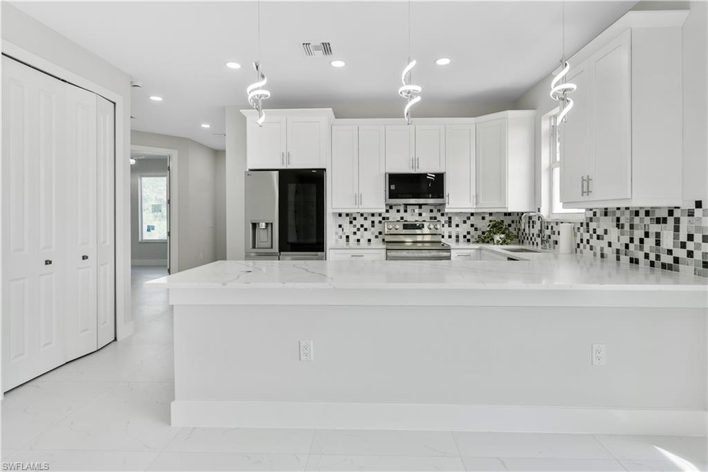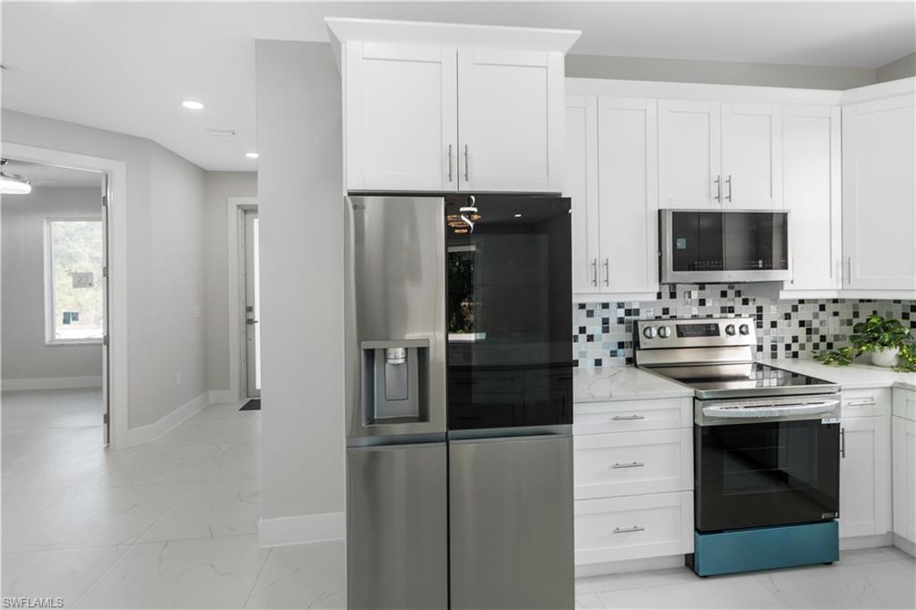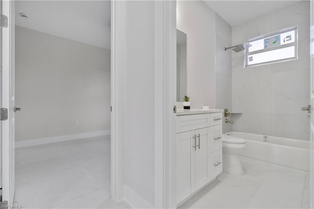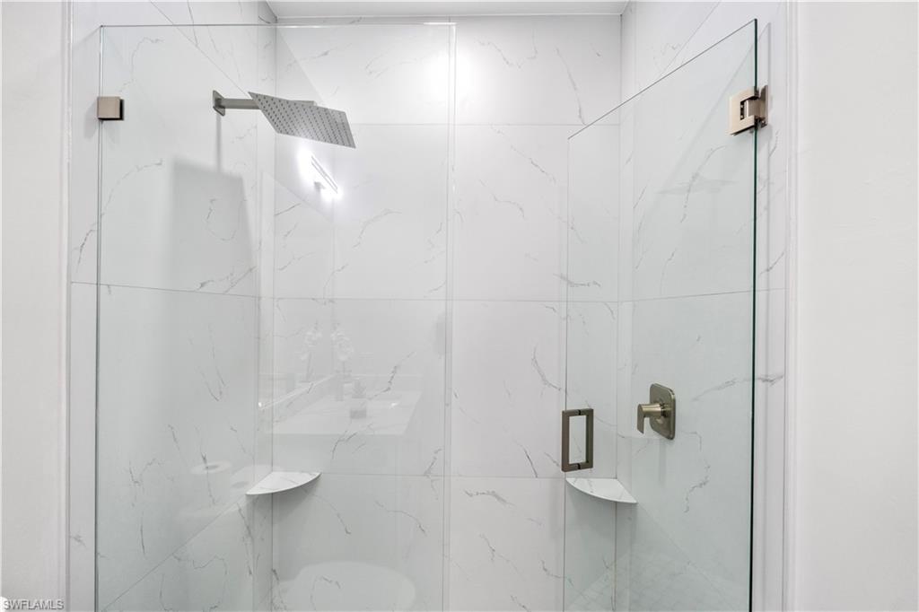 Enjoy elegant porcelain tile flooring throughout, stylish baseboards, and textured walls with crisp white ceilings. The gourmet kitchen offers wood cabinets, quartz countertops, stainless-steel appliances (fridge, range, microwave, dishwasher), and a premium stainless steel undermount sink. Bathrooms are finished with quartz vanities, modern cabinetry, and designer tile—highlighted by a frameless glass shower in the master suite and a tub/shower combo in the guest bath.