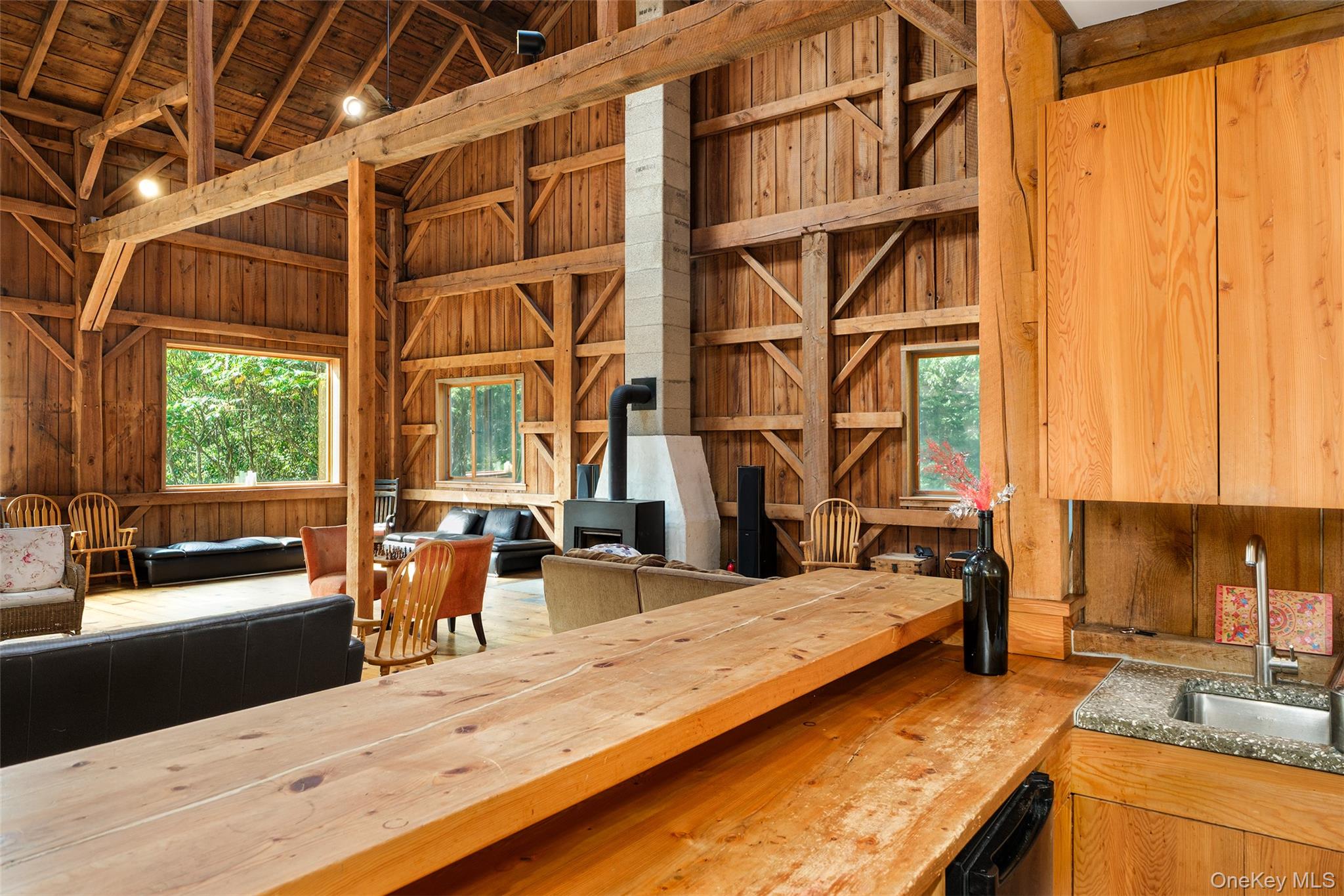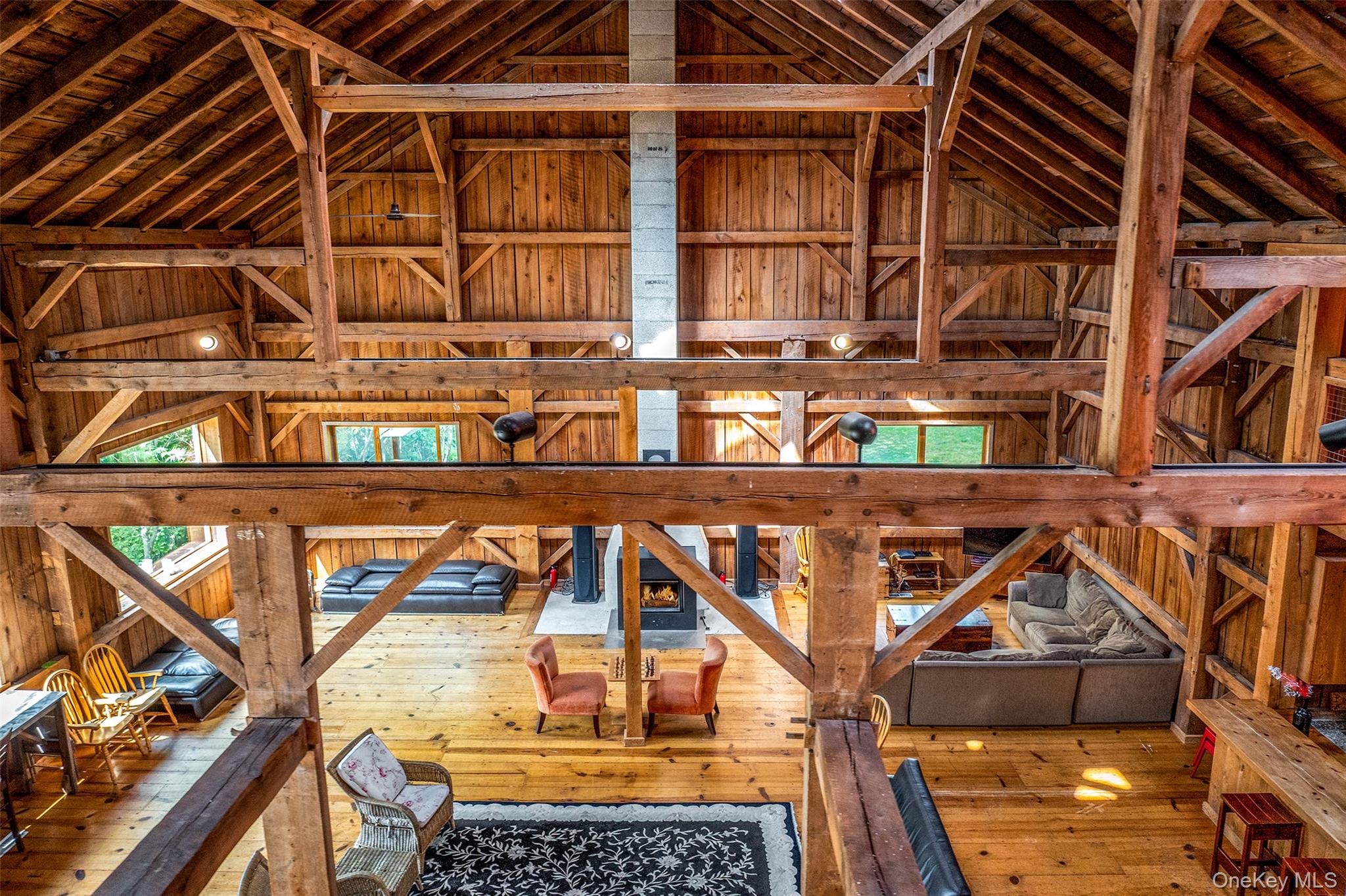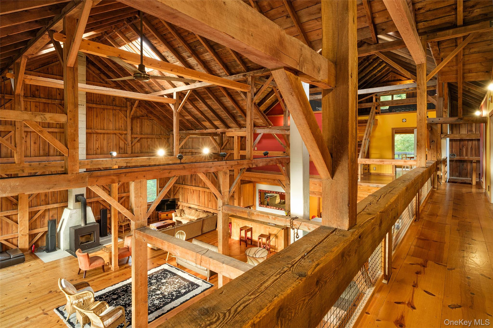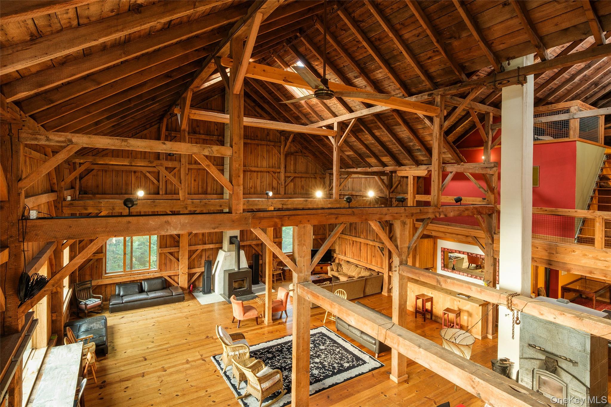 When the world becomes all too much, and the day's burdens have taken their toll on your soul, the drive to your private mountain retreat will cleanse you and reframe your perspective to a more peaceful view. Set within a breathtaking mountain bowl in the Vega Valley of Roxbury, NY, the spectacular setting of this 4+-bedroom, 3-bath residence combines historic character with modern luxury. Beginning life as part of the Stewart family farm more than a half mile lower on the mountain, this classic dairy barn, was built by hand in 1886. Through a feat of unprecedented engineering, the 80-ton barn was hauled, along with the 40 tons of steel beams holding it up, through the forest and up the mountain to its present site in 1990. (Read more about the move below. ) Preserving its architectural heritage and cathedral-like grandeur, the open-concept floorplan leaves massive original beams, traditional charm and expert craftsmanship exposed in the 30 foot high central great room. Modern amenities throughout the home turn a rustic frame into a truly luxurious experience. Highlights include spa-like bathrooms framed in local bluestone (including two Japanese-style soaking tubs), a chef's dream kitchen with center island cook station, multiple sinks, dishwashers and enormous granite counter space, and an inspired tatami seating area. Stunning picture windows and high-end wood stoves—one with a built-in pizza oven -- add warmth and personality to the magic of this incredible room. The second level has a fenced railing guiding guests to one of the 4 bedrooms on the floor, while creative ships ladders, climb to two crows-nest loft rooms even higher above. Set on 140 acres of private land, the property offers exclusive hiking trails, unmatched seclusion, and a deep connection to nature—an increasingly rarity in this region. The flexible layout suits a range of lifestyles, from full-time residence to wellness retreat, corporate escape, or short-term rental income. Just minutes from the towns of Margaretville, Roxbury, Andes, Bovina, Delhi and Phoenicia, the home provides easy access to dining, shopping, and cultural experiences. Plattekill Ski ( 9 miles), Belleayre Ski ( 13 miles), as well as Windham and Hunter Mountain ski resorts are all frequent attractions. Albany is an hour away and the GWB is under 2. 5 hours. This property is more than a home—it's a living legacy, inviting you to experience the timeless beauty and enduring spirit of the Catskills.