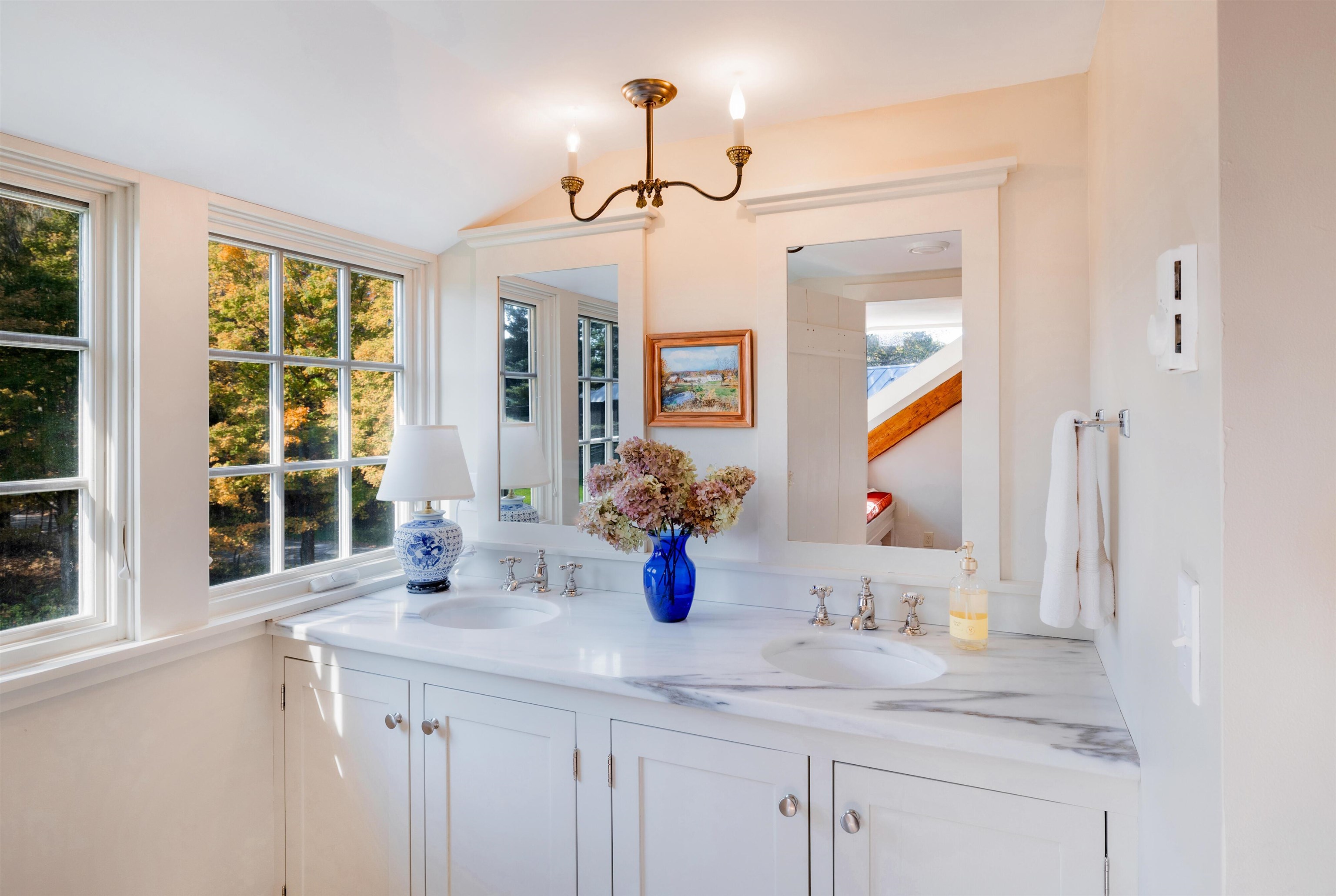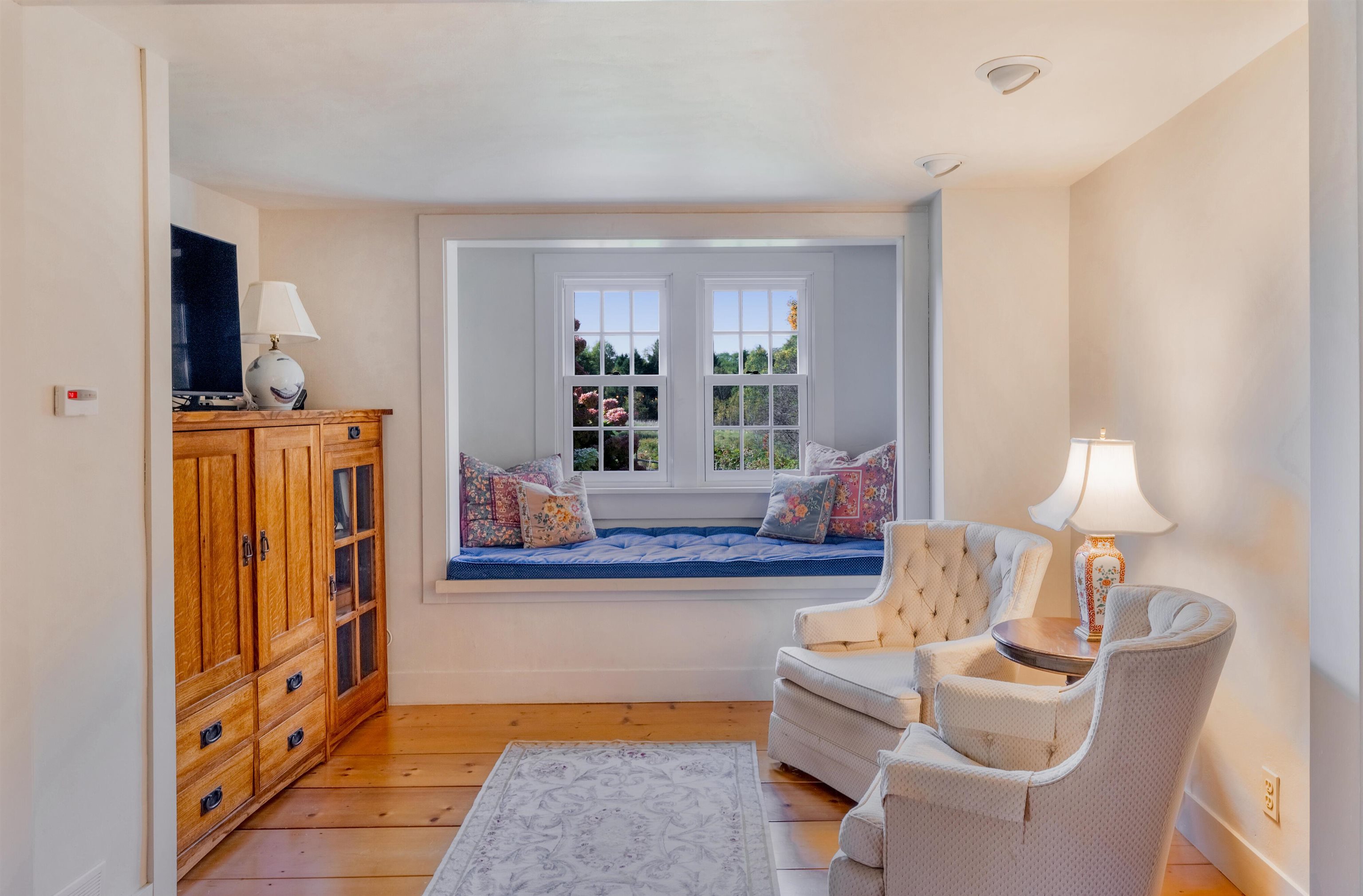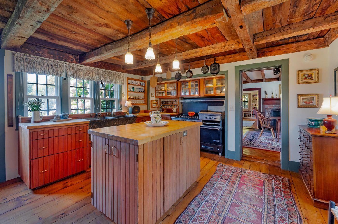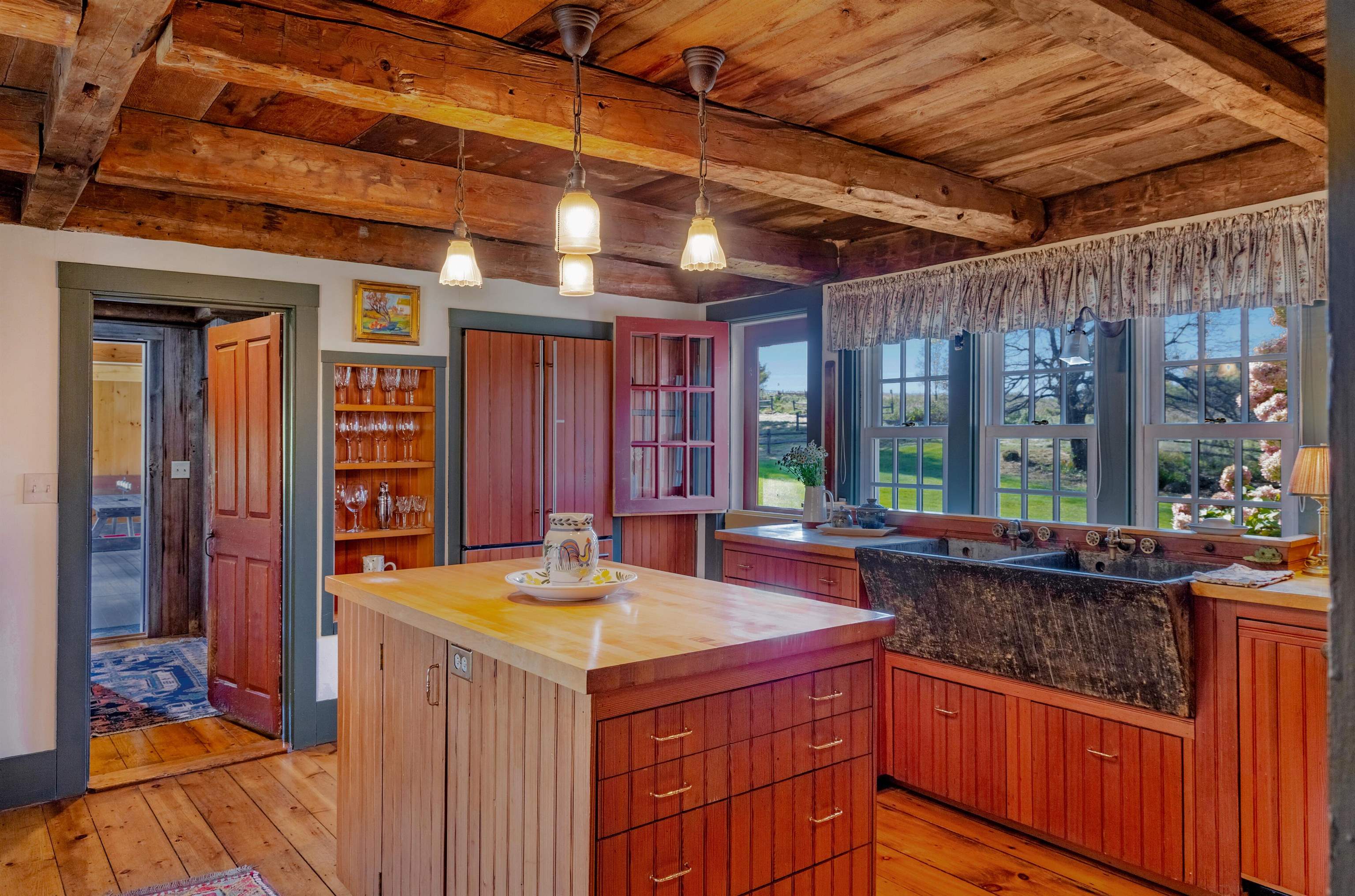 Traversed by historic stone walls and overlooking a high meadow with uninterrupted pastoral views, this fully reimagined antique farmstead is located on 164 private acres in the rural town of Corinth. In a region known for its serene, postcard-worthy hamlets, 706 Dearborn Hill Road includes a mix of gently rolling pastureland, productive grassland, a pond, and mature woodlands with trails. Fully renovated in 2023, the cheerful, 4-bedroom, 4-bath shingled farmhouse offers panoramic views of New Hampshire’s White Mountains to the east and Vermont’s Green Mountains to the west. The home carefully preserves period details, including exposed hand-hewn beams, vintage light fixtures, and original heart pine floors throughout. Inside the gourmet kitchen, highlights include butcher block countertops, a large, soapstone double farm sink, and a fully refurbished vintage Garland range and double oven. Gather around the dining room for formal holiday dinners or quiet family gatherings in the gentle glow of the wood-burning fireplace or curl up with a book in the spacious living room, with its cozy stove, window seat, and built-in bookshelves. This equestrian-friendly property includes a charming one-bedroom apartment with a separate entrance, multiple outbuildings and sustainable features like two water sources, an orchard, and abundant garden space. The VAST trail nearby offers year-round opportunities for hiking, riding, Nordic skiing, and snowshoeing.