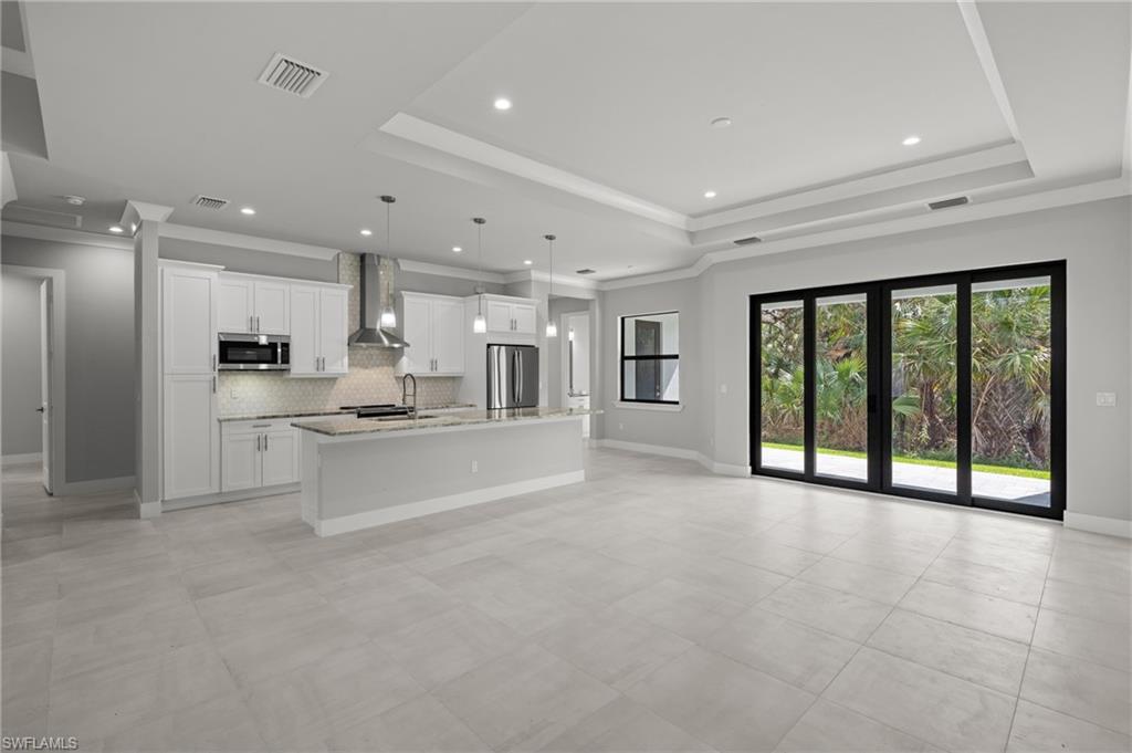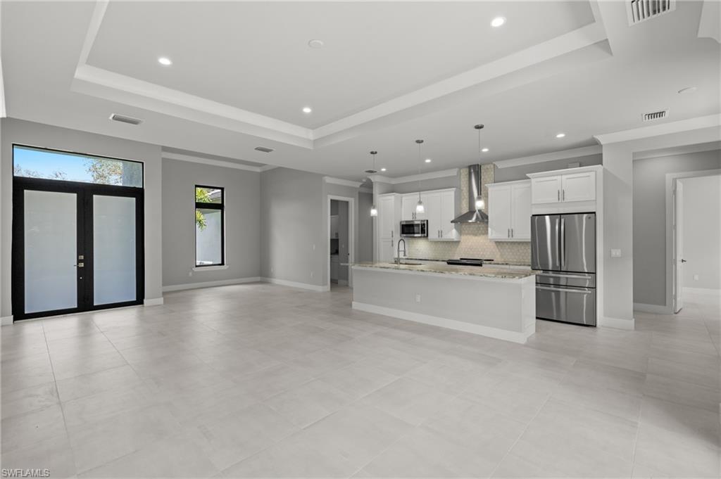 Step through the grand entry and into a bright, elegant living space highlighted by soaring ceilings, oversized windows, and sleek porcelain floors. The heart of the home is the impressive chef’s kitchen featuring LG Profile stainless steel appliances, a large island, and wood semi-custom cabinetry perfect for both everyday living and entertaining.