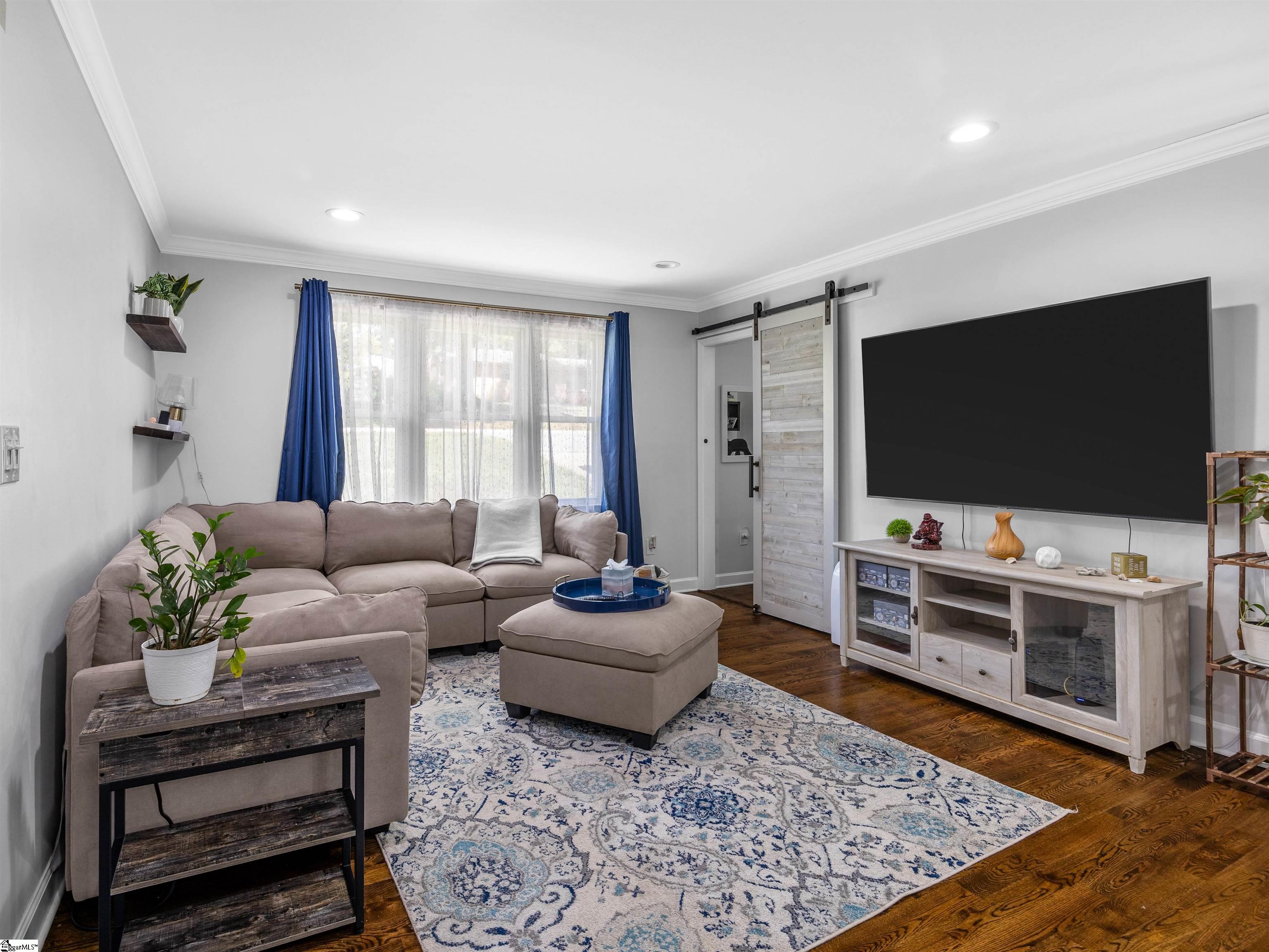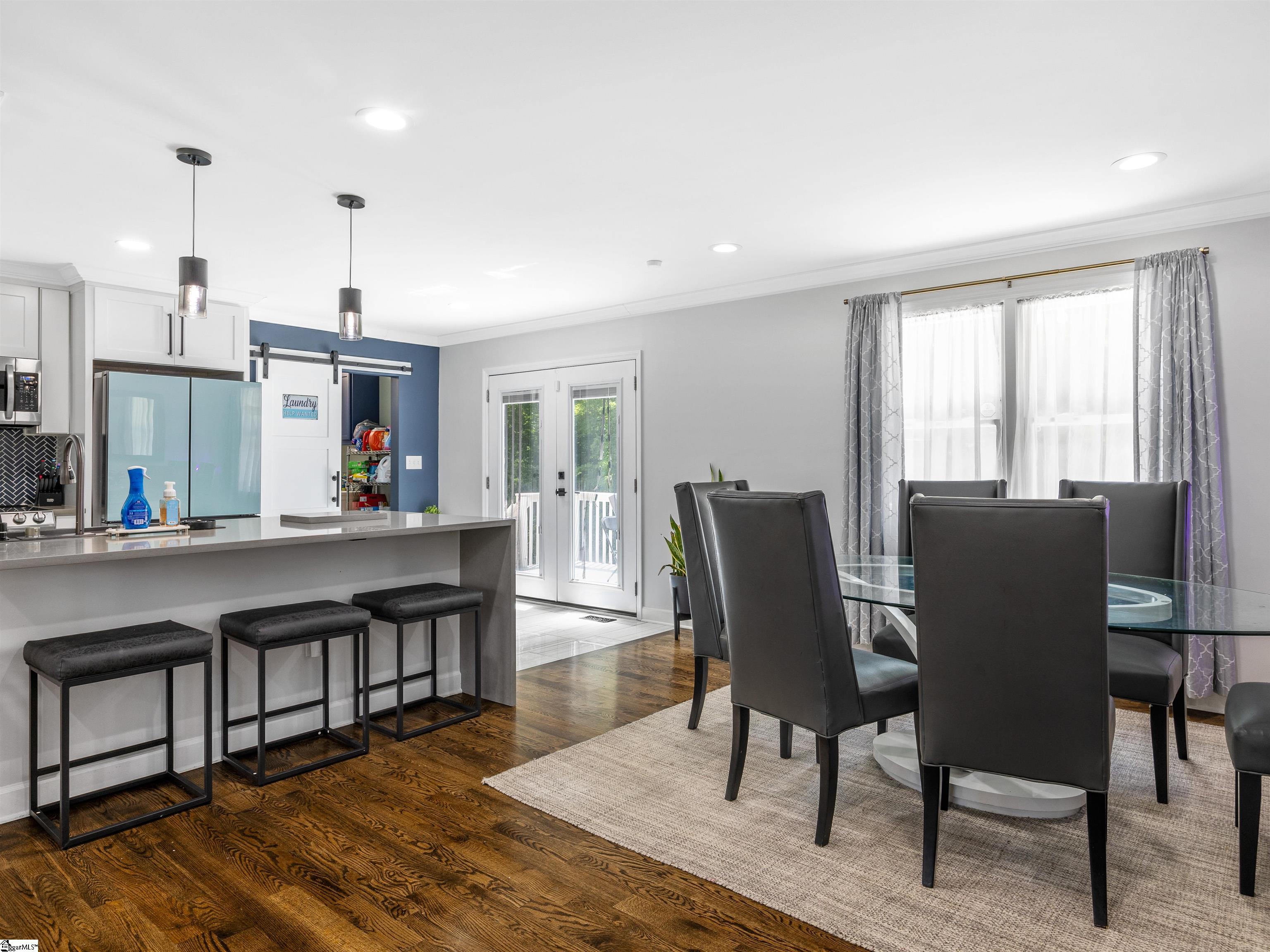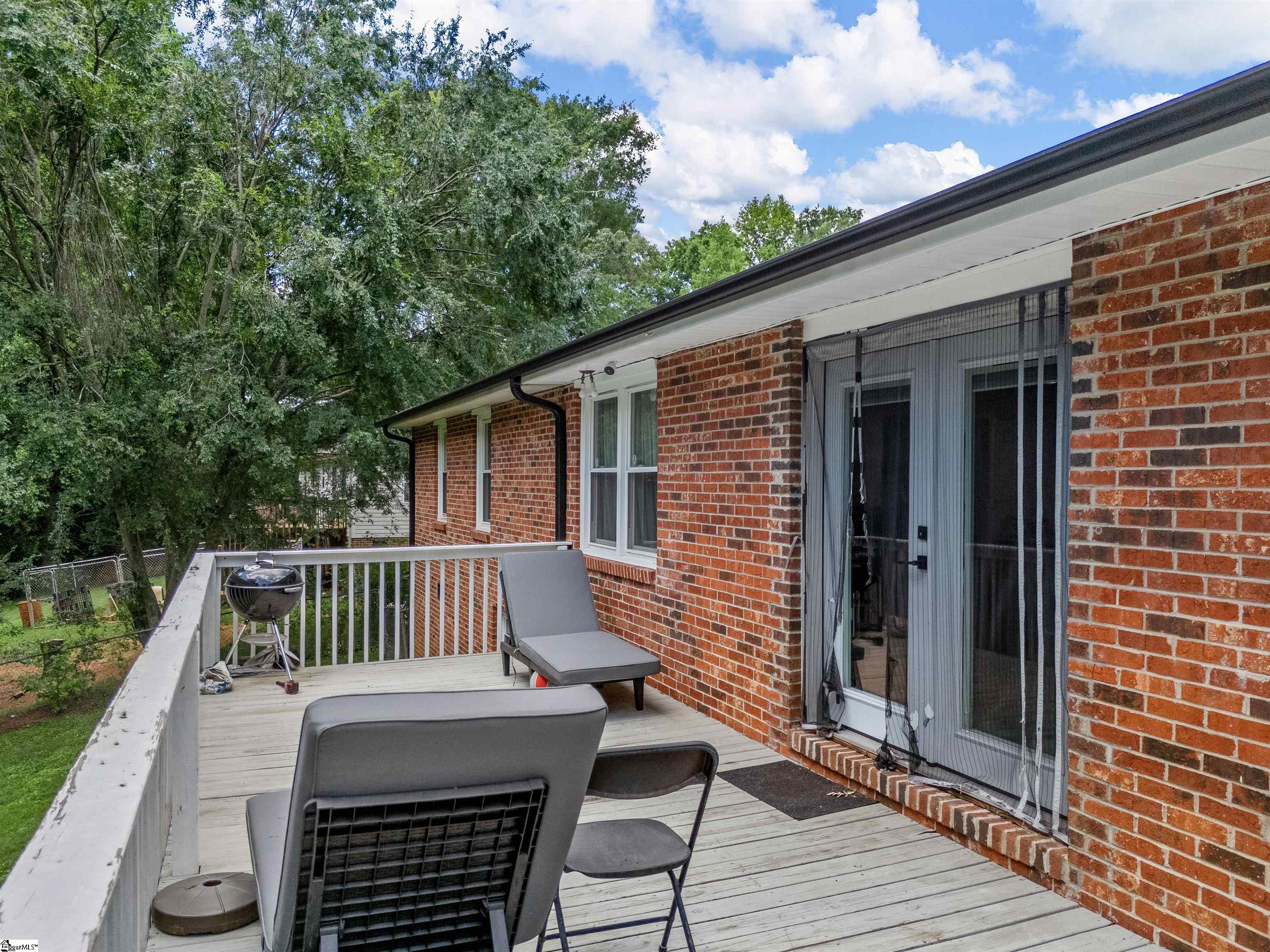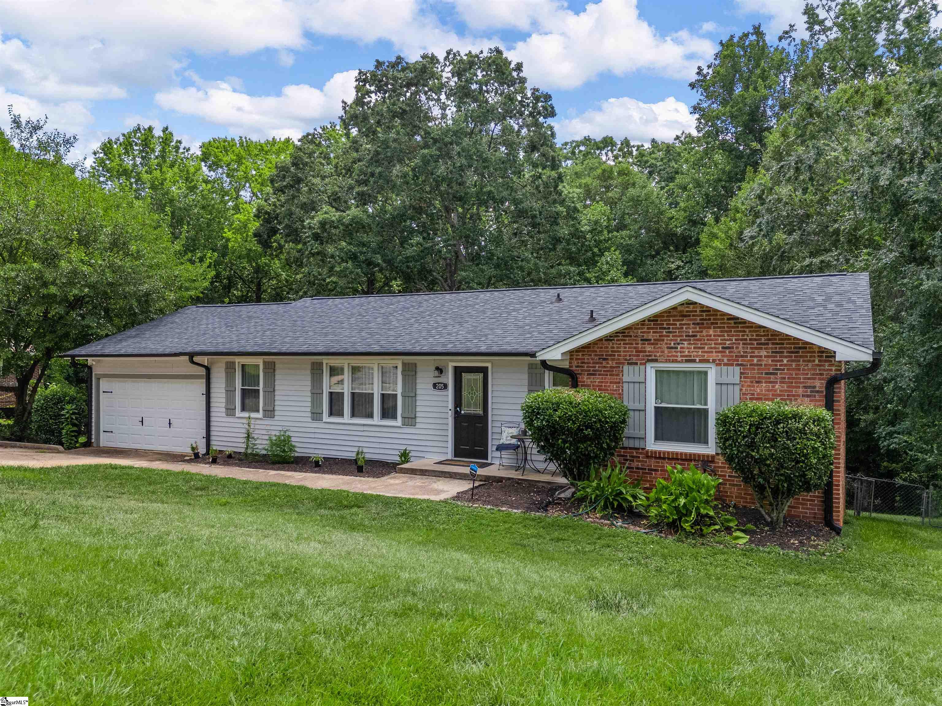 Welcome to this beautifully updated home offering 4 ample bedrooms and 2 stylishly appointed bathrooms, both featuring eye-catching tile work. From the moment you enter, the inviting foyer with coffered wall detailing, rich hardwood floors, and elegant crown molding sets the tone for the upscale finishes found throughout the home. The open-concept living and dining area flows seamlessly into a sleek modern kitchen, complete with a waterfall quartz countertop, large single-basin sink, pendant lighting, and stainless steel stove/oven, microwave, and dishwasher. The expansive bar area offers extra seating, perfect for entertaining or family gatherings. Just off the kitchen, a large laundry room provides space for stackable units, additional storage, and even includes a utility sink, all conveniently located with access to the attached garage. Step outside onto the 25-foot deck, ideal for grilling and relaxing, overlooking a peaceful, fully fenced backyard, perfect for kids, pets, or weekend get-togethers. The secondary bedrooms feature generous closet space and ceiling fans for comfort. The hall bathroom includes a tub/shower combo with dual inserts for soaps and hair products, offering style and function for guests and family alike. Retreat to the spacious primary suite, boasting two closets and a luxurious en-suite bathroom with a large custom-tiled shower and bidet toilet. Enjoy peace of mind with recent updates to HVAC, water heater, electrical, and plumbing. There's nothing to do but move in and enjoy the comfort, storage, and prime location this home offers. Convenient to all that Greenville and the Upstate of South Carolina have to offer.