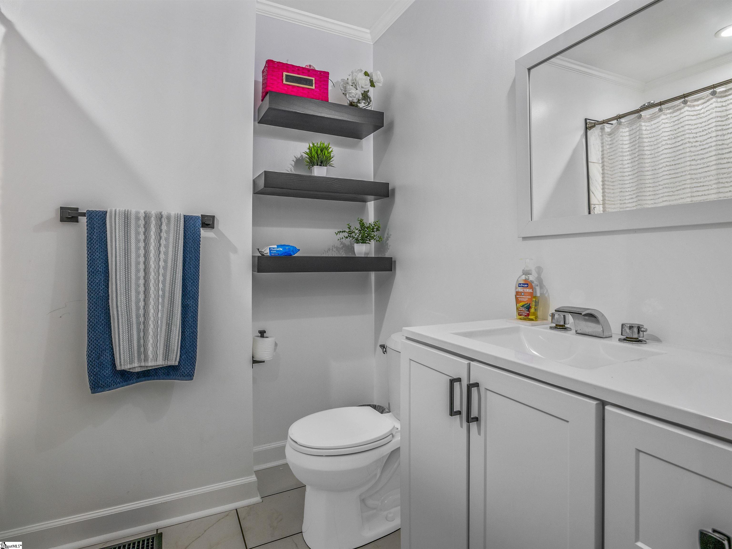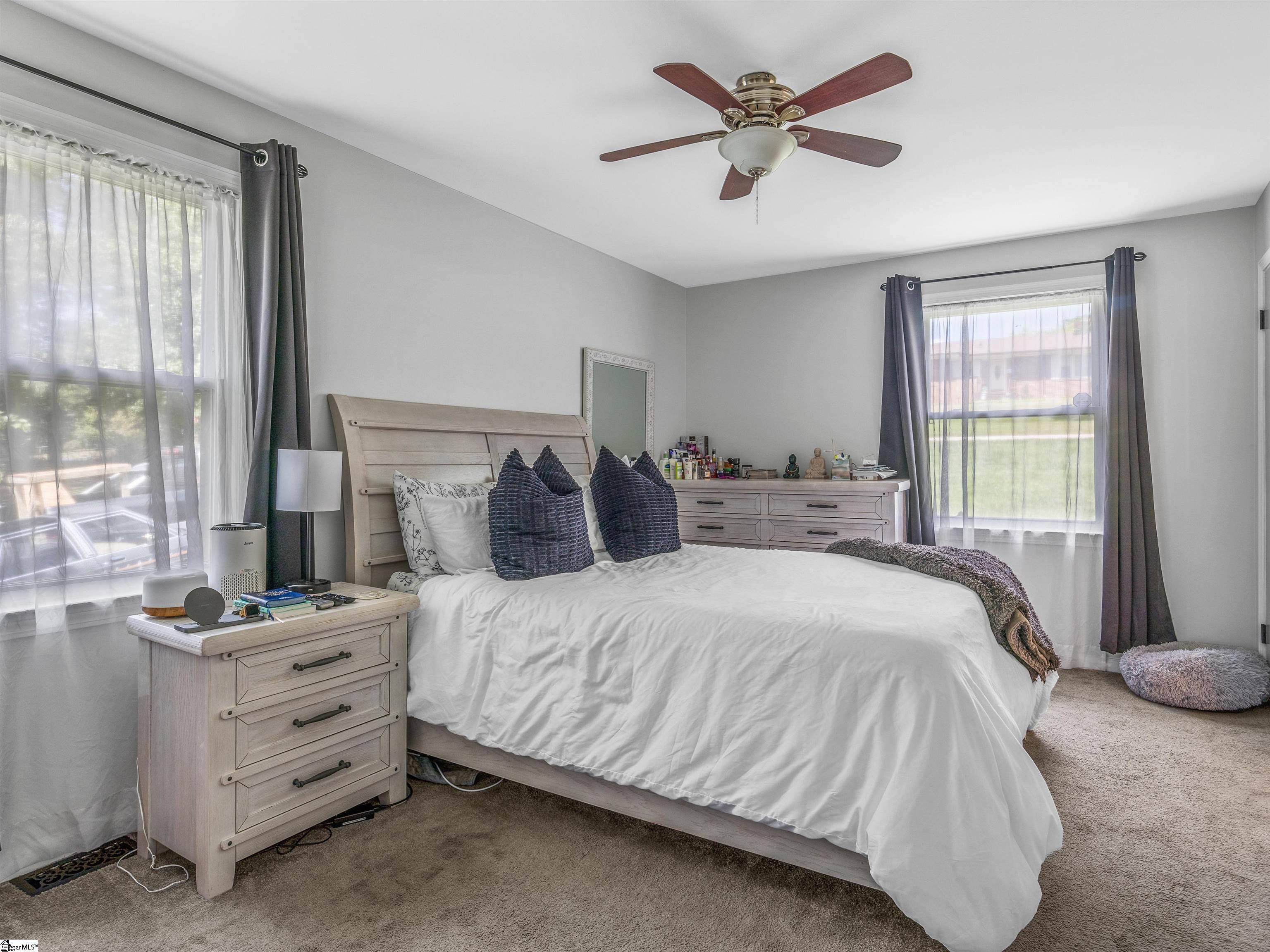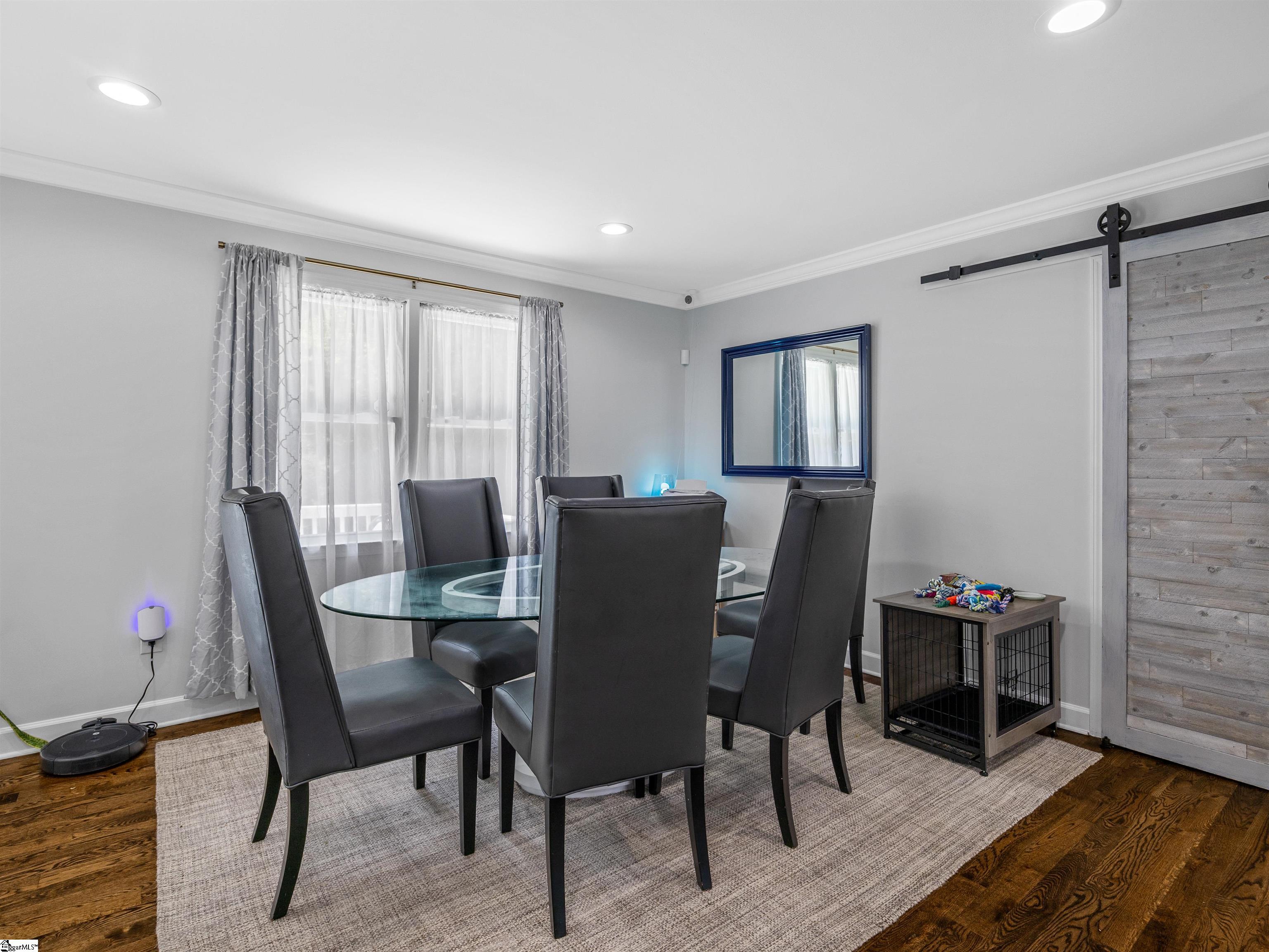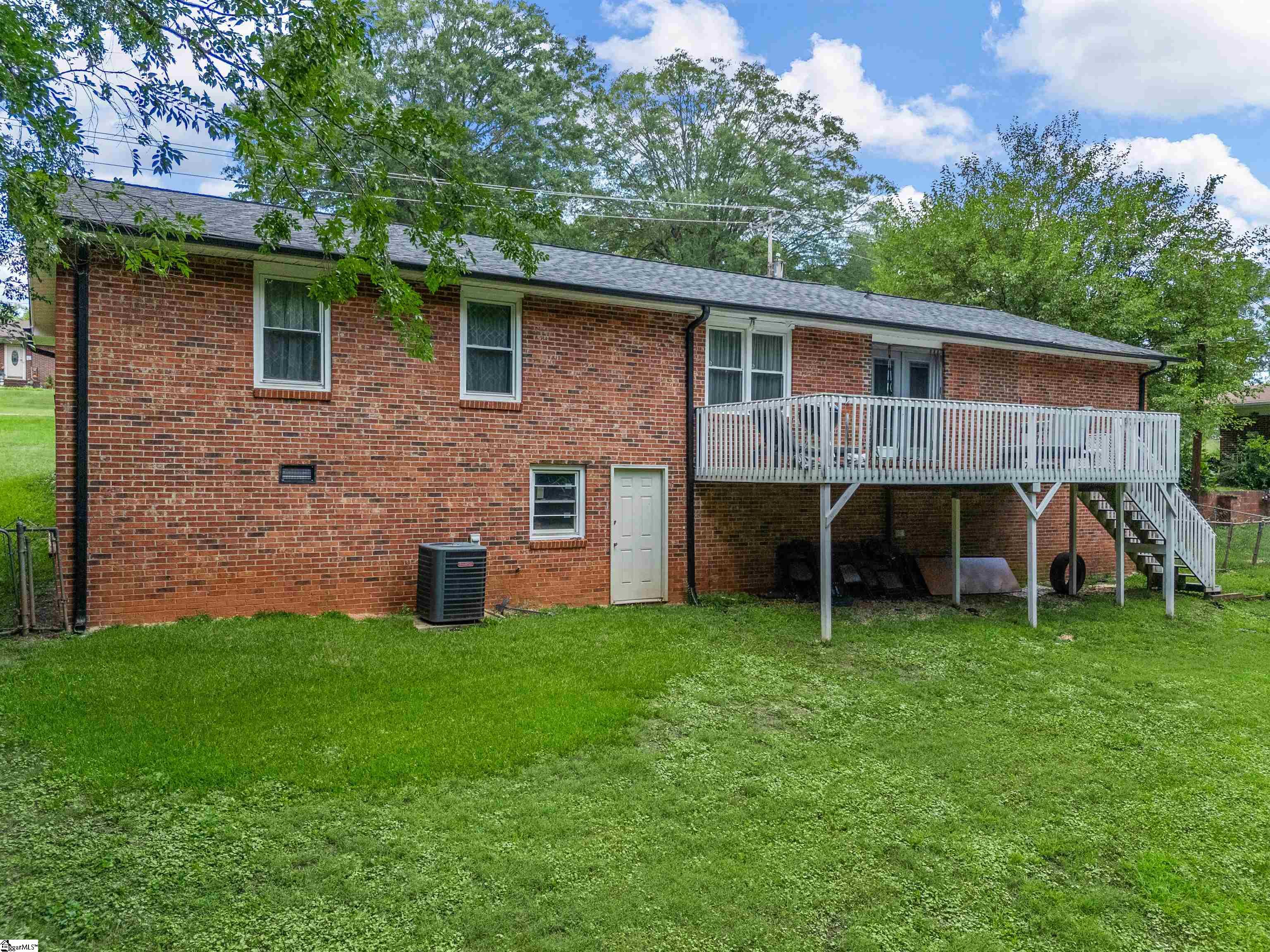 Welcome to this beautifully updated home offering 4 ample bedrooms and 2 stylishly appointed bathrooms, both featuring eye-catching tile work. From the moment you enter, the inviting foyer with coffered wall detailing, rich hardwood floors, and elegant crown molding sets the tone for the upscale finishes found throughout the home. The open-concept living and dining area flows seamlessly into a sleek modern kitchen, complete with a waterfall quartz countertop, large single-basin sink, pendant lighting, and stainless steel stove/oven, microwave, and dishwasher. The expansive bar area offers extra seating, perfect for entertaining or family gatherings. Just off the kitchen, a large laundry room provides space for stackable units, additional storage, and even includes a utility sink, all conveniently located with access to the attached garage. Step outside onto the 25-foot deck, ideal for grilling and relaxing, overlooking a peaceful, fully fenced backyard, perfect for kids, pets, or weekend get-togethers. The secondary bedrooms feature generous closet space and ceiling fans for comfort. The hall bathroom includes a tub/shower combo with dual inserts for soaps and hair products, offering style and function for guests and family alike. Retreat to the spacious primary suite, boasting two closets and a luxurious en-suite bathroom with a large custom-tiled shower and bidet toilet. Enjoy peace of mind with recent updates to HVAC, water heater, electrical, and plumbing. There's nothing to do but move in and enjoy the comfort, storage, and prime location this home offers. Convenient to all that Greenville and the Upstate of South Carolina have to offer.