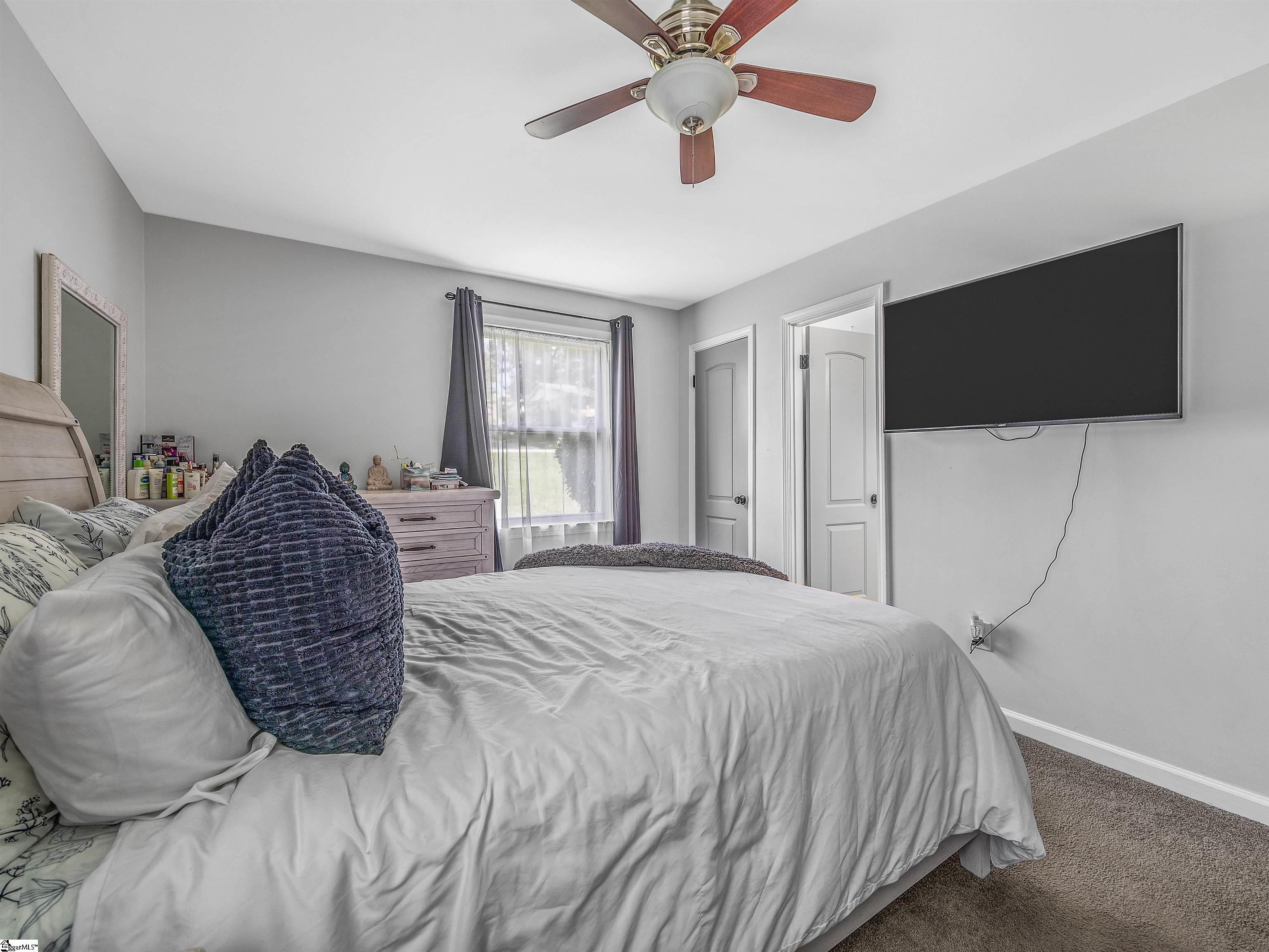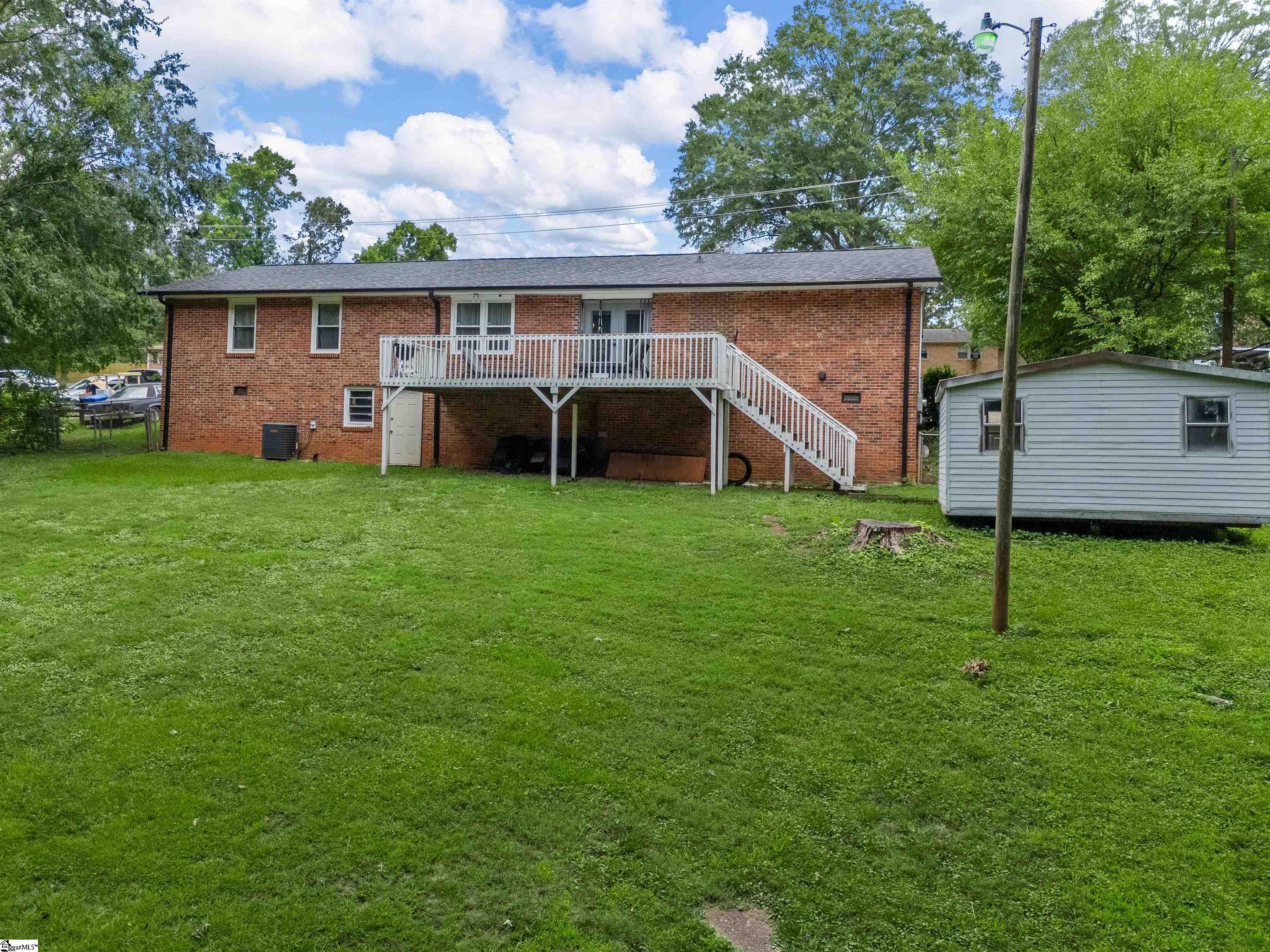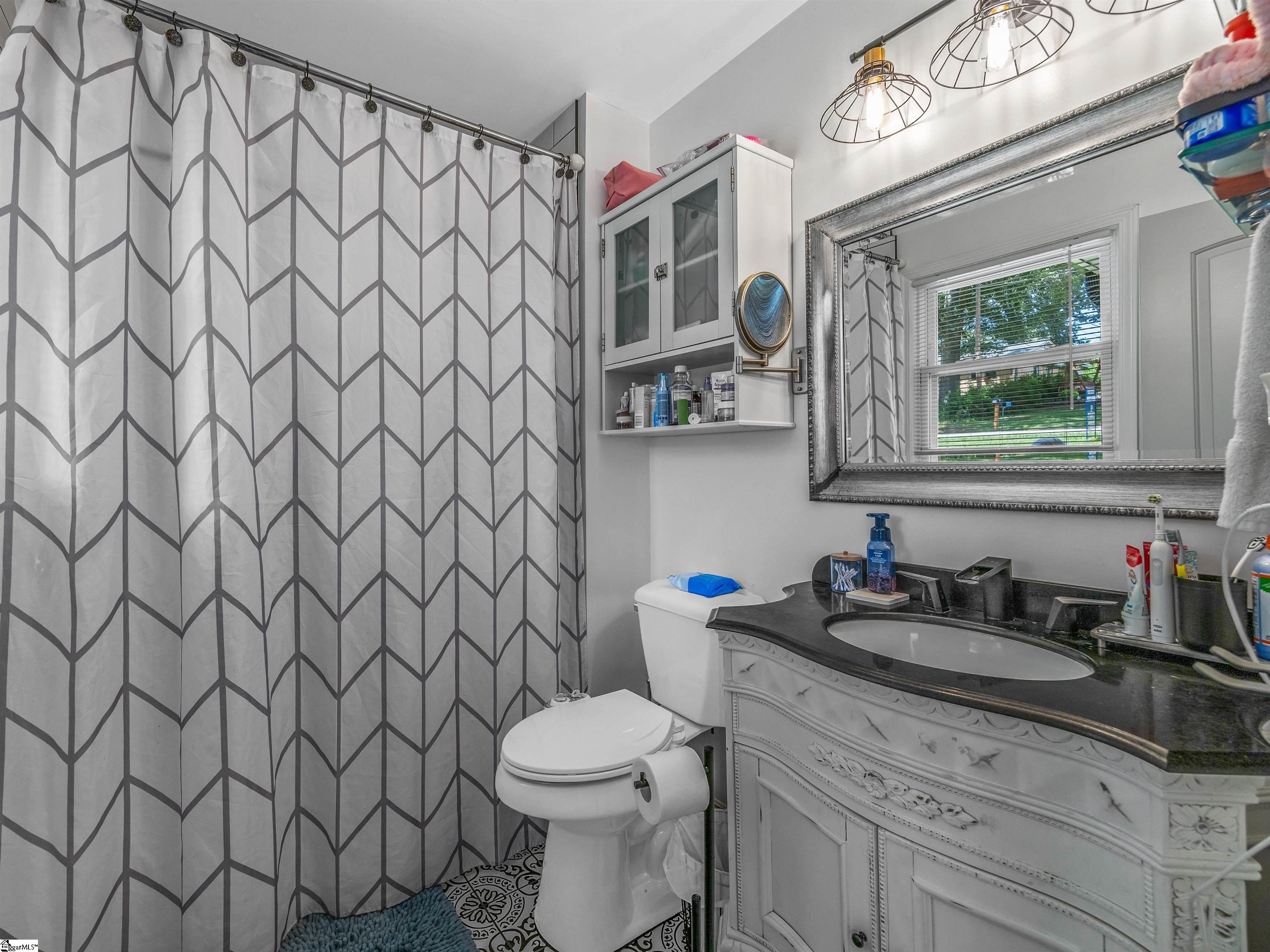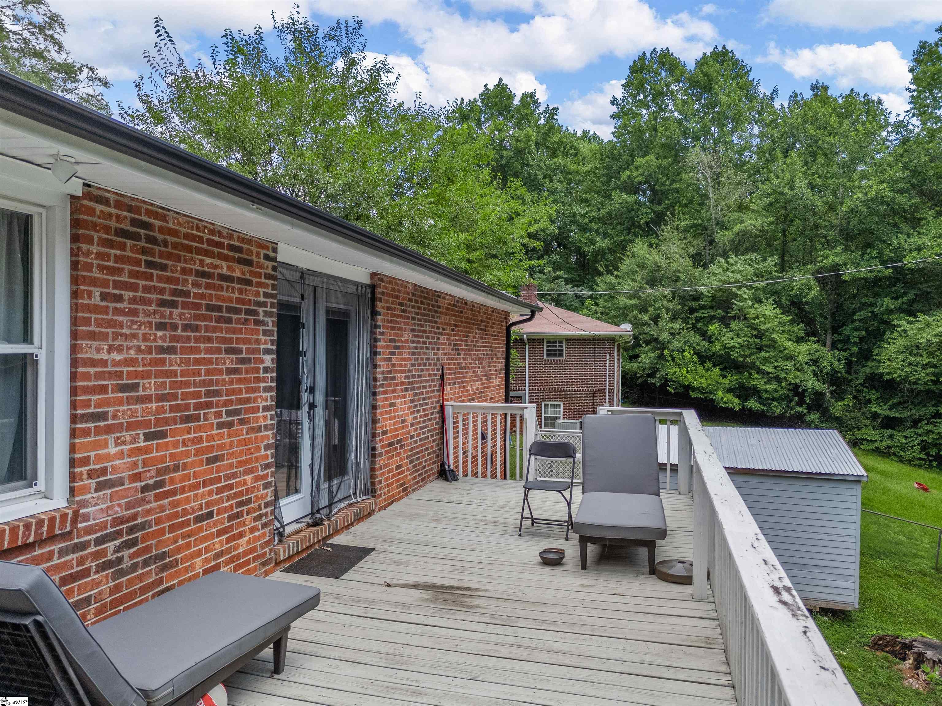 Welcome to this beautifully updated home offering 4 ample bedrooms and 2 stylishly appointed bathrooms, both featuring eye-catching tile work. From the moment you enter, the inviting foyer with coffered wall detailing, rich hardwood floors, and elegant crown molding sets the tone for the upscale finishes found throughout the home. The open-concept living and dining area flows seamlessly into a sleek modern kitchen, complete with a waterfall quartz countertop, large single-basin sink, pendant lighting, and stainless steel stove/oven, microwave, and dishwasher. The expansive bar area offers extra seating, perfect for entertaining or family gatherings. Just off the kitchen, a large laundry room provides space for stackable units, additional storage, and even includes a utility sink, all conveniently located with access to the attached garage. Step outside onto the 25-foot deck, ideal for grilling and relaxing, overlooking a peaceful, fully fenced backyard, perfect for kids, pets, or weekend get-togethers. The secondary bedrooms feature generous closet space and ceiling fans for comfort. The hall bathroom includes a tub/shower combo with dual inserts for soaps and hair products, offering style and function for guests and family alike. Retreat to the spacious primary suite, boasting two closets and a luxurious en-suite bathroom with a large custom-tiled shower and bidet toilet. Enjoy peace of mind with recent updates to HVAC, water heater, electrical, and plumbing. There's nothing to do but move in and enjoy the comfort, storage, and prime location this home offers. Convenient to all that Greenville and the Upstate of South Carolina have to offer.
