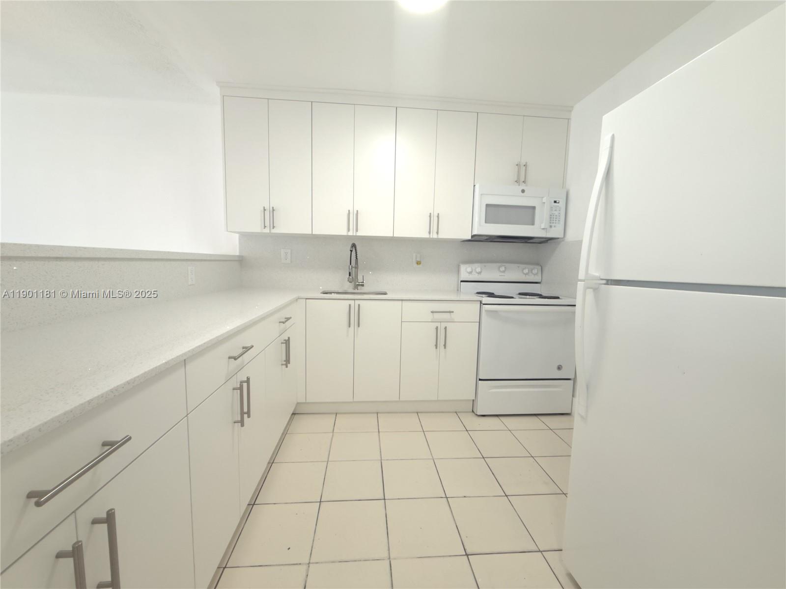 Spacious and updated 2-bedroom, 1 bathroom unit featuring modern white kitchen cabinets, quartz countertops, renovated bathrooms and large open living area with tile floors throughout.