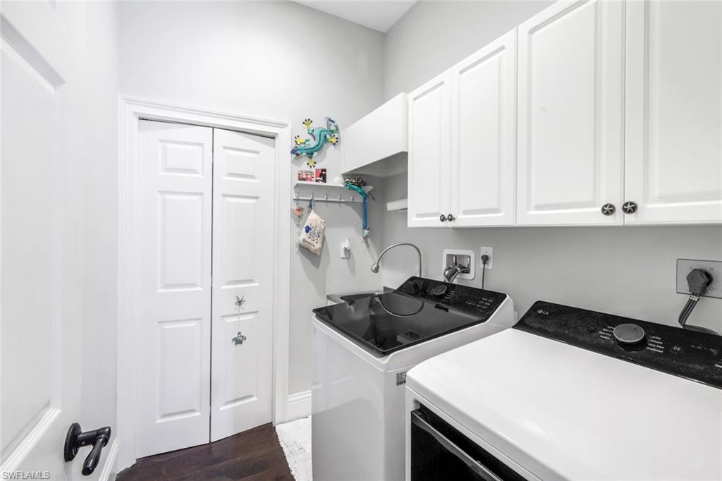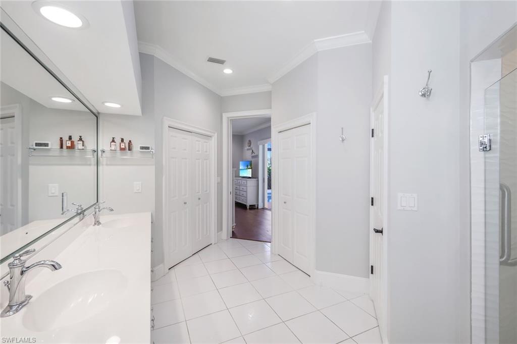 This private villa in the Fountainhead neighborhood overlooks a lake and offers tranquil views. The open floor plan blends living and entertaining spaces with engineered wood and ceramic tile flooring, custom plantation shutters complemented by light Caribbean-inspired colors. The contemporary kitchen features white Quartz countertops, white cabinetry, volume ceilings, and a built-in entertainment center. Volume ceilings enhance the spacious feel of the home, and a built-in entertainment center adds a touch of modern convenience. Outdoor amenities include a large lanai, heated caged pool and spa, privacy walls, and tropical landscaping. The master suite has direct access to the lanai and pool, Master bath features dual sinks, a garden tub, separate shower, and two walk-in closets. A second bedroom has its own bath, and a den with French doors that can serve as a third bedroom. Conveniently located near I-75, shops, restaurants, and just minutes from the beach and 5th Avenue, this home is a unique opportunity in a desirable community. The furnishings are negotiable, making this relaxing, beautiful, and quiet getaway an exceptional opportunity in one of the area's most sought-after communities.