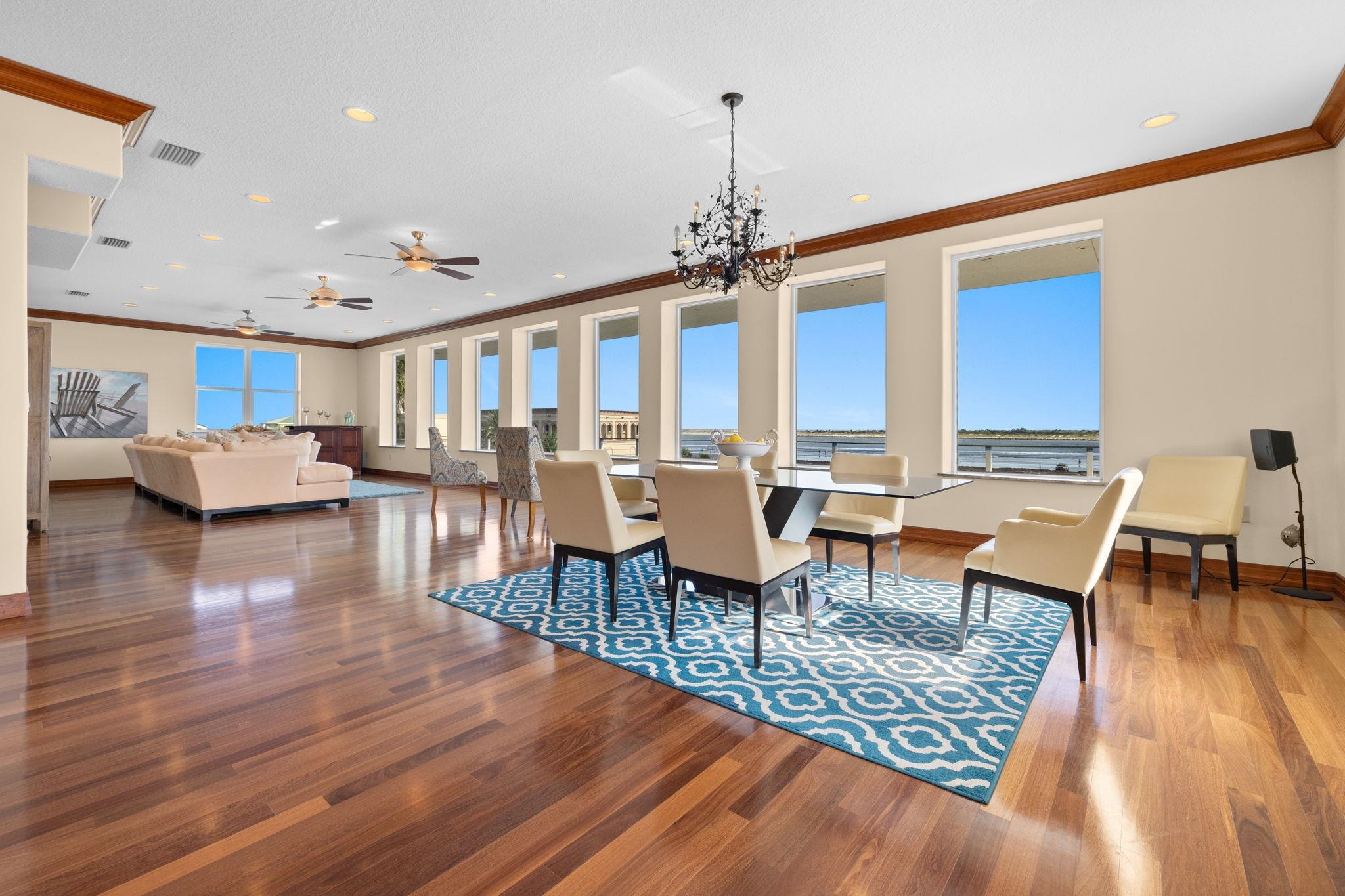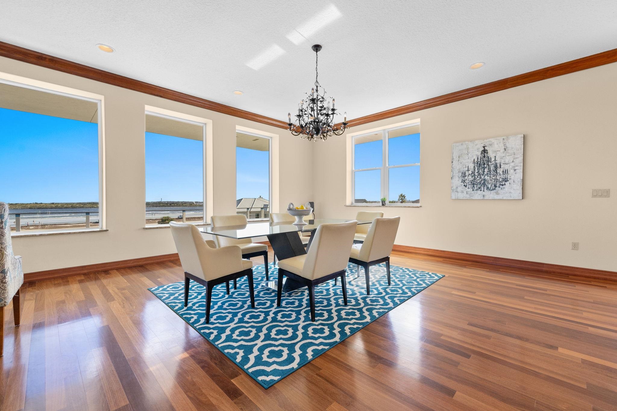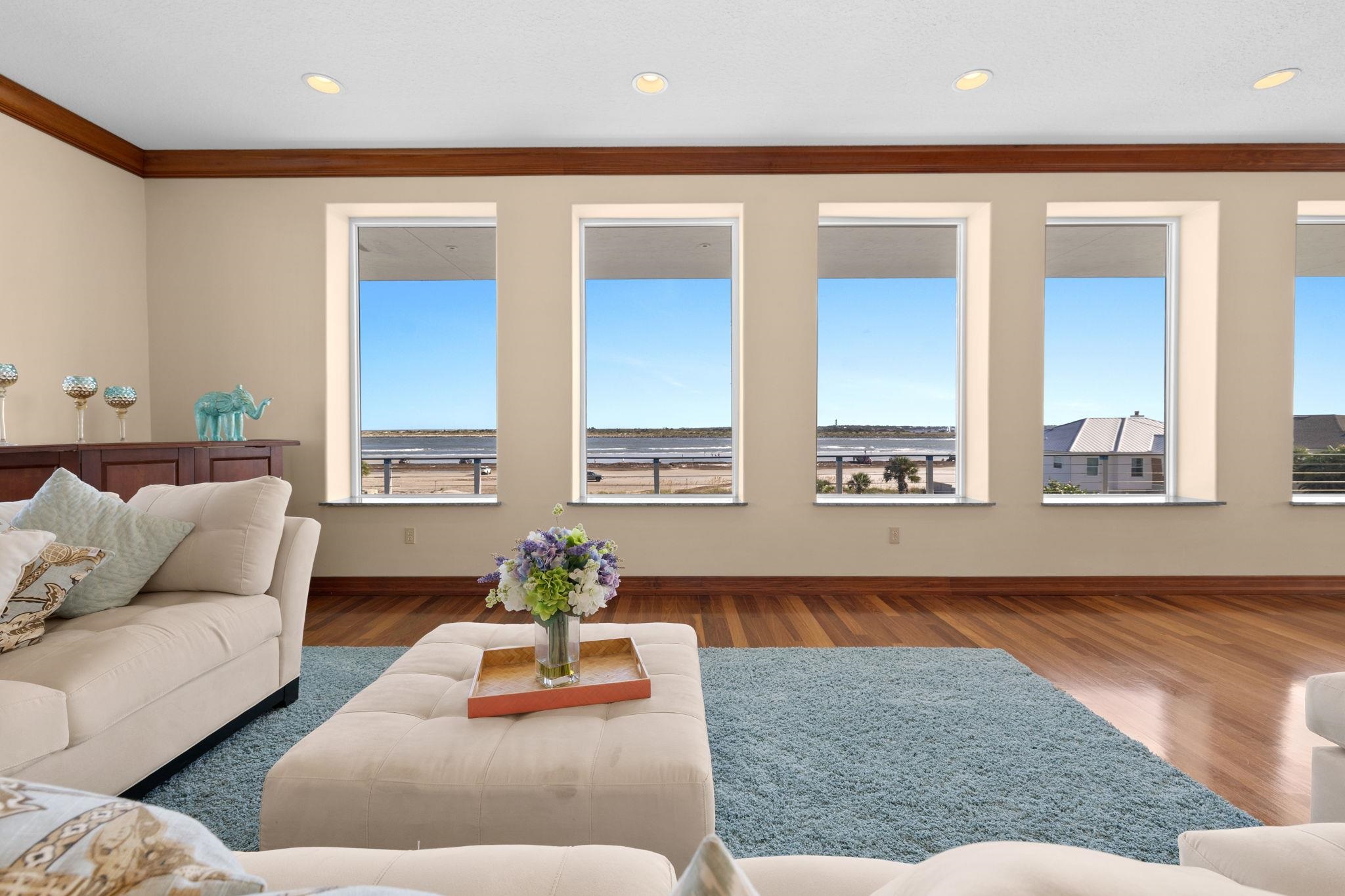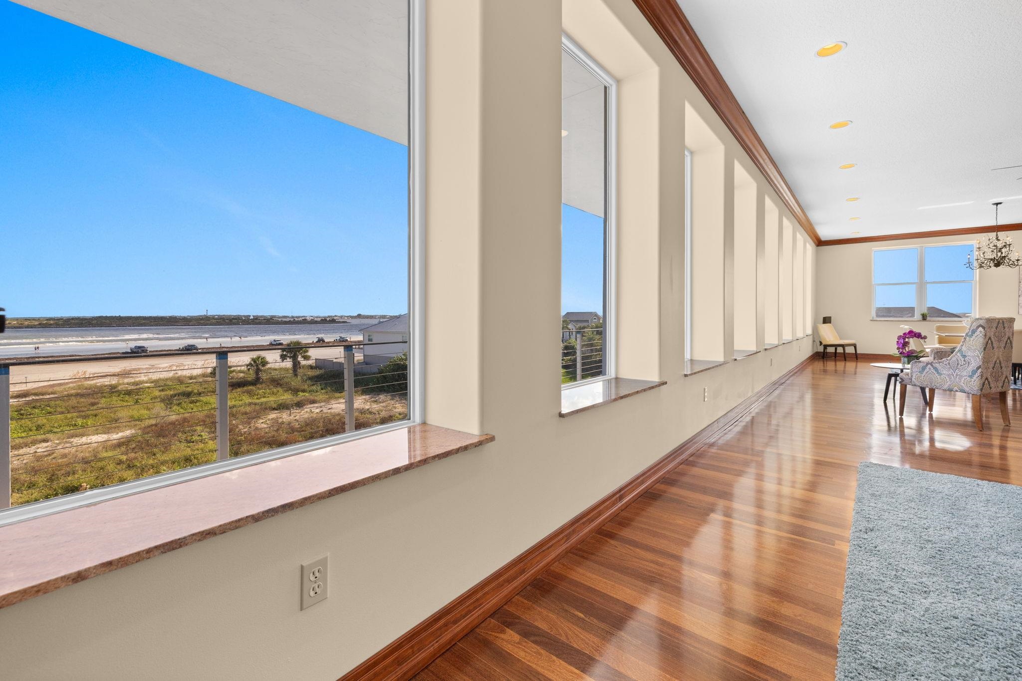 Beach front living at it's finest! 360 views of the ocean, intracoastal waterway and historic downtown views. This home stands as a testament to elegance. Stone façade and wood overhang greet you as you enter the winding paver stone wrap around driveway with 4 car tandem garage. Mahogany wood leaded glass door welcomes guests with the inviting embrace of a sunlit entry foyer. Tiled floors stretch out beneath your feet, leading the way into a spacious guest suite complete with attached bathroom and full kitchen. A second room on the first floor ideal for a home office or theater off the foyer finishes the first level. The hardwood stairs and wrought iron bannisters take you to the second story and four additional suites. Four bedrooms with en-suite bathrooms and new energy efficent doors with full side windows for easy access to the wrap around balcony from anywhere on the second floor, allowing copious amounts of sunlight to embrace the rooms. The guest suites include two closets each and the two oceanfront primary suites include massive room size walk in closets. Jetted bath tubs, showers with river rock floors with double vanities compliment the ocean view twin suites. Central vacuum system and intercom in every room of the home. Full size elevator makes traversing the different levels effortless. Heading up to the third floor you are welcomed to the main living area with oversized custom windows that flood the space with direct light framing picturesque views of the surrounding ocean and beach. A full library with built-ins and high end surround sound system make the perfect theatre room or just to project music throughout the entire home. A chefs dream kitchen features two Maytag refrigerators, 2 dishwashers, 2 ranges, 3 ovens, a bread warmer and trash compactor. a 26 foot long wet bar or butlers service area. 30 foot Walk in Pantry with wall to wall cabinets for storage and two additional full size freezers sit directly behind the kitchen and extended wet bar. A spiral stair case leads to an additional 1500sq ft. rooftop perfect for enjoying the scenic views of historic Saint Augustine, intracoastal waterway and ocean. Electric already on the rooftop to turn this outdoor area into the perfect entertaining space on the highest lot and tallest home in Porpoise Point!