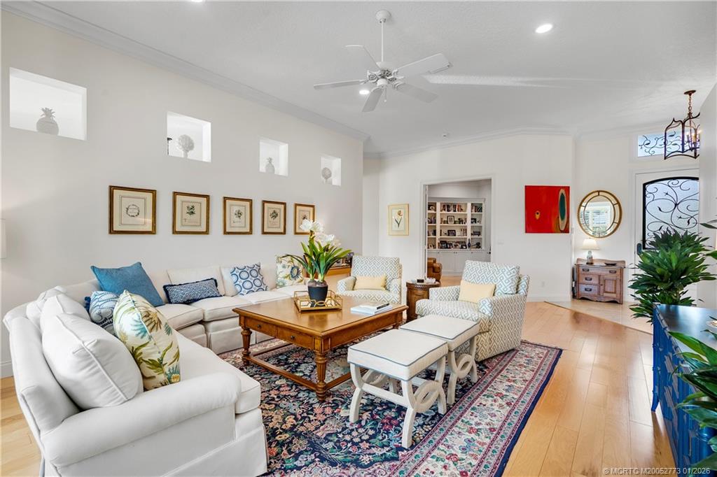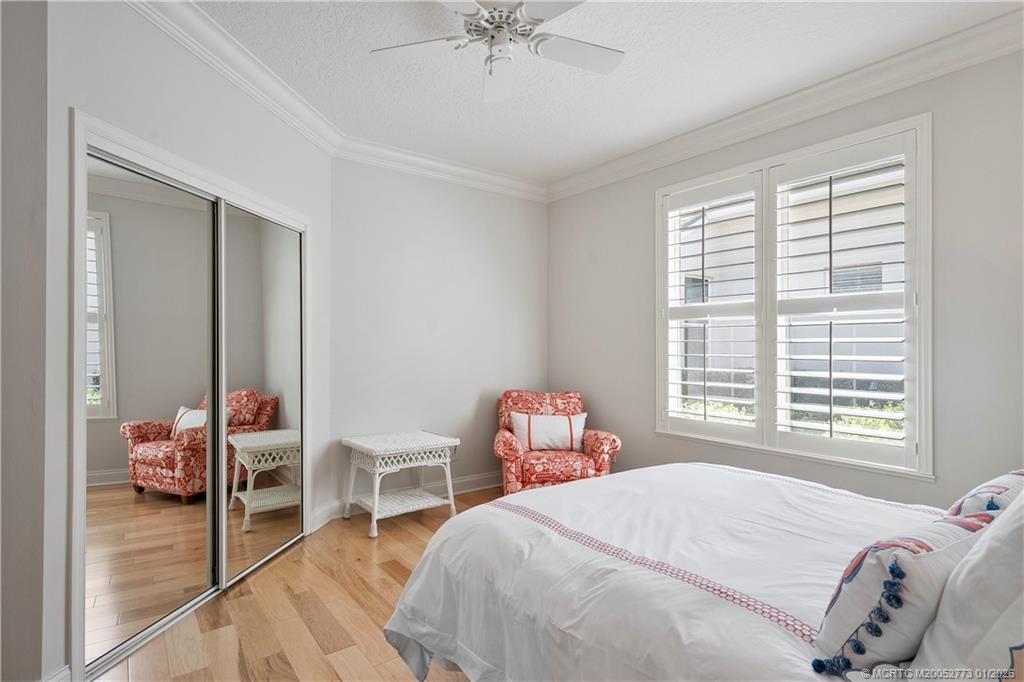 Exuding timeless sophistication and modern comfort, this elegant 3-bedroom 3-bathroom residence with den, showcases exquisite craftsmanship and serene lake and golf course views. The gourmet kitchen is a chef's dream, featuring custom Schlabach cabinetry, quartz countertops, KitchenAid stainless appliances, and a Wolf gas cooktop. The master suite is a true sanctuary, offering a spa-inspired bath with Rohl fixtures, a walk-in shower, and custom cabinetry. Light pours through impact glass windows accented by plantation shutters and crown molding throughout. Enjoy the inviting Florida room or entertain on the paver patio with a built-in grill amid lush, European-inspired gardens. Additional features include a 2-car garage plus golf cart entry, and full-house generator for uninterrupted power. Nestled within the renowned Willoughby Golf Club, Stuart’s premier private community, residents enjoy an exceptional lifestyle. A one-time $50, 000 Social Membership contribution is due at closing.
