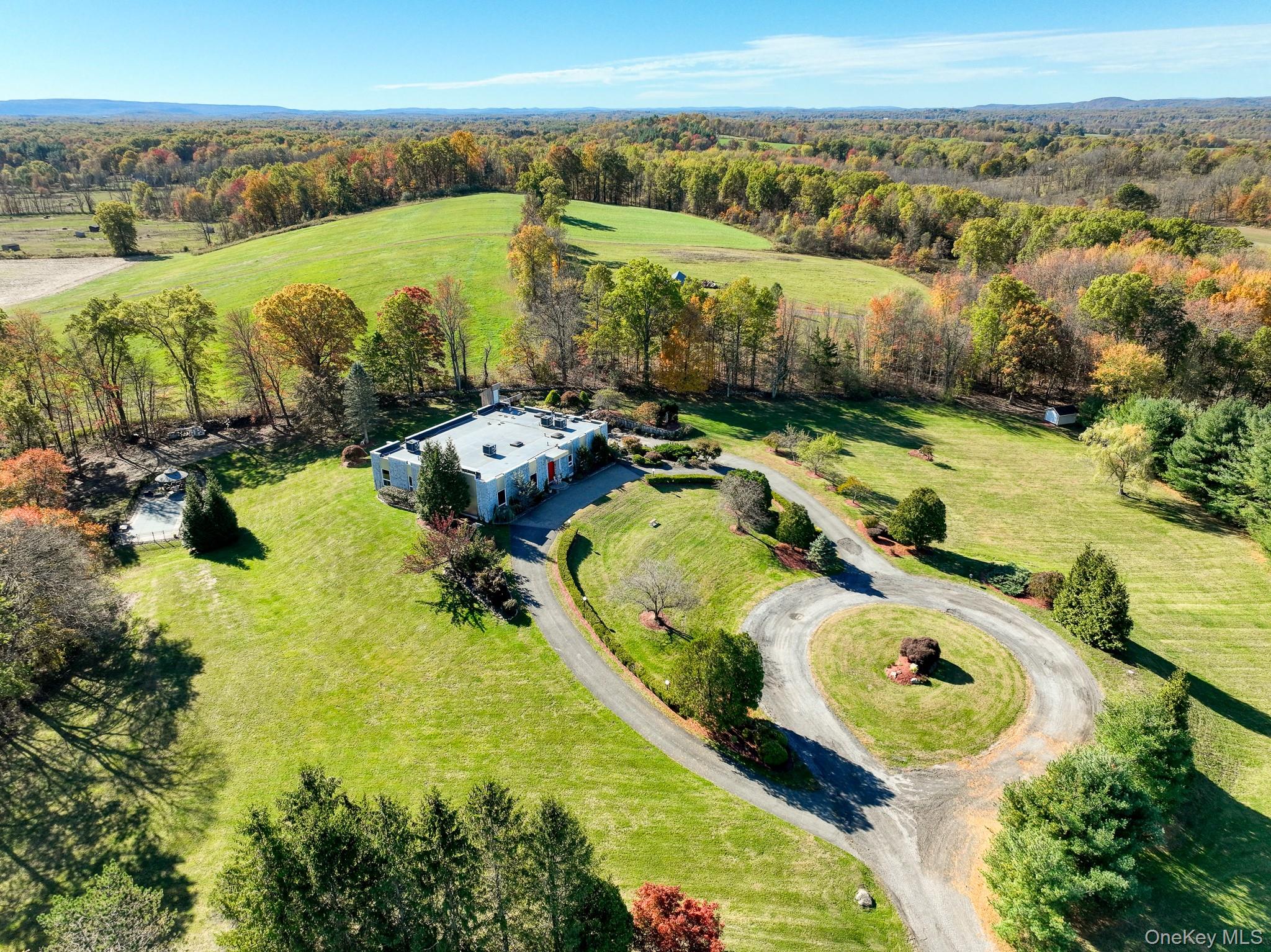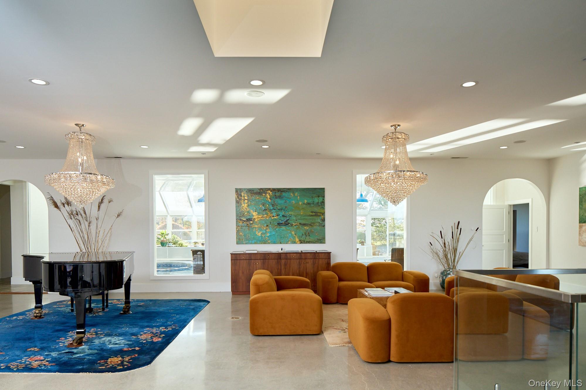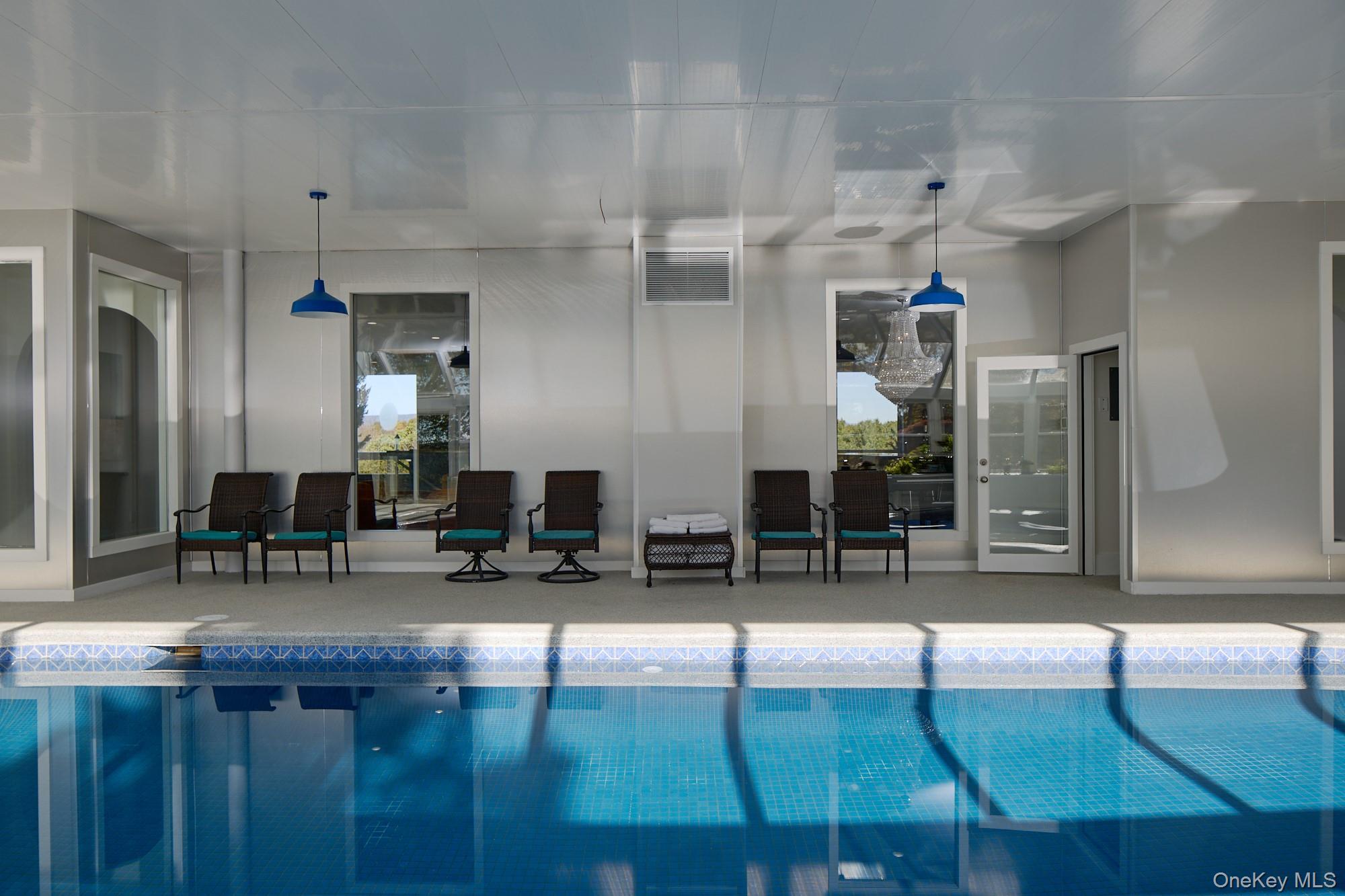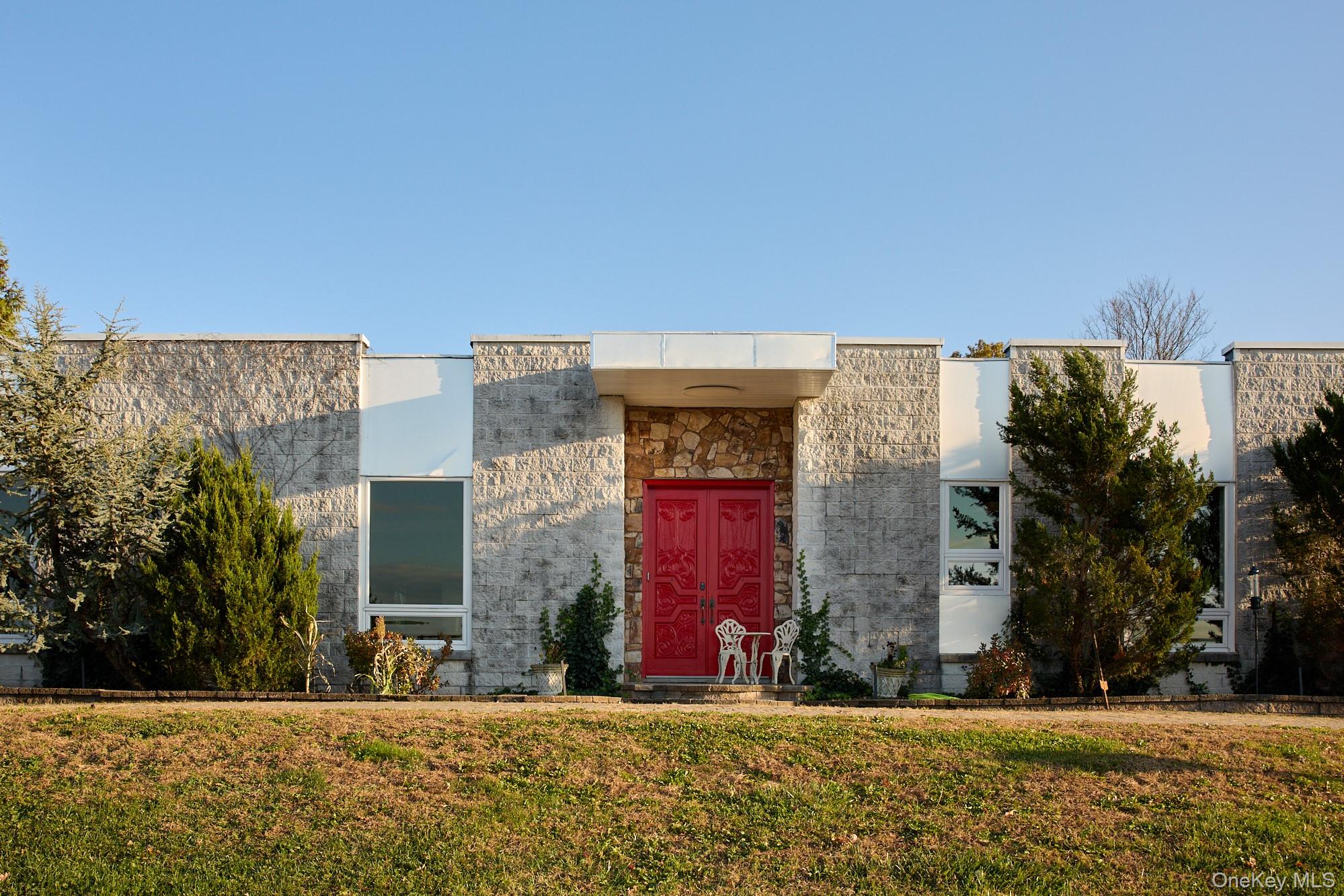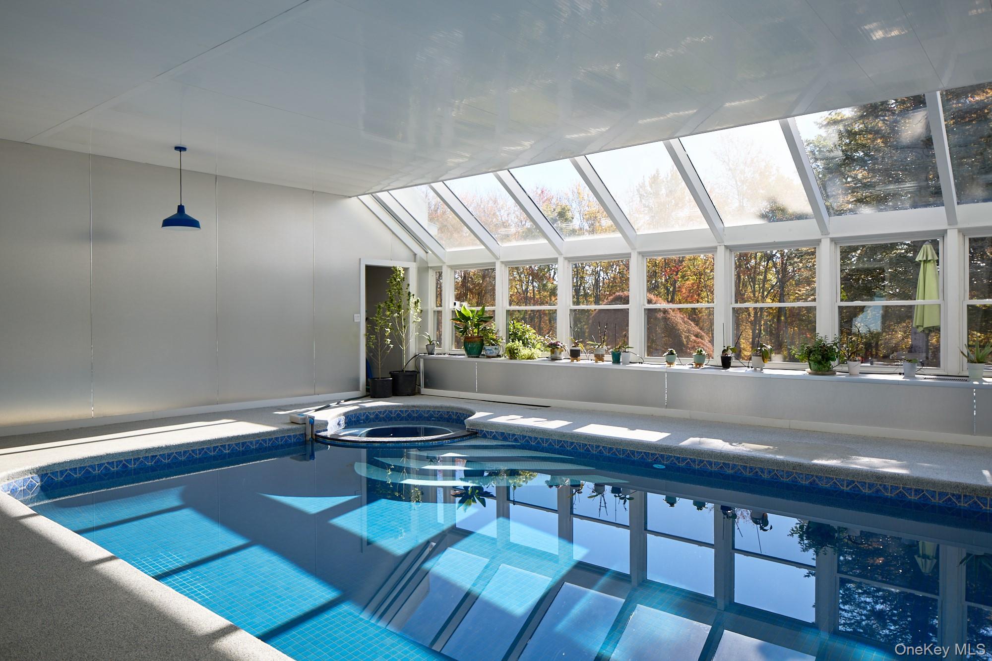 Palatial and modern, this flat roof contemporary on 7. 4 manicured acres is truly one of a kind: private and spacious, with an indoor pool and spa, outdoor pool, and mountain views. The property has been thoughtfully landscaped with a style mirroring the home's structure--formal and balanced. Beautiful sights abound, gazing over the extensive lawns to the west and bucolic stone walls lining a neighboring field. Inside, the minimalist structure of this home provides a backdrop for a recent renovation which has brought all systems and finishes to flawless function and condition. There are polished concrete floors throughout the generous open floor plan, sky lights, expansive windows, and large fixed pane windows streaming sunlight from the pool area. For relaxation and exercise year-round, the indoor pool room is a sunny haven, with greenhouse style windows, a beautifully tiled indoor pool with integrated spa, enclosed shower, and seating area. A slider leads to a lovely outdoor dining patio area with a stone fire pit, and grassy lawn leading down to the fenced inground pool and gazebo. Both pools are saline treated, offering silky water and better air quality than traditional chlorine. The primary bedroom looks out to the peaceful koi pond garden with waterfall--very retreat-like--and opens to a sunroom with wood panelling and access to the patio. The ensuite bathroom is luxurious--soaking tub, rainfall shower, two toilet/bidet rooms--and leads to the full walk-in closet/dressing room. Industrial size and style define the kitchen, where one can truly cook for a crowd using the Vulcan 6 french plate and 24" griddle cooktop, double oven, commercial vent hood, Fagor dishwasher, three-compartment sink and disposal, and commercial fridge/freezer combo. The clean lines of the double height pantry enclose cabinets and drawers, and the oversized stainless steel island offers storage, a retractable center power outlet, and a leathered black granite top. Huge windows and dreamy views of the mountains make the kitchen a sweet place to linger over a cup of coffee. A beautiful stone fireplace draws the eye in the den, currently used as a game room, which can be closed from the main living area with a sliding door. Two additional, spacious bedrooms each with a full bathroom, round out the main level floor plan. The glass and steel staircase lead to the lower level, which includes an additional bedroom with ensuite bathroom, laundry room, second full bathroom, and a large recreation room currently housing a luxury car collection. A convenient private entrance and 2-car garage on this level open to a large finished parking area. Nest thermostats control the home's hybrid heating and cooling system to maintain comfort in every season. Luxuriously lit throughout, you'll find gorgeous chandeliers, fun aqua colored pool lights, and newly installed LED light fixtures with Lutron dimmers for precise control. Exterior lighting has been updated with LED driveway lights and bronze garden fixtures. This is a Hudson Valley home like no other - sited in proximity to colorful local towns like New Paltz, local apple farms and wineries, hiking and recreation in the Gunks, and 75 miles to NYC.