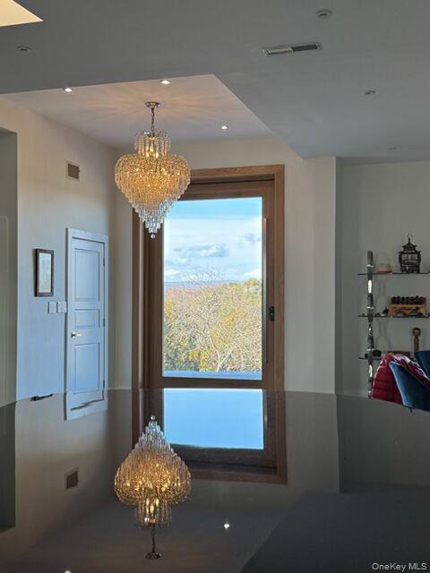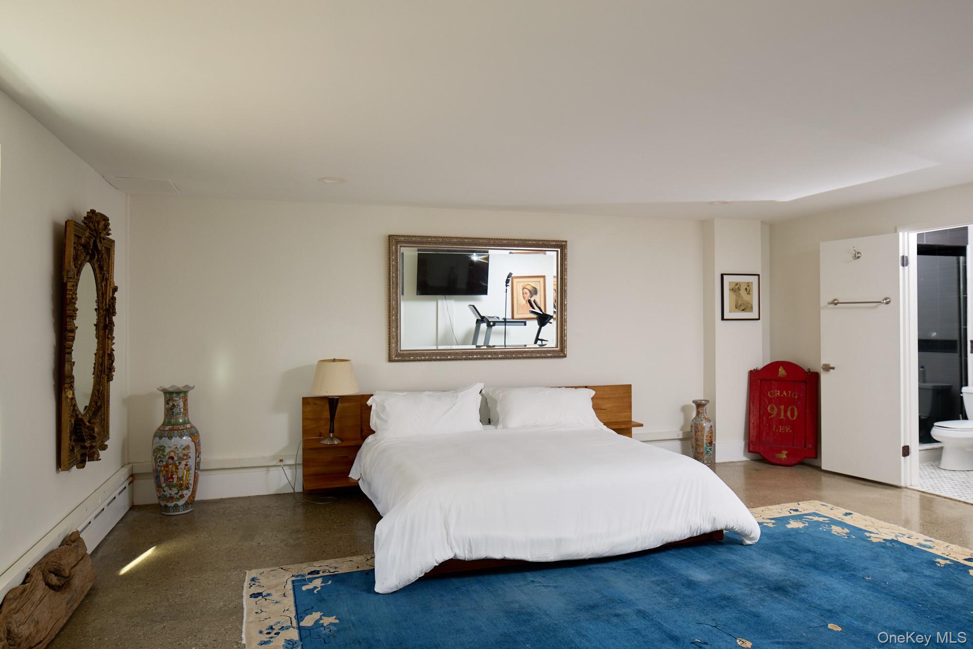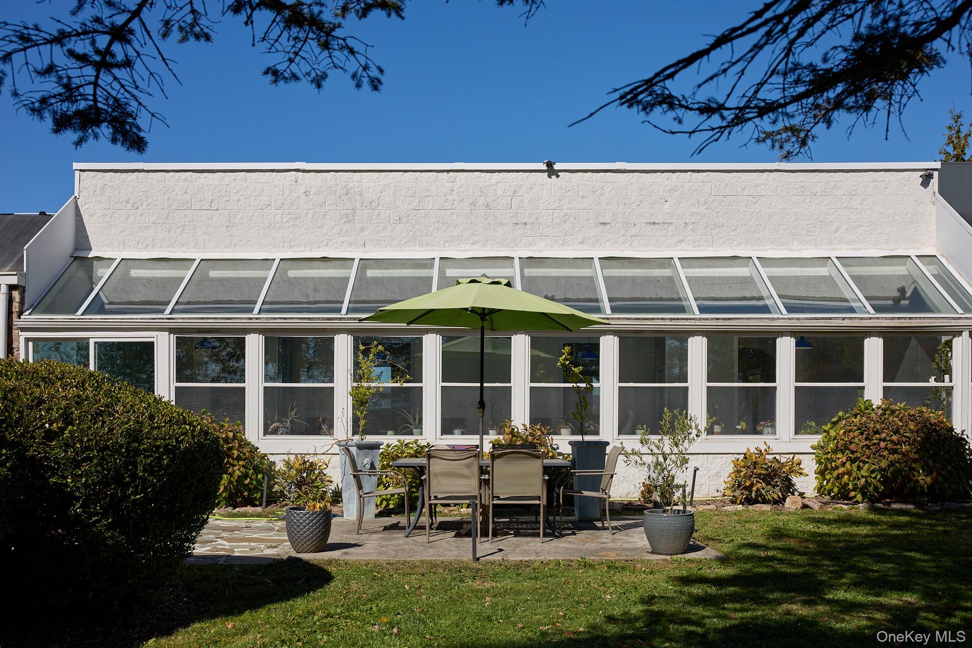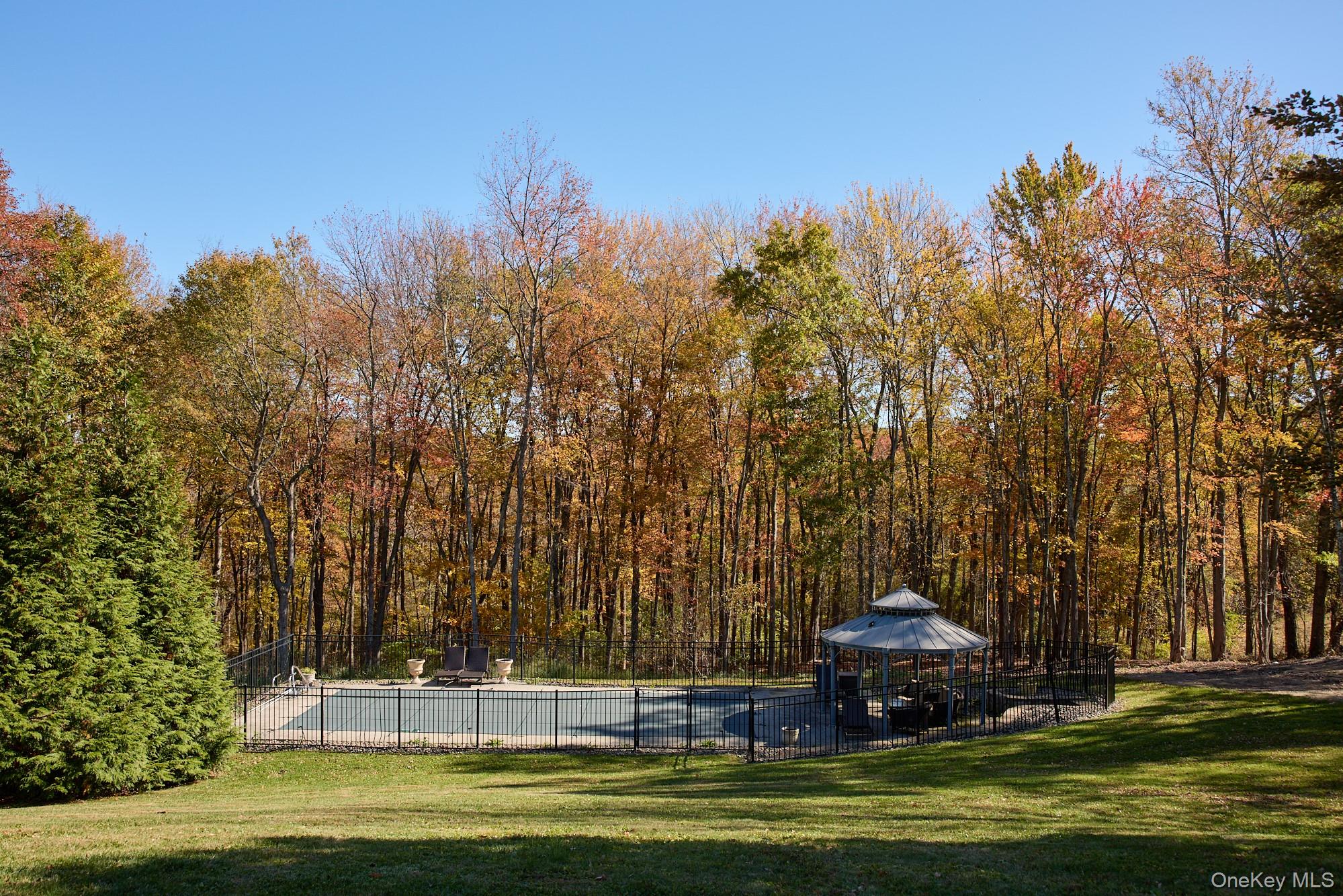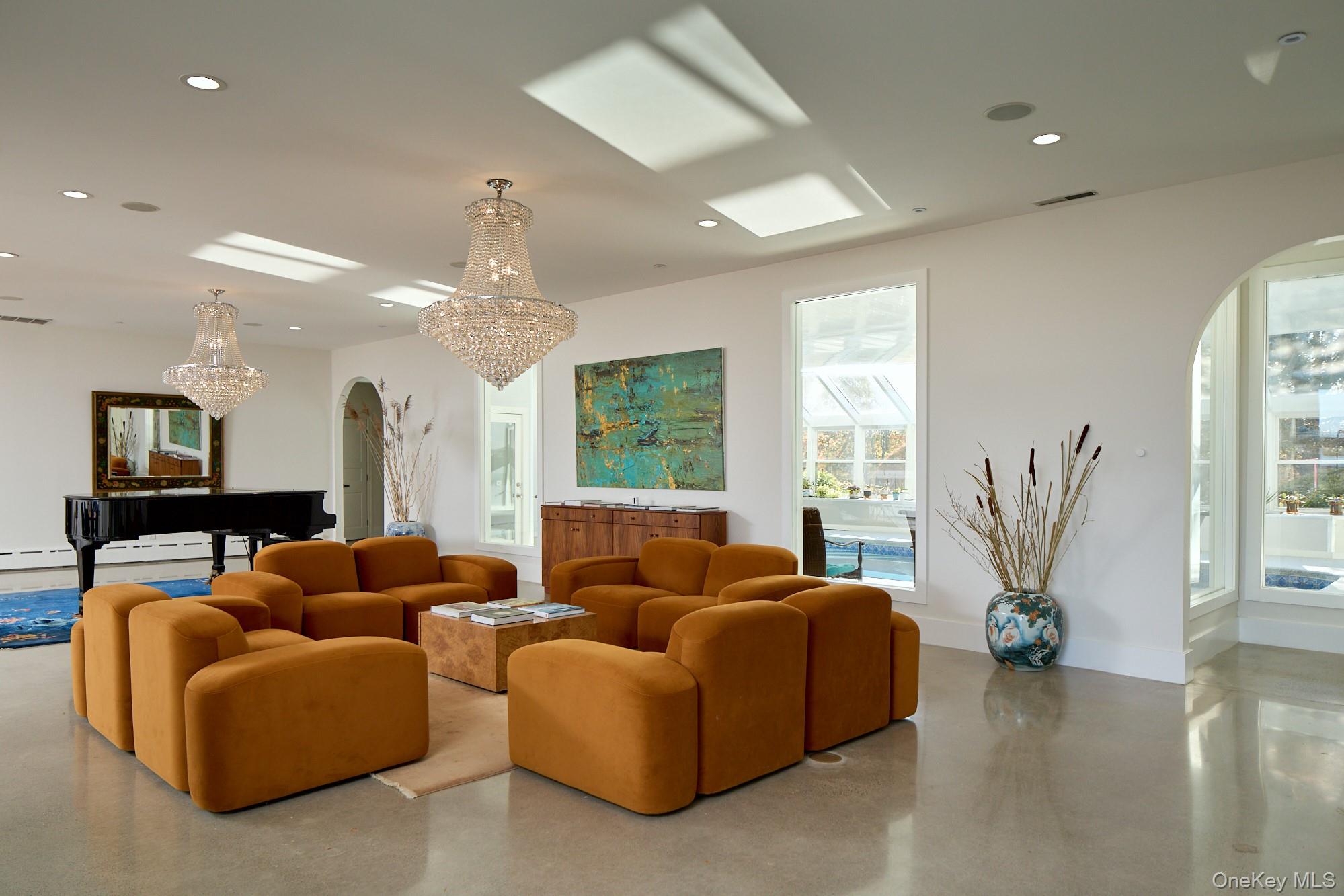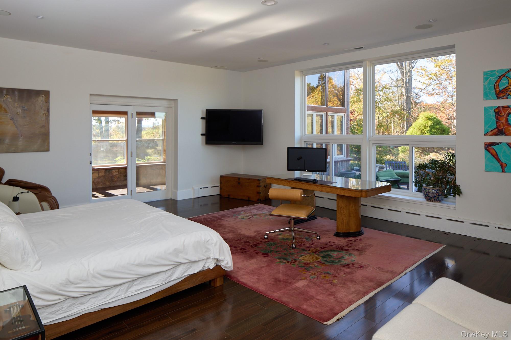 Palatial and modern, this flat roof contemporary on 7. 4 manicured acres is truly one of a kind: private and spacious, with an indoor pool and spa, outdoor pool, and mountain views. The property has been thoughtfully landscaped with a style mirroring the home's structure--formal and balanced. Beautiful sights abound, gazing over the extensive lawns to the west and bucolic stone walls lining a neighboring field. Inside, the minimalist structure of this home provides a backdrop for a recent renovation which has brought all systems and finishes to flawless function and condition. There are polished concrete floors throughout the generous open floor plan, sky lights, expansive windows, and large fixed pane windows streaming sunlight from the pool area. For relaxation and exercise year-round, the indoor pool room is a sunny haven, with greenhouse style windows, a beautifully tiled indoor pool with integrated spa, enclosed shower, and seating area. A slider leads to a lovely outdoor dining patio area with a stone fire pit, and grassy lawn leading down to the fenced inground pool and gazebo. Both pools are saline treated, offering silky water and better air quality than traditional chlorine. The primary bedroom looks out to the peaceful koi pond garden with waterfall--very retreat-like--and opens to a sunroom with wood panelling and access to the patio. The ensuite bathroom is luxurious--soaking tub, rainfall shower, two toilet/bidet rooms--and leads to the full walk-in closet/dressing room. Industrial size and style define the kitchen, where one can truly cook for a crowd using the Vulcan 6 french plate and 24" griddle cooktop, double oven, commercial vent hood, Fagor dishwasher, three-compartment sink and disposal, and commercial fridge/freezer combo. The clean lines of the double height pantry enclose cabinets and drawers, and the oversized stainless steel island offers storage, a retractable center power outlet, and a leathered black granite top. Huge windows and dreamy views of the mountains make the kitchen a sweet place to linger over a cup of coffee. A beautiful stone fireplace draws the eye in the den, currently used as a game room, which can be closed from the main living area with a sliding door. Two additional, spacious bedrooms each with a full bathroom, round out the main level floor plan. The glass and steel staircase lead to the lower level, which includes an additional bedroom with ensuite bathroom, laundry room, second full bathroom, and a large recreation room currently housing a luxury car collection. A convenient private entrance and 2-car garage on this level open to a large finished parking area. Nest thermostats control the home's hybrid heating and cooling system to maintain comfort in every season. Luxuriously lit throughout, you'll find gorgeous chandeliers, fun aqua colored pool lights, and newly installed LED light fixtures with Lutron dimmers for precise control. Exterior lighting has been updated with LED driveway lights and bronze garden fixtures. This is a Hudson Valley home like no other - sited in proximity to colorful local towns like New Paltz, local apple farms and wineries, hiking and recreation in the Gunks, and 75 miles to NYC.