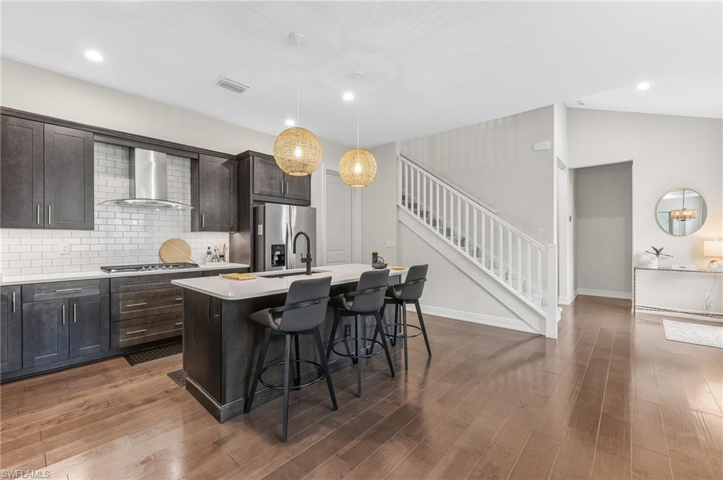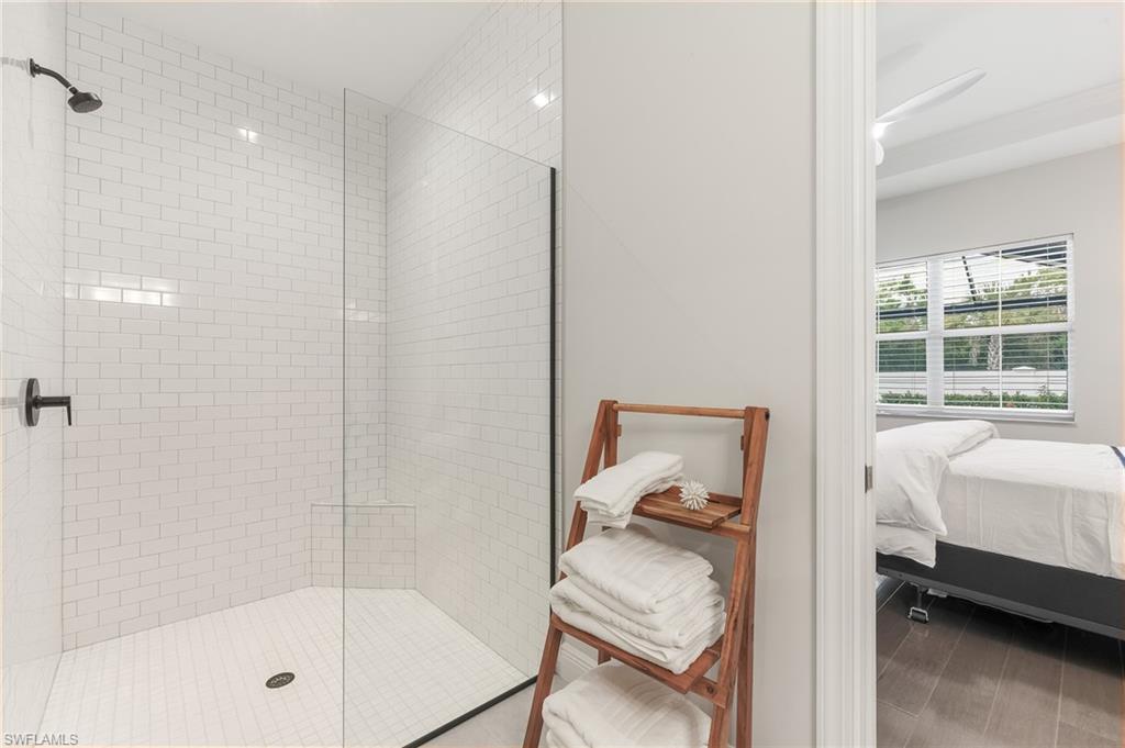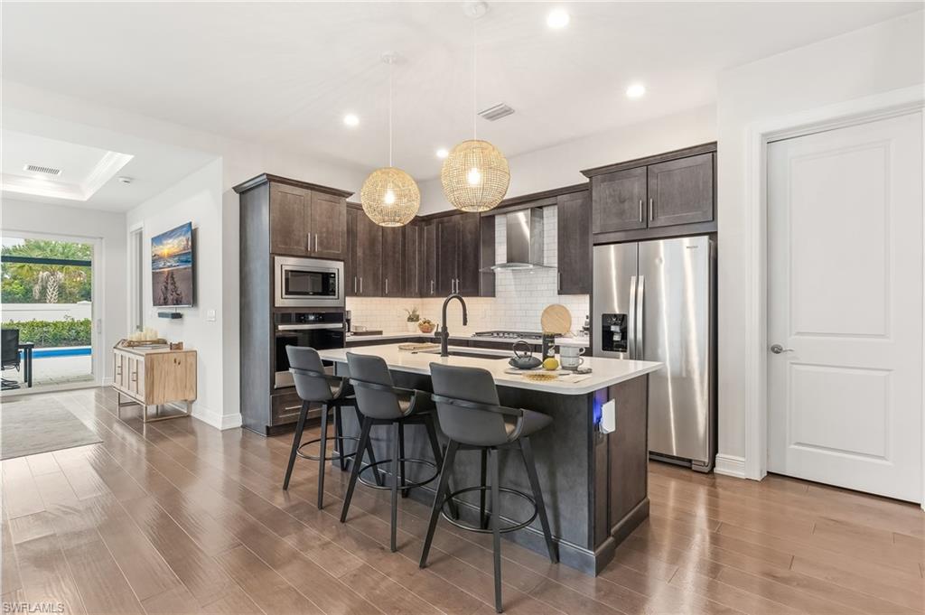 Step through the custom front door and you’re greeted by an open, thoughtfully designed floor plan with views of the newly installed pool and spa. The first floor features warm wood flooring throughout, creating a welcoming and sophisticated atmosphere. The chef’s kitchen is a showstopper, complete with a counter-height quartz island, custom wood cabinetry, upgraded stainless steel appliances including a gas range, and a walk-in pantry. A sleek glass backsplash and custom stainless hood add a touch of contemporary elegance. The kitchen seamlessly opens to the dining and spacious living area—ideal for entertaining family and friends. The primary suite offers serene views of the pool and includes an upgraded en-suite bath with quartz countertops, a frameless glass shower, and a large walk-in closet. A guest bedroom and full bath are also conveniently located on the main level.