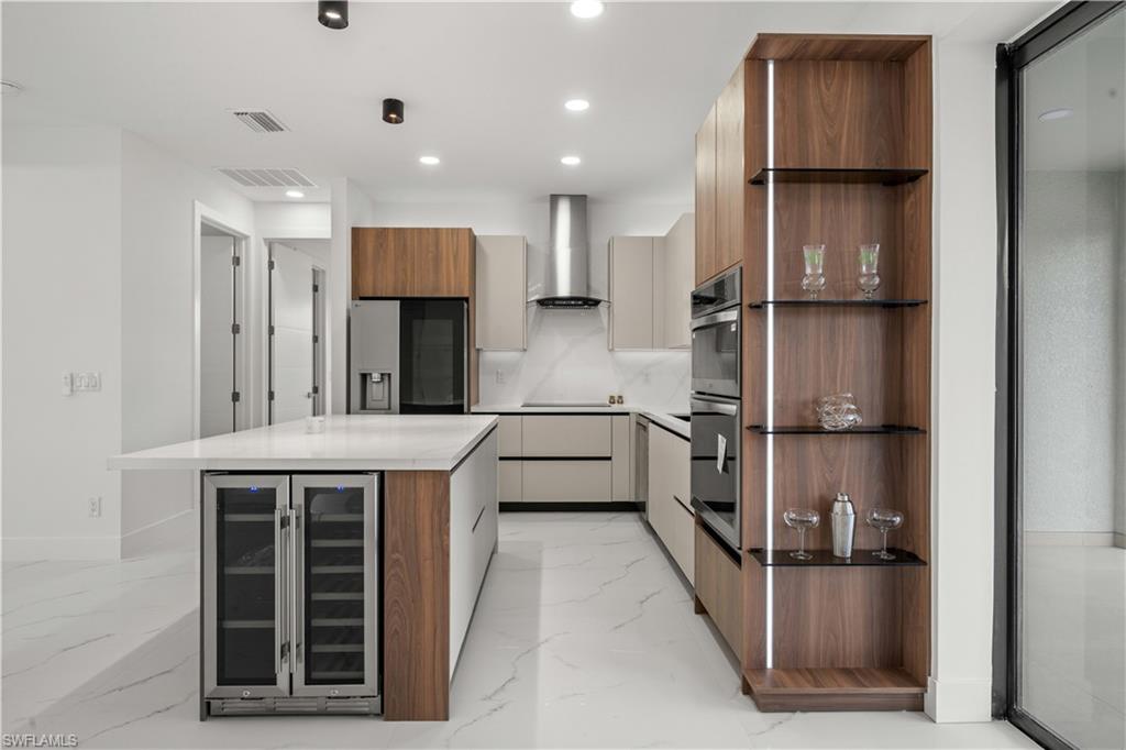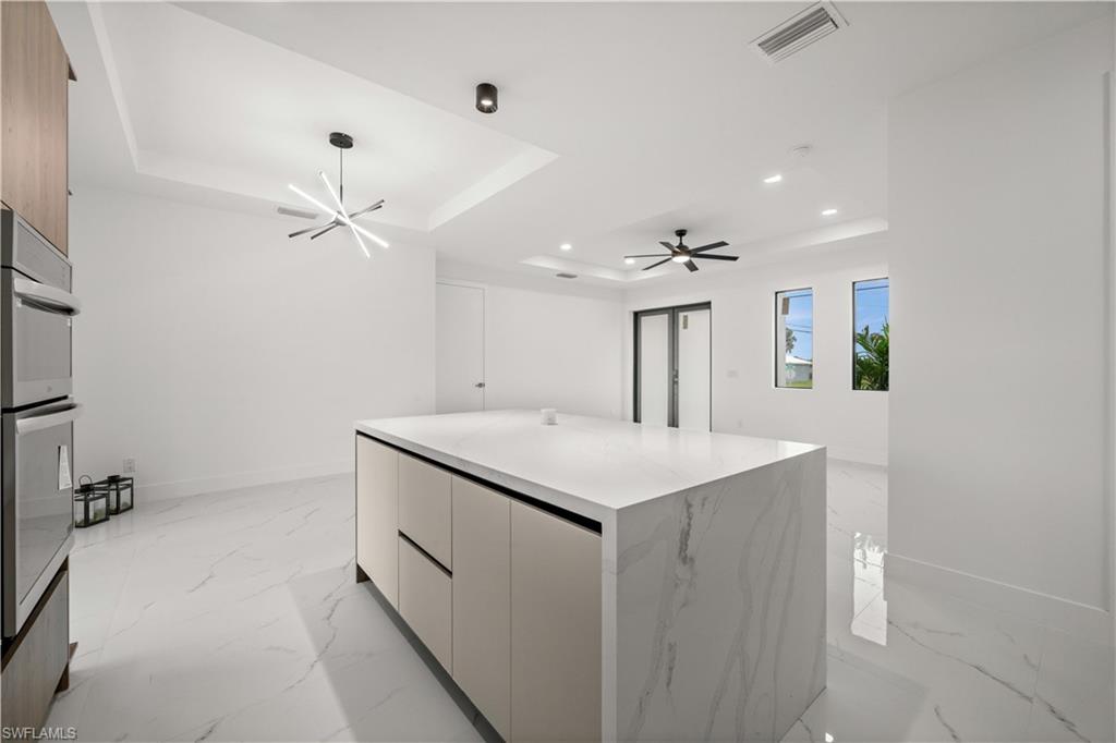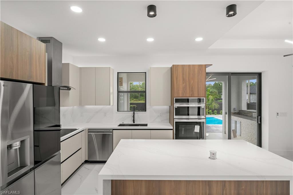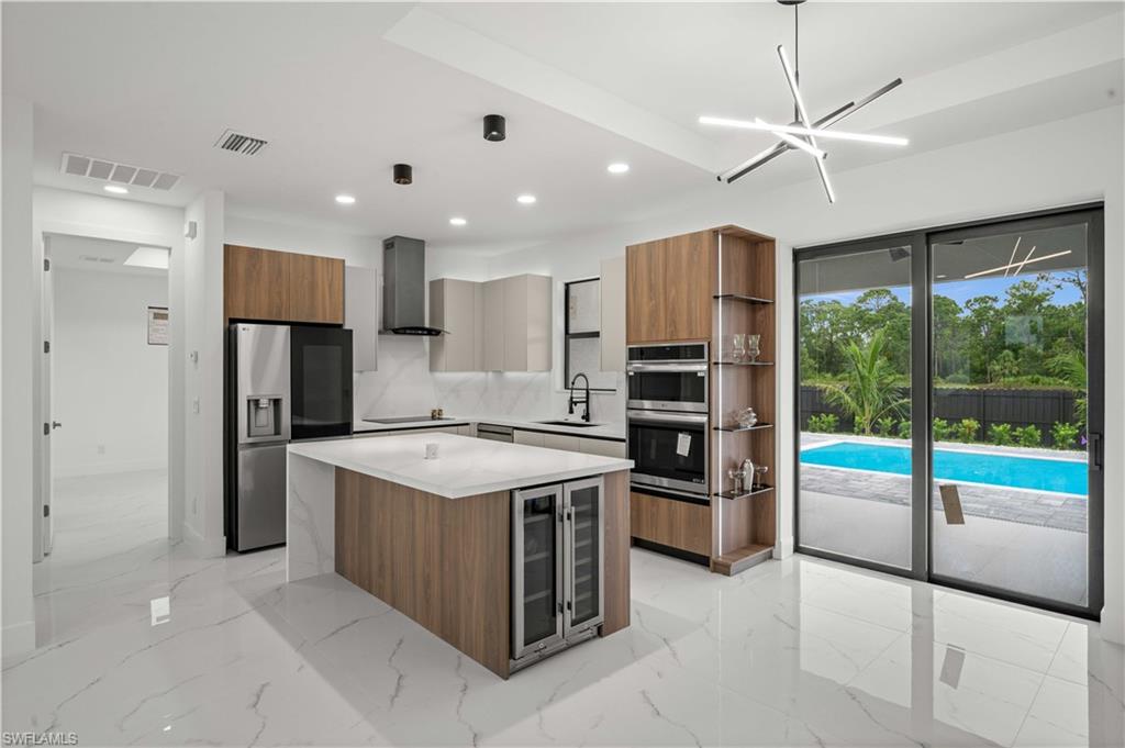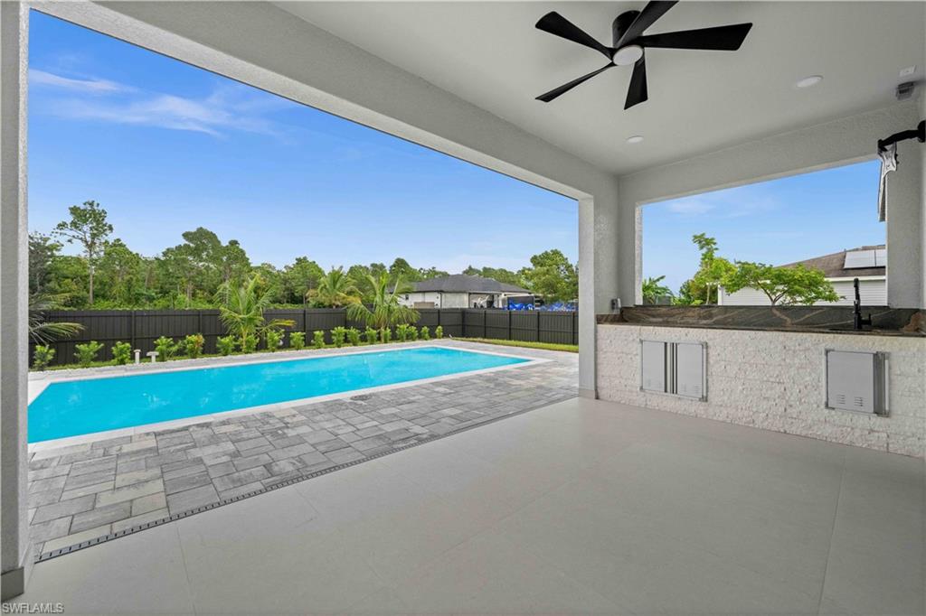 Welcome to the "Moonstone" Model. This amazing home is the perfect blend of value, comfort, luxury, style, and security. This beautiful new construction is built for everyone who wants to live with all the comforts of 'home. ’ Impact windows and doors, European style kitchen featuring soft closing cabinet doors, drawers and Bloom hardware, high-end appliances, double oven, hood, cooktop, wine cooler, and much more. Master bedroom with custom designed built in walk-in closet, master en-suite with glass shower enclosure, double vanity, and linen closet. Two spacious bedrooms with walk-in closets, guest bathroom with glass shower enclosure. Home offers open concept layout with 10-foot-high interior ceilings, 8-foot-high designer doors. Outdoor kitchen with marble countertops and 1/2 bath by the pool, ready for enjoyment 12' x 24' beautiful pool with Sun Ledge, 2 car garage, washer, dryer, and laundry sink. "NO FLOOD INSURANCE NEEDED". Engulf in the multitude of upscale details that you must see to appreciate. Enjoy your day by the pool or explore everything Cape Coral has to offer. Do not miss out on this one-of-a-kind opportunity! Schedule your showing today and make this beauty your home!