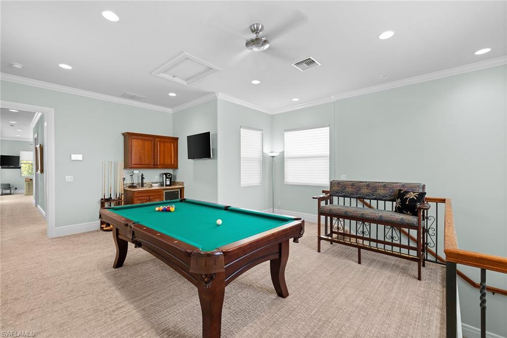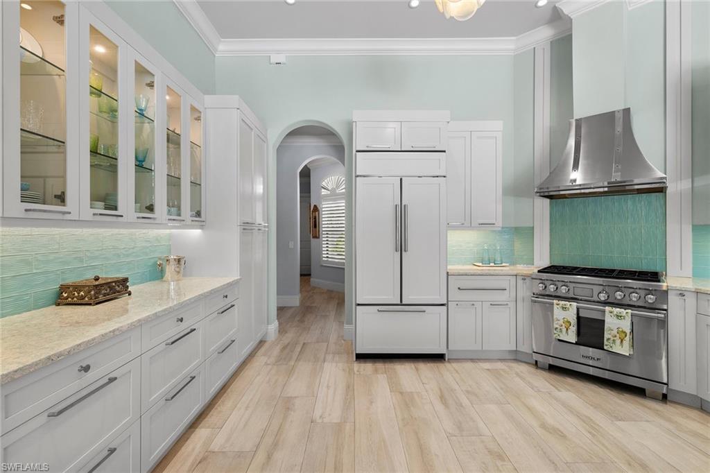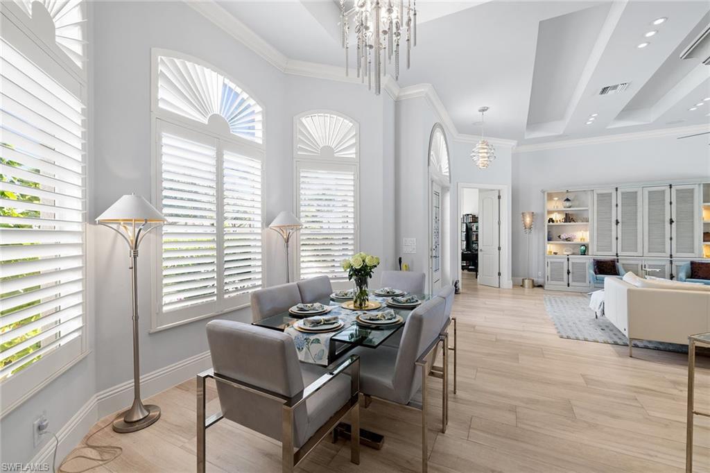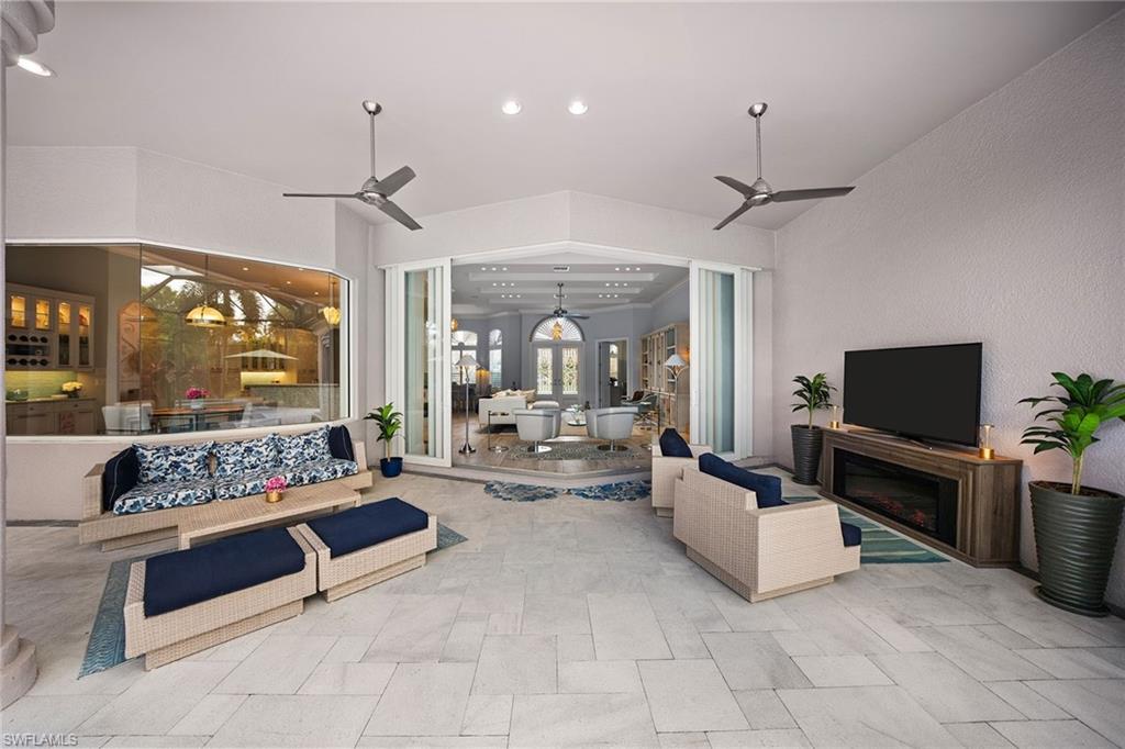 Enjoy elegance at its finest in this custom-built estate home on a quiet cul-de-sac within The Classics neighborhood, a gated, 24-hour security-protected community, in Lely Resort. On one of the largest lots in the neighborhood, this home features a grand circular driveway with abundant parking for guests. French beveled glass doors invite entry into a light-filled open floor plan with soaring 14-foot ceilings, custom crown molding, chandeliers, and plantation shutters with Sunburst arches that create an atmosphere of timeless sophistication. The ambiance of the bright Florida Coastal design (2015 complete house renovation) blends luxury and livability with views of the lanai, pool, palm trees and 17th Fairway of The Classics Golf Club. The kitchen showcases quartz waterfall counters, glass-tile backsplash, custom cabinetry, Wolf dual-range stove/oven, Sub-Zero refrigerator, Bosch dishwasher, two built-in pantries, a Butler’s Nook, and new Ca’Lefort wine cooler. A versatile upstairs, enhanced throughout with new carpeting, introduces a double owner's suite including a fourth bedroom (used as an office), a full bath, walk-in closet, spacious sitting/game room and private balcony. Two first-floor guest en suites include built-in cabinetry with custom storage, while the primary suite serves as a retreat, featuring crown molding, a soaking tub, a large shower with body jets and a custom Carrera-tile double vanity. The screened lanai offers a private sanctuary featuring a gas-heated pool and spa, lush landscaping, and multiple seating areas ideal for quiet relaxation or entertaining (with 15 in-ceiling speakers ready for surround sound and multi-room zone audio). Upgrades in 2020 include a new roof, new driveway and walkway pavers, new lanai deck, and new pool and spa resurfacing. Membership opportunities abound, with no waitlist at The Classics Golf Club, which offers access to three championship golf courses (two public, one private) and optional Players Club membership offering tennis, bocce, dining, wellness center, spa and three resort-style pools. This exceptional estate harmonizes luxury, lifestyle and location, a rare opportunity to experience the best of Lely Resort and Naples living.