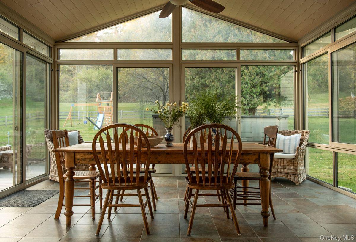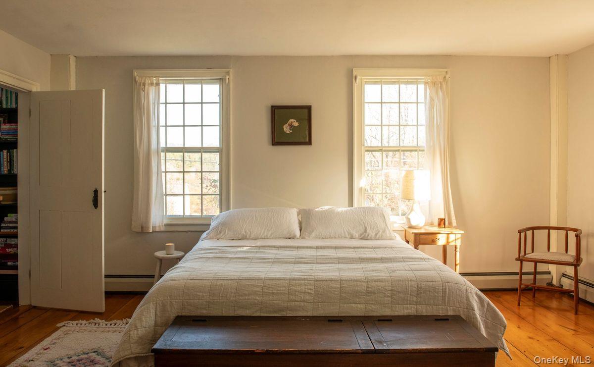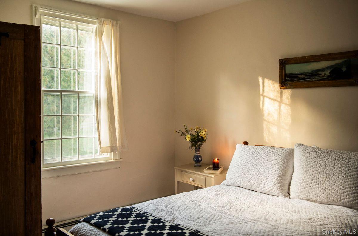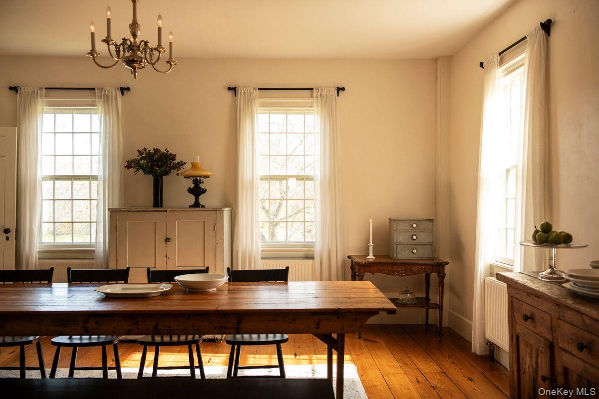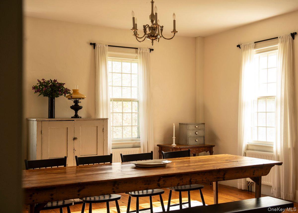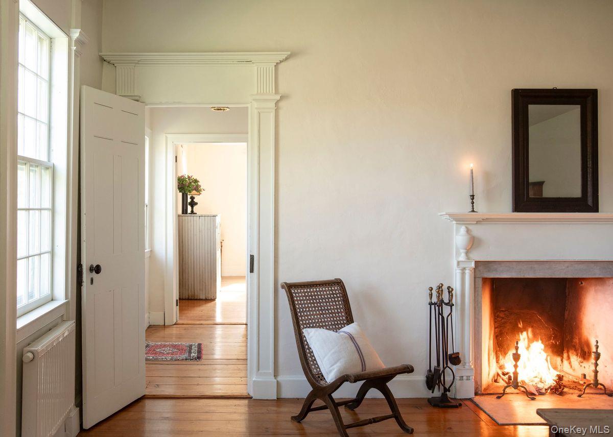 Said to be Hillsdale's second oldest home, this historic c1788 Shaker built center chimney Colonial sits on 17 acres of sprawling green hillside, gardens, and fruit trees. Once the home of Captain John Collin III, the home sits along the beautiful corridor connecting the Hudson Valley and the Berkshires— an area characterized by its rolling hillsides and rural landscape. Meticulously restored, you’ll find fabulous period details such as original 12-over-12 wavy glass windows with custom storms, beautiful curved walls, hand hewn beams and old growth pine floors. Enormous slabs or marble make up the front steps & foundation walls. You’ll find wonderfully high ceilings for a house of this age, and a four season sunroom with radiant heated floors & AC. Despite its formal proportions the house lives comfortably, the kitchen opens to a lovely seating area with a wood burning fireplace, undoubtedly the room you’ll spend most of your time in. There are two additional, large sitting/dining areas on the first floor, a mudroom & powder room. Upstairs, you’ll find five bedrooms, some large & lightfilled and others charming & petite, and two full baths including an ensuite in the primary. Outside, the 17 acres are comprised of woods and meadow, there is a fenced in garden with ten raised beds & a garden shed, heirloom varieties of apples, peaches and pears. A trail meanders through the woods. There is a full house generator. An early home with pedigree, you are just 15m to Great Barrington, 20m to Hudson, and under 2. 5h from NYC.