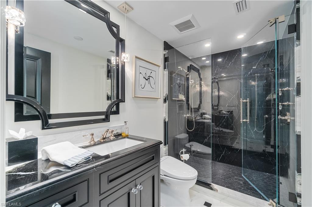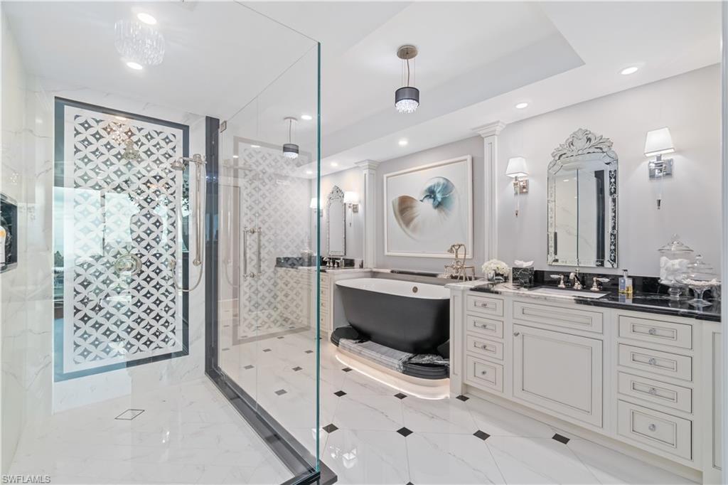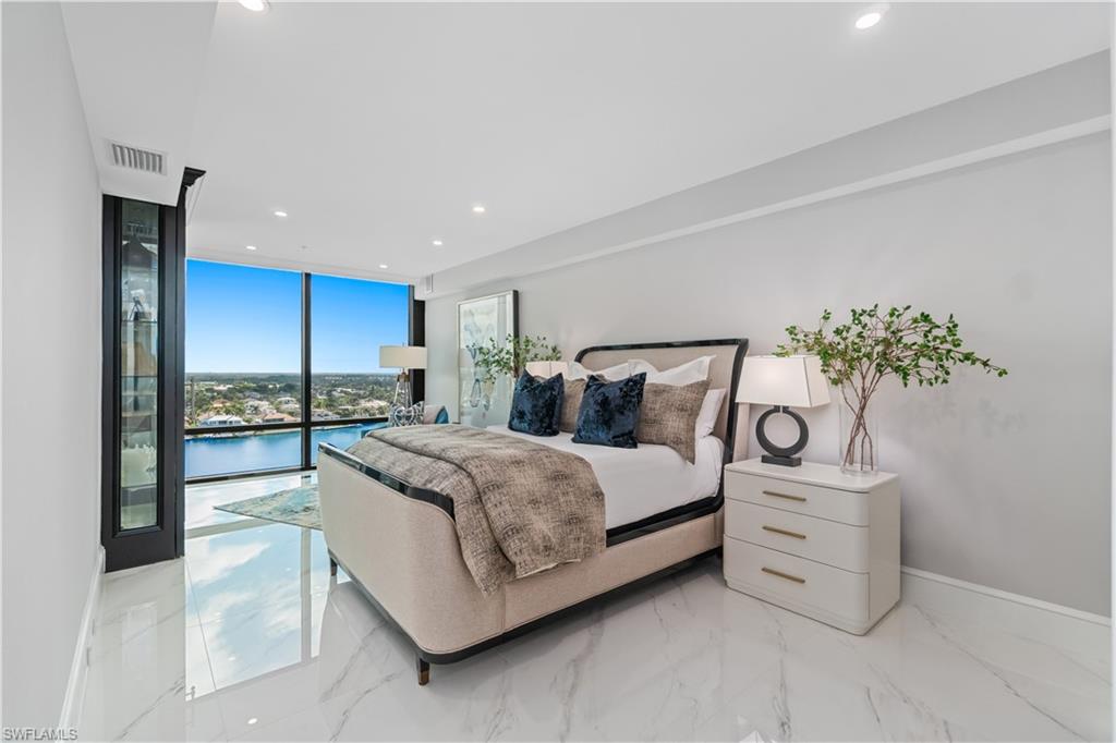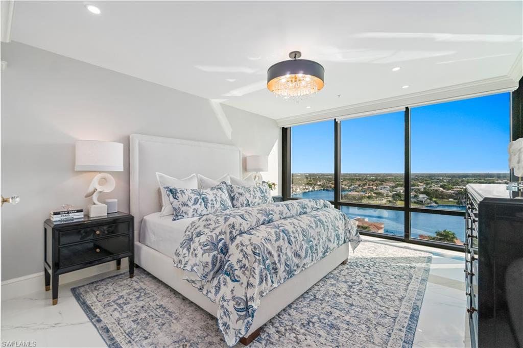 Positioned within Le Ciel Venetian Tower in prestigious Park Shore, this sophisticated residence showcases sweeping views of Venetian Bay, where mornings unfold in soft sunrise hues and evenings glow with the shimmer of city lights. Designed with elegance and intention, the two-bedroom plus den layout offers over 2, 500 square feet and is furnished in refined luxury, featuring a comprehensive renovation distinguished by craftsmanship and attention to detail. The open kitchen centers around an impressive entertaining island, complemented by custom Conestoga cabinetry and state-of-the-art Miele appliances. Inalco tile flooring flows throughout, enhanced by designer lighting fixtures, a striking fireplace in the living room, custom window coverings, and impact-rated windows. The serene primary suite offers custom walk-in closets with dual wall safes and a spa-inspired bath, creating a retreat of comfort and style. Additional highlights include a whole-home water filtration system, one deeded parking space, and private storage. Residents of Le Ciel Venetian Tower enjoy gated entry, on-site management and security, a beachfront pool and spa, tennis courts, a fitness center with sauna and steam rooms, two guest suites, a social room, BBQ area, and direct beach access all just moments from The Village on Venetian Bay, the Park Shore Promenade, and the Venetian Bay Yacht Club.