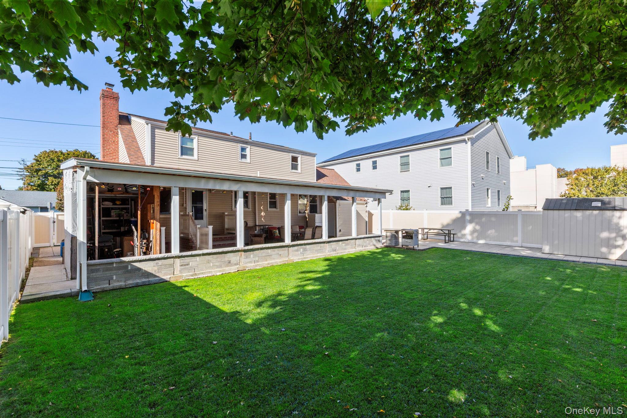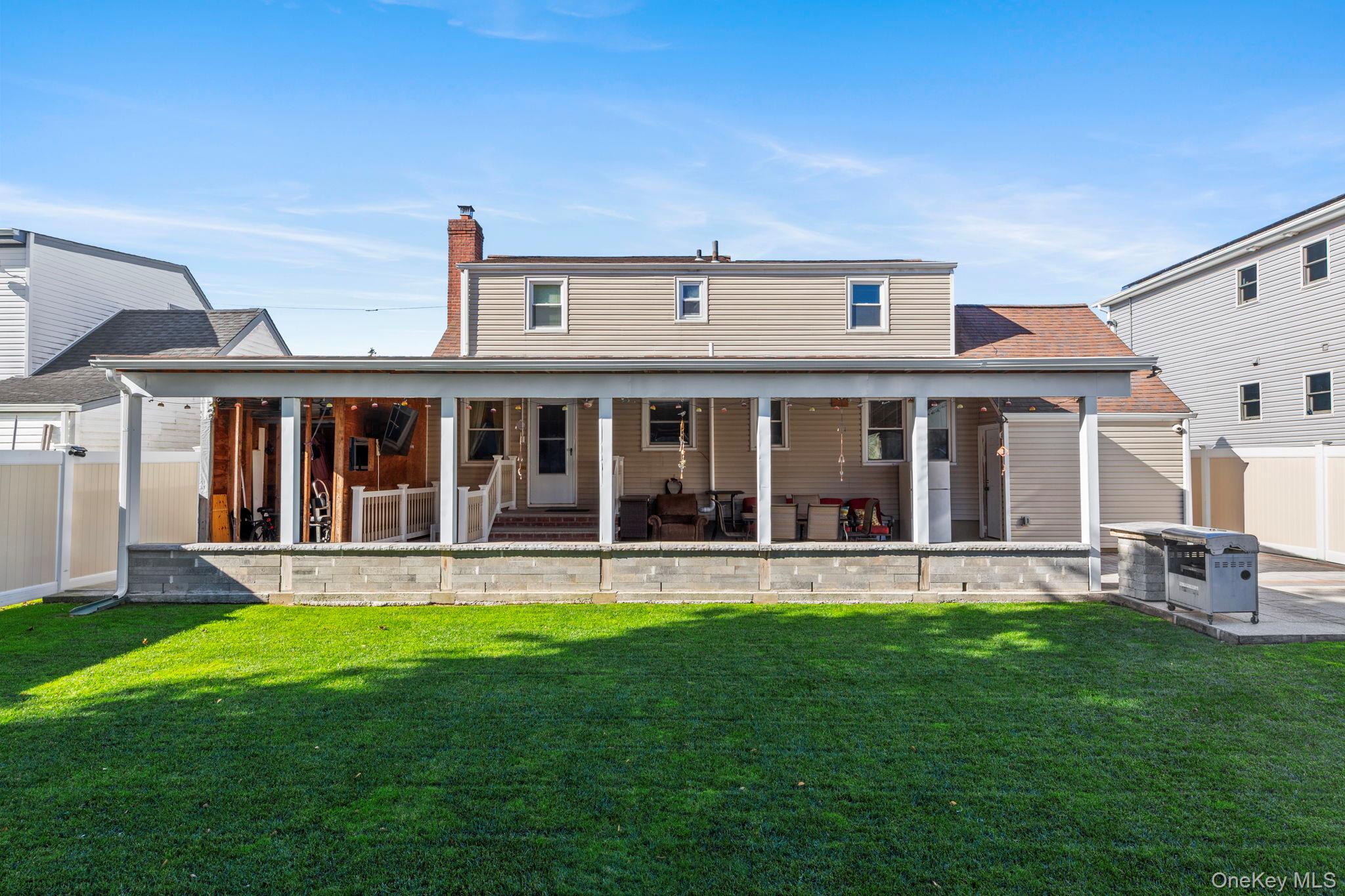 Spacious expanded cape with 4 large spacious bedrooms, open kitchen towards Dining Rm, Perfect size Living Rm, Full Bathrooms on each of the 3 floors. Basement has separate entrance, Family Rm, Bathroom, 2 large bonus Rooms. Beautiful curb appeal, backyard is completely PVC Fenced with newly installed pavers, Large beautiful covered patio for those rainy days. 1 Car garage. LOCATION. . . . LOCATION. . . . LOCATION near Hofstra.
