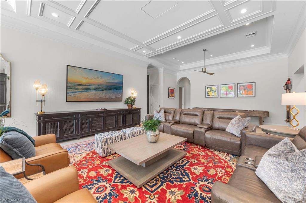 Perfect for entertaining, the home offers a theater room with a 180" screen and starlit ceiling, multiple courtyards, two fireplaces, and expansive outdoor living with a resort-style pool, spa, and outdoor projection TV lounge.