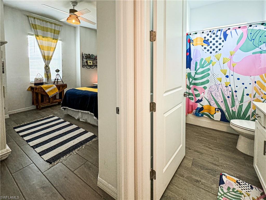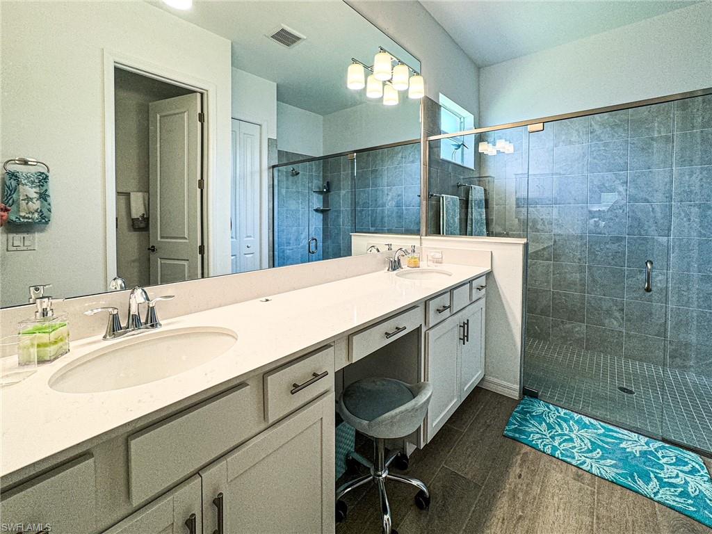 The primary suite serves as a true retreat with a generous walk-in closet and a luxurious en suite bath featuring dual vanities and an oversized shower. The split-bedroom floor plan provides exceptional privacy: one bedroom functions almost as a second primary with its own attached bathroom, while another can be separated by pocket doors for added versatility. The den includes a full closet, making it a great option for a fourth bedroom, guest suite, or home office.