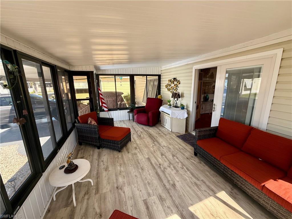 Spacious home with updated kitchen and master bath offered fully furnished! The main living area features warm wood floors, white shaker cabinetry, a spacious living room and an open kitchen/dining area with room for the whole family. This home also features a huge glass and screen front porch and an enclosed rear porch with laundry room and a workbench/shop space. This second “living room” functions as a gathering space, tv area, man cave or home office. Outside you will find a huge double carport with epoxy floor and storm shutters all around the home. Blue Skys is an over 55 resort style community with a full social calendar and amenities like tennis, billiards, pool and a tiki hut.