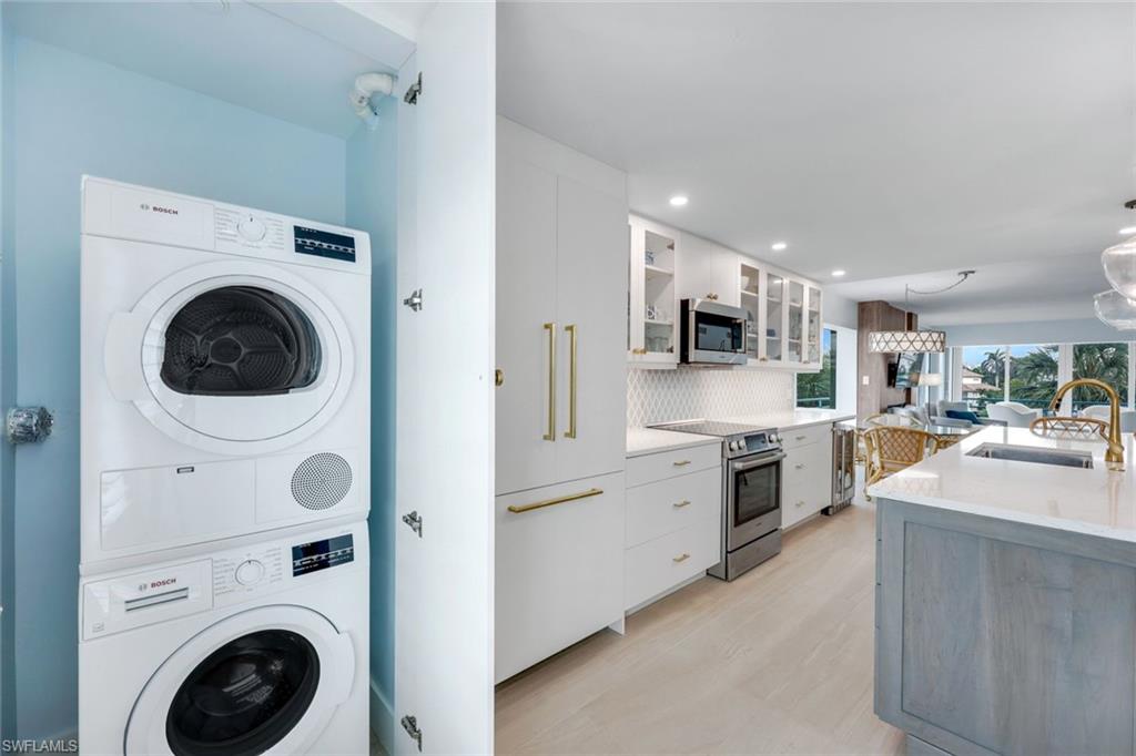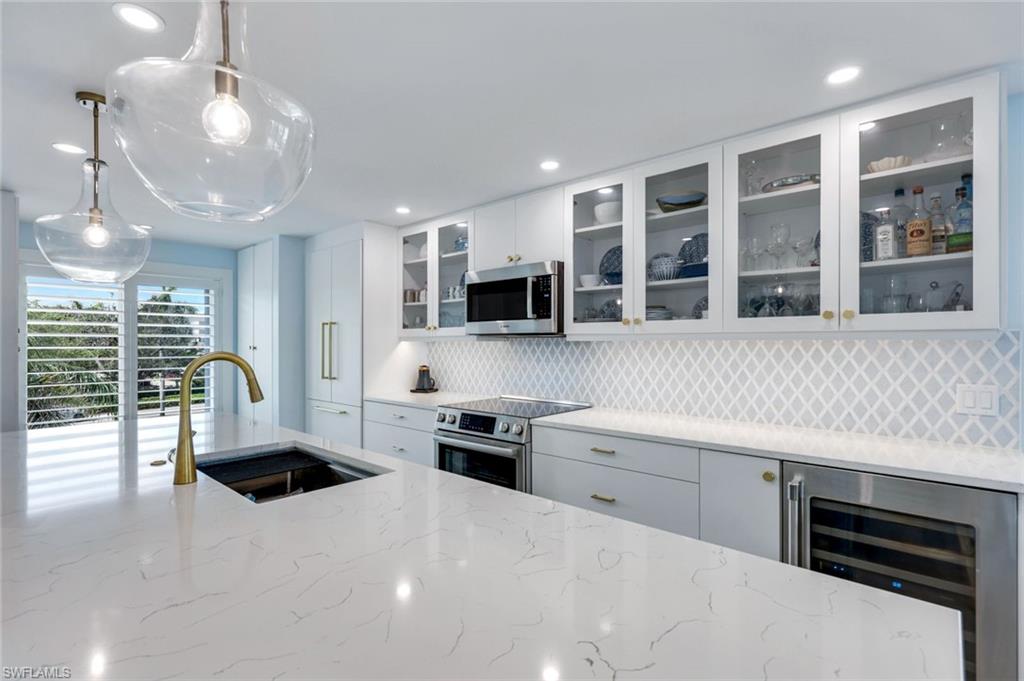 A wonderful opportunity awaits you in the highly sought after area of Park Shore; a sunny, fully remastered jewel complete with high quality finishes and storm protection. The upgraded kitchen includes quartz countertops, large island, copious custom cabinetry and wine cooler . Wood inspired tile floors throughout. Primary bedroom as a beautiful attached bath with oversized shower, double sinks and custom closets. Remote controlled shades and custom screened doors to deck. This residence comes with assigned nearby covered parking, and large adjacent storage. Park Shore Landings has a rentable guest suite for overflow guests. There is an opportunity to purchase or lease a boat dock, or boat rentals available at Venetian Village marina. The BEST walkable neighborhood in Naples, with Venetian Village literally steps away, offering many options for dining and boutique shopping. Also within a short walk is pristine beach, where Park Shore residents are eligible for private beach access with annual membership. It's only a short drive to fabulous 5th Avenue, Waterside Shops and Mercato. !!! LOCATION, LOCATION, LOCATION!!