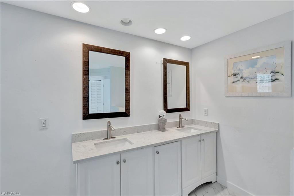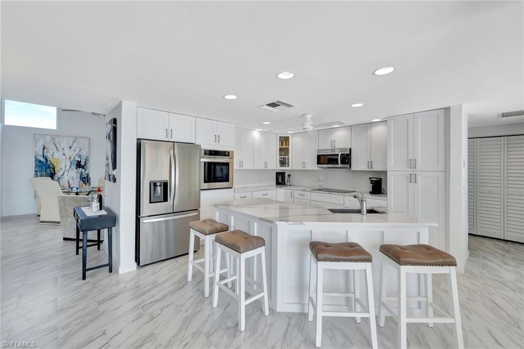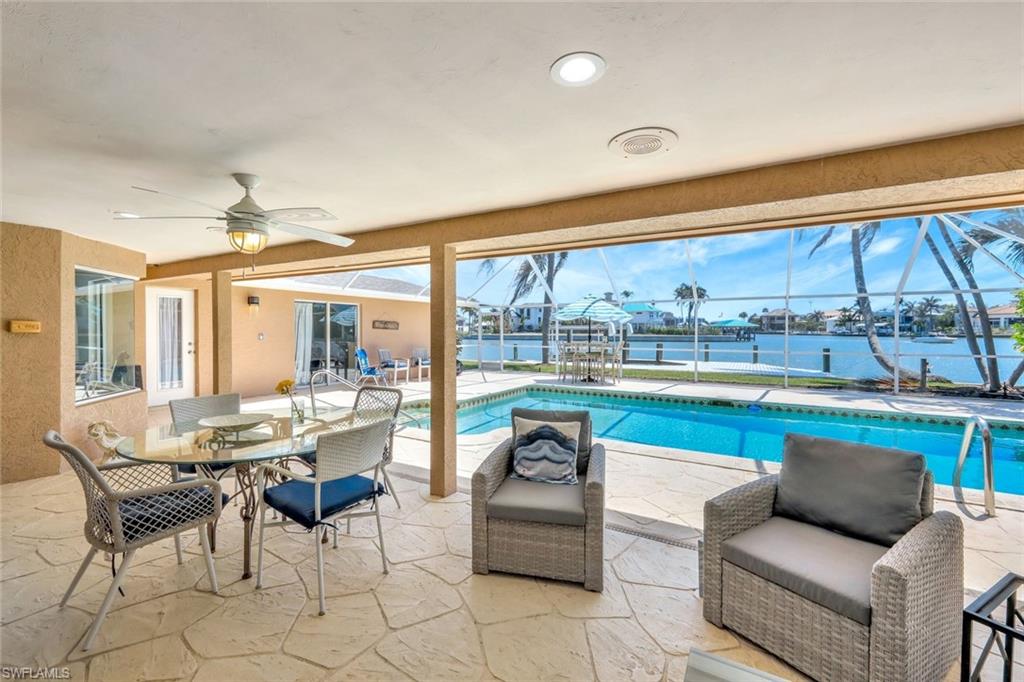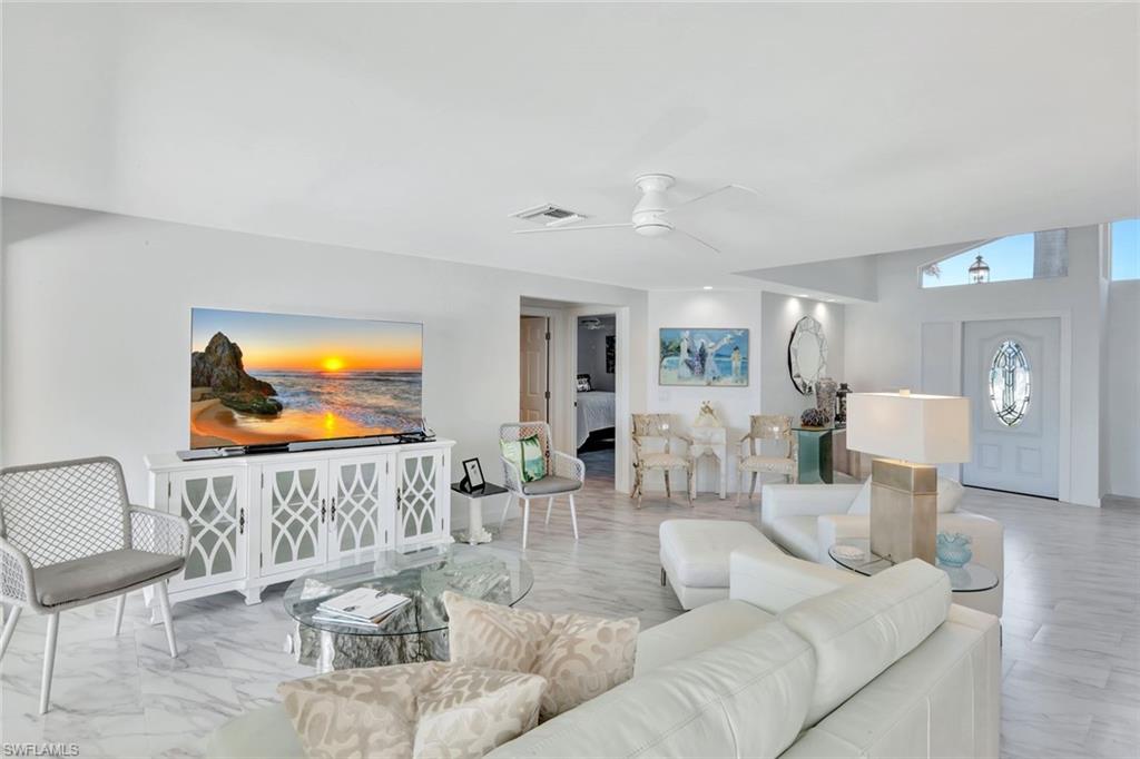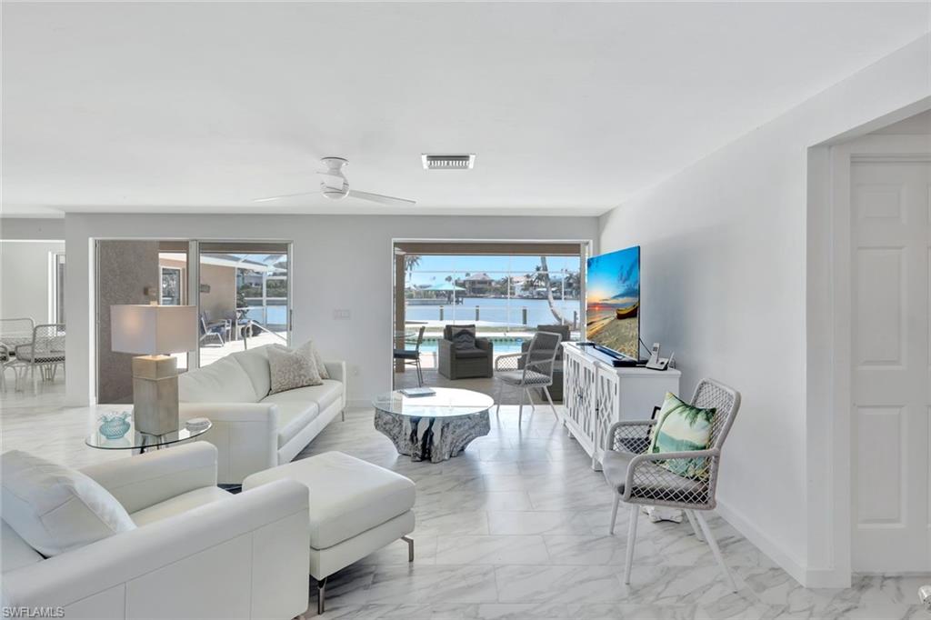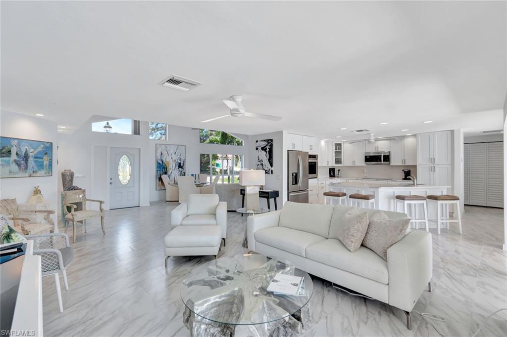 RARE OPPERTUNITY TO PURCHASE A BAY FRONT SOUTHERN EXPOSURE HOME, AND NOT ONLY IS EVERYTHING IN THIS HOME BRAND NEW, BUT WITHOUT A DOUBT IT IS ALL ABOUT THE VIEW!!! If you are lucky enough have the opportunity to call Vanderbilt Beach your home, and you want a very spacious 2344 sq. ft. home with a 2 car garage, complete with boat dock and huge pool, look no further!!! ALL RECONSTRUCTION WAS DONE WITH DURA ROCK CONSTRUCTION. ROOF IS 6 YEARS NEW!!!! Starting with all new ceramic flooring throughout, the dramatic light filled living room is the first to catch your eye and boasts 20 ft. ceilings with angular windows that bring light in the entire day. From the moment you open the new front door, you see directly out to the expansive bay with sparkling water views. This home has water views from every room, and unusual find!! The new kitchen has white cabinets, stainless appliances, Quartzite counter tops, deep sink, faucets and lighting. The Master is unusually large, featuring 2 walk in closets, with a door to the lanai. The large Master bath with extra room to add additional storage is quite rare. The other 2 bedrooms also are spacious, and the 2nd off the lanai features the added den for possible office space. This home is well built, with an 8-year-old roof, which has a guarantee for 25 years, 2 new HVAC's, and new hot water heater, The lanai area is screened in covering a 24 by 26-foot pool. Invite all your friends, they certainly will fit! Your new boat will fit easily in the extra-large dock that has a 10, 000 lb. lift. only a short ride to The Gulf and Wiggins. Close to Mercato, The Ritz, and LaPlaya, and the sugar sand pristine beaches. What is not to like??? And at this price, your new dreams in Paradise can easily come true!!!!!!!!