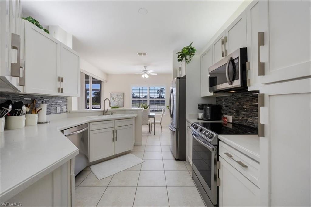 The updated kitchen shines with brand-new cabinetry (2024), stainless steel appliances (2022), new countertops and backsplash, updated flooring, and a new AC system (2025). Other highlights include plantation shutters, electric hurricane shutters, custom closets, epoxy garage floor, and new tile on the lanai. Offered furnished with a few exclusions.