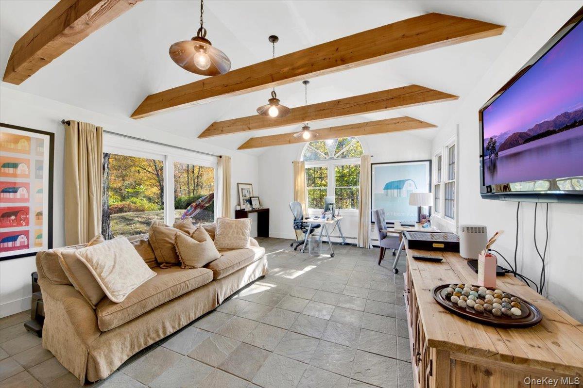 Welcome to 183 McLain Street — a timeless country estate set on over 6 acres of flat, scenic land in the heart of Bedford’s premier estate area! Originally a historic carriage house, this home has been beautifully expanded and updated, blending classic character with modern comfort throughout. The main level features a dramatic two-story living room with cathedral ceilings, a stone fireplace, and walls of windows that open to the backyard patios, perfect for indoor-outdoor entertaining. A chef’s kitchen with high-end appliances connects seamlessly to the formal dining room. The main level also includes a library or formal home office, a spacious rear wing that can serve as a family room, den, or bonus suite with its own private deck, and a main-level bedroom with an ensuite full bath and laundry, ideal for guests or an au pair. Wide-plank maple floors and tons of natural light, radiate throughout the home. Upstairs, the massive primary suite offers a versatile sitting room with fireplace, separate vanity area, custom closets, and access to a covered pergola deck overlooking the scenic backyard. 2-additional Bedrooms, a separate nursery or study, and a 2nd laundry room complete the upper level. Outside, enjoy resort-style amenities including an in-ground heated gunite pool, indoor cabana area with built-in sauna and steam shower, and an expansive landscape ideal for any activity. A 3-car detached garage with extra storage and potential completes the property. This home offers a true country oasis while keeping everything at your fingertips — just minutes to Bedford Village, Metro-North, major highways, less than 15 minutes to Westchester County Airport, and only 50 minutes to NYC, all within the award-winning Bedford School District. 183 McLain — where classic Bedford charm meets modern country living!
